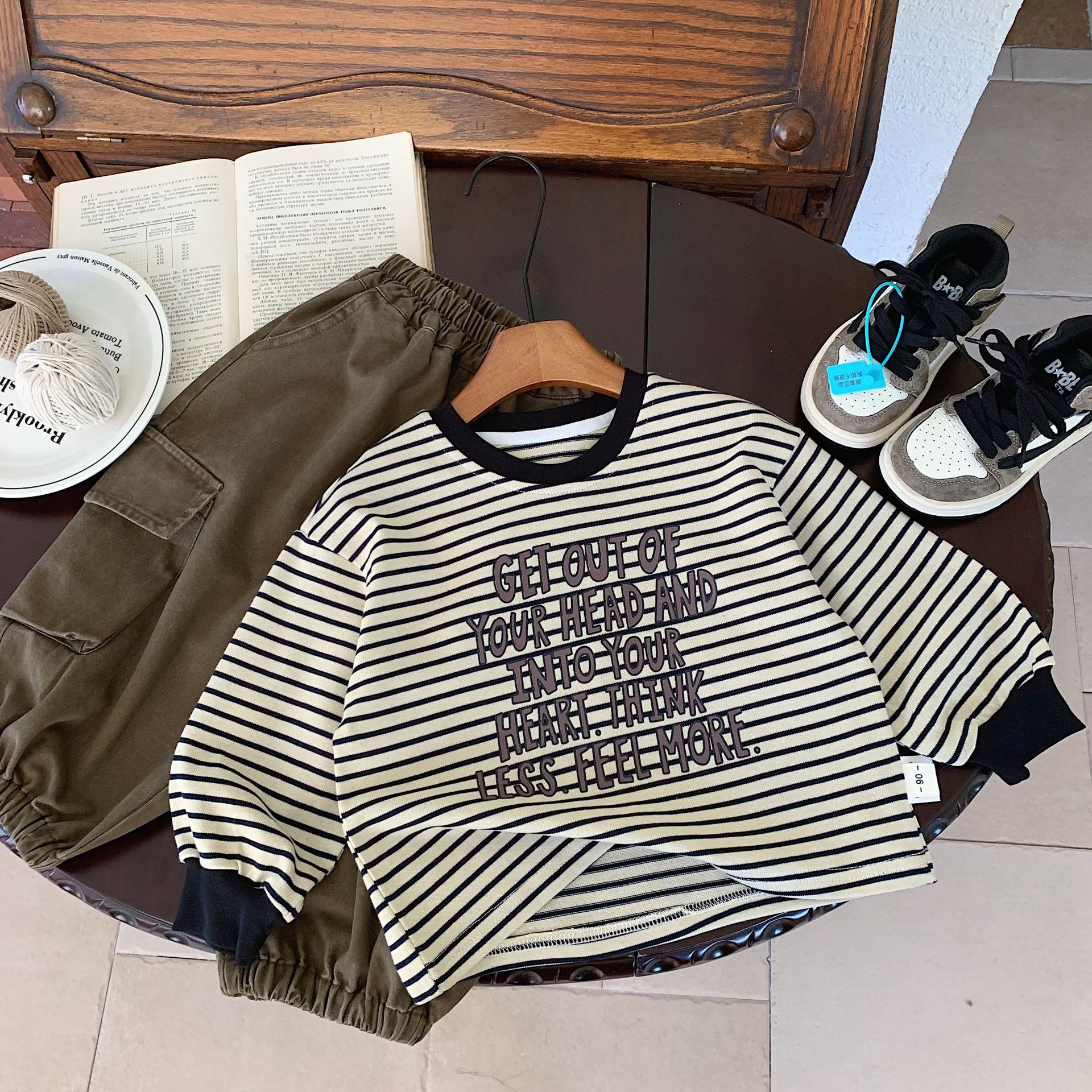 어린이 티셔츠 Bangcheng 2025 가을 신상 스트라이프 레터 라운드넥 반팔 한국 스타일 기본 셔츠 탑 트렌디 G0357