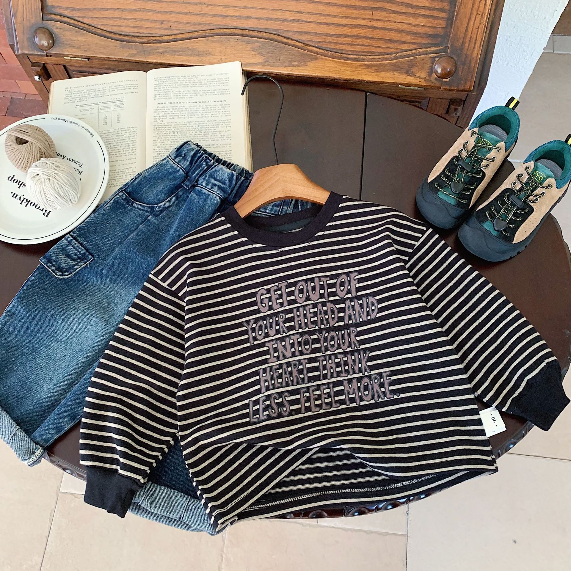 어린이 티셔츠 Bangcheng 2025 가을 신상 스트라이프 레터 라운드넥 반팔 한국 스타일 기본 셔츠 탑 트렌디 G0357스토어 가기