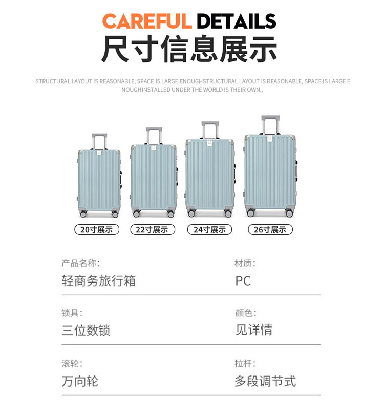 温馨提示:箱子因生产批次不同配件会有某些不同(包括但不止:轮子,内部结构),品质一样,仓库顺序发货,有疑问联系客服。