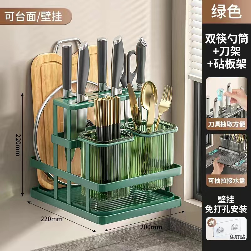 • 도마 홀더가 포함된 젓가락 꽂이 칼 꽂이 [퓨어 그린] 벽걸이 패치 포함