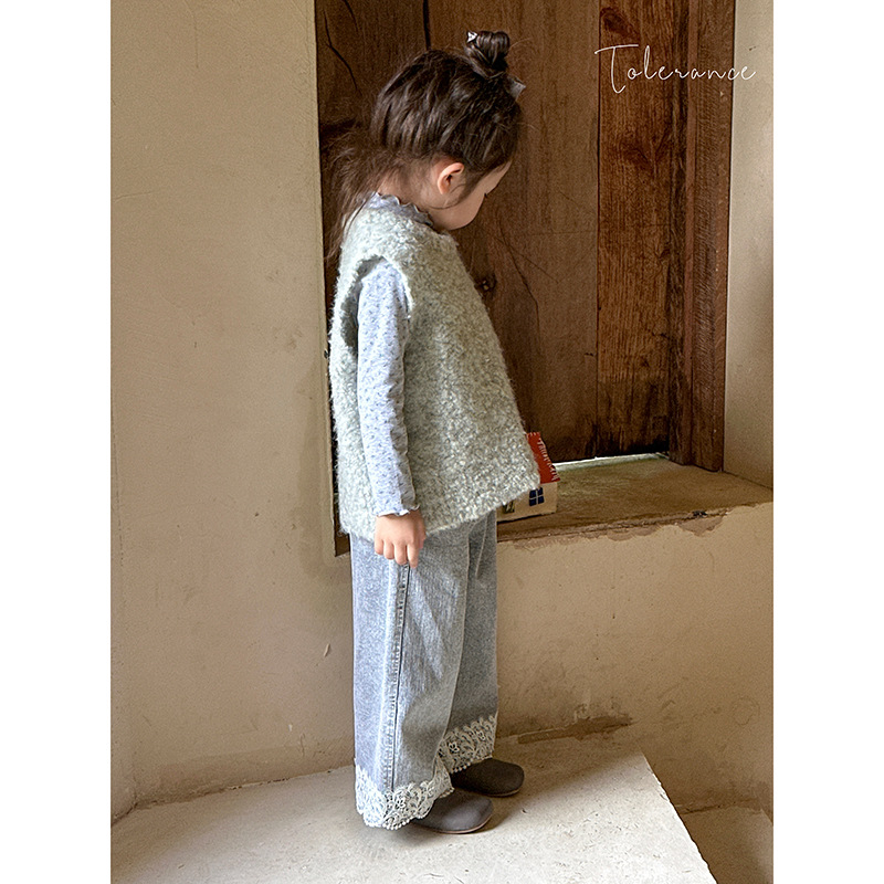 2025 가을 아동복 신상 여아 한국 스타일 스웨터 세련된 꽃무늬 이너웨어 아동 레이스 스티치 데님 팬츠