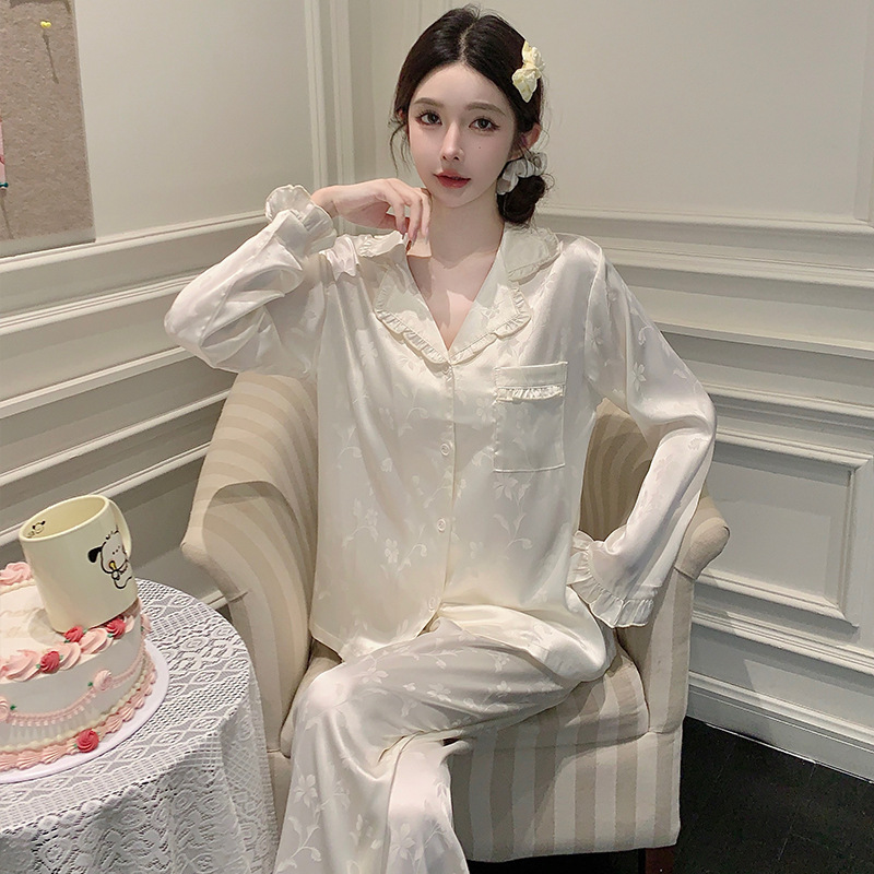 봄과 가을 2024 새로운 아이스 실크 자카드 파자마 여성용 긴 소매 바지 럭셔리 고귀한 카디건 얇은 홈 옷스토어 가기