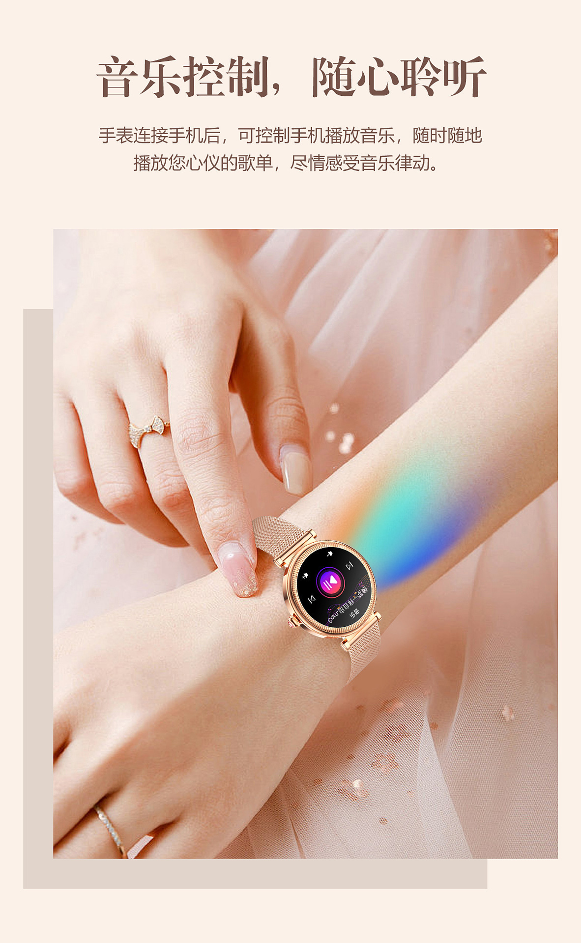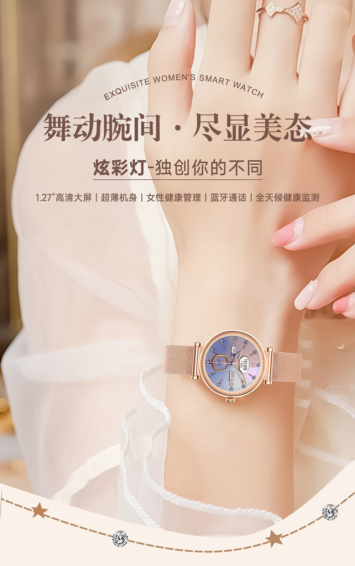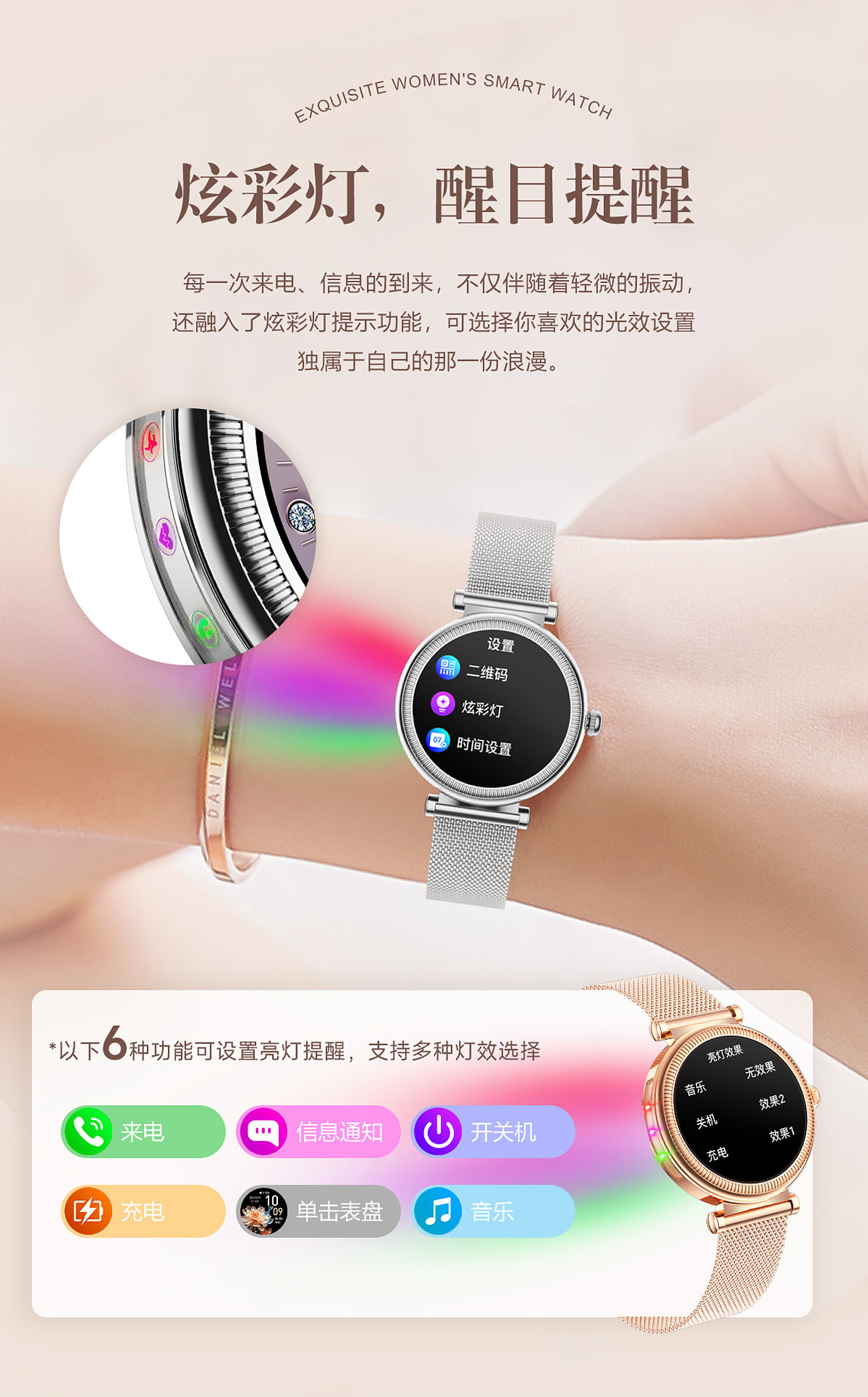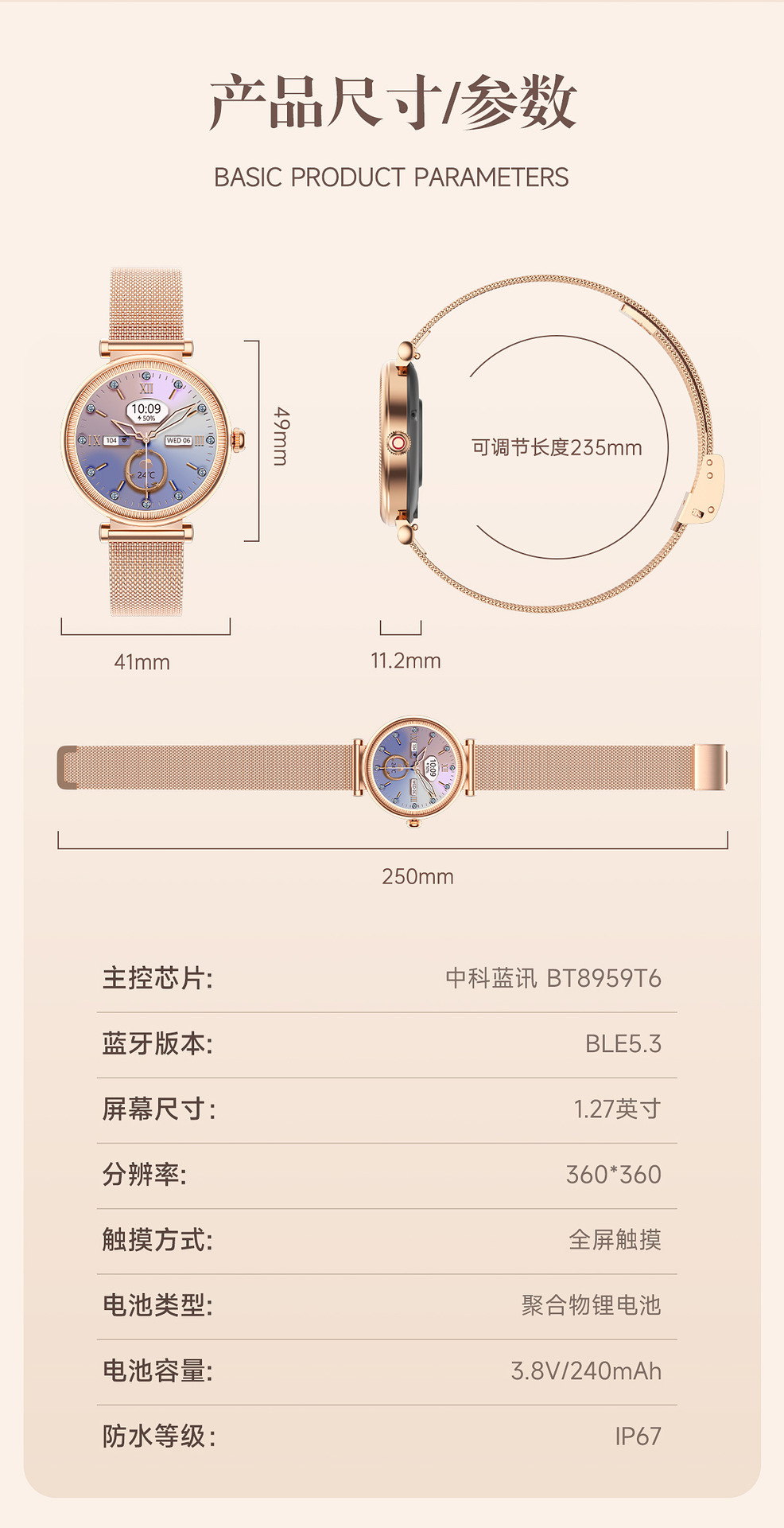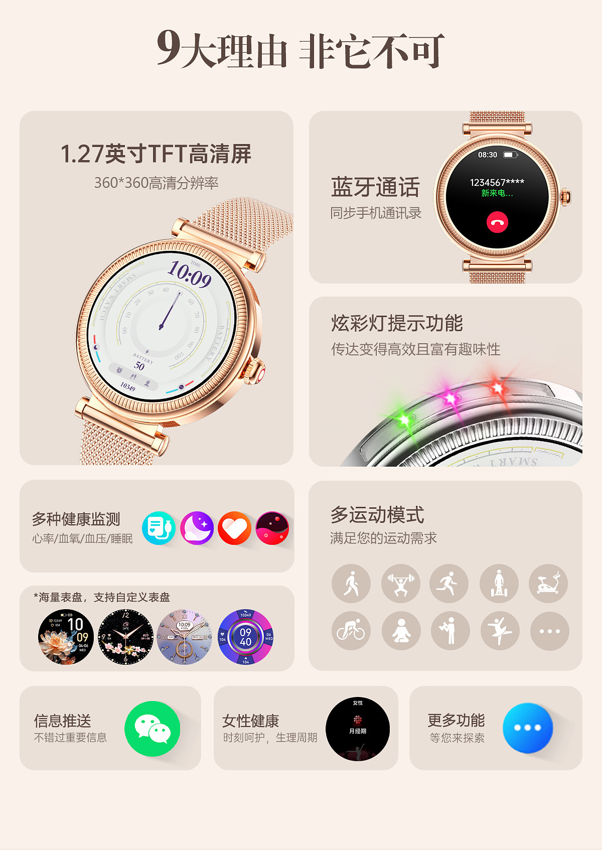 | 主要功能 | 1.27英寸全圆全触,主控BT8959T5,炫彩灯,通话,电提醒推送、短信提醒推送、微信提醒推送、QQ提醒推送、运动记录(计步、里程等)、震动、100多种运动模式,4套主题, 天气、睡眠、心率、血压、血氧、久坐/喝水提醒、音乐控制、遥控拍照, 消息提醒、查找手机/手表、振动与铃声选择、来电快捷信息回复、时间设置、密码锁屏功能、呼吸训练、女性生理、秒表、计时器、闹钟、名片、日历、运动历史记录、勿扰模式、省电模式、低电提醒、手电筒、语音助手(SIRI)、游戏. |