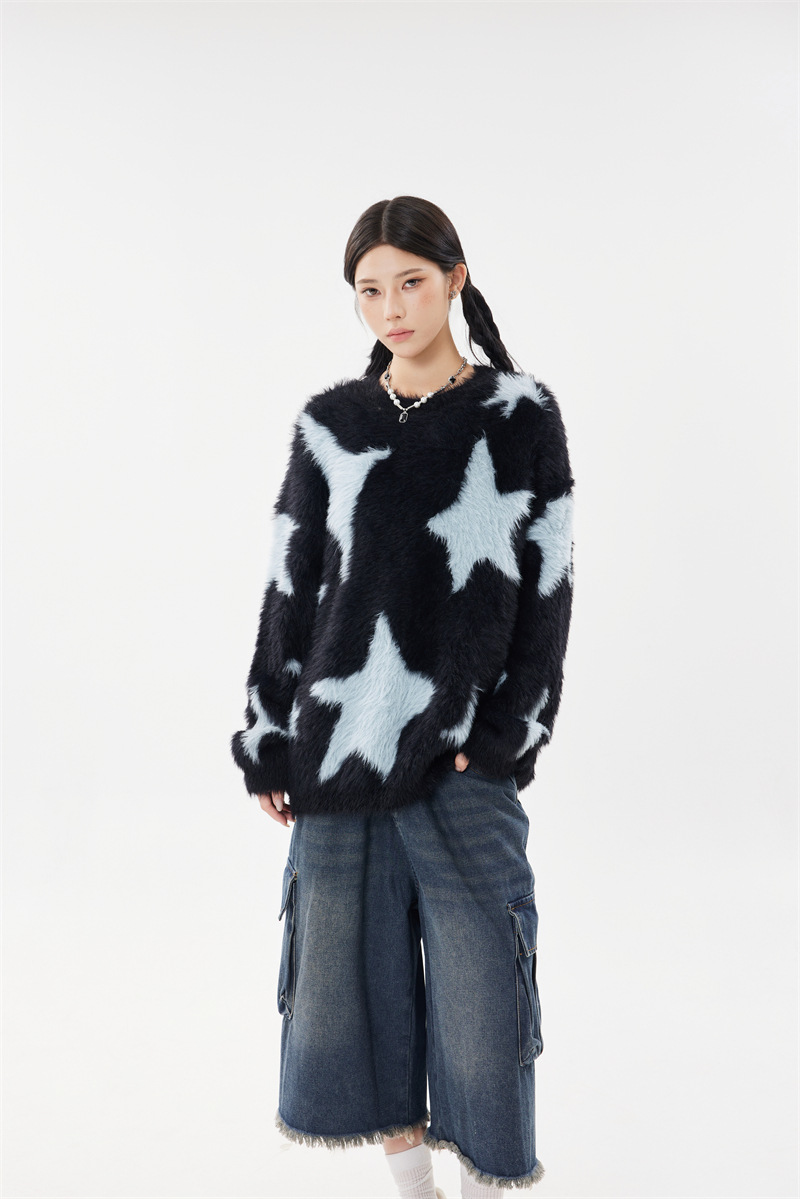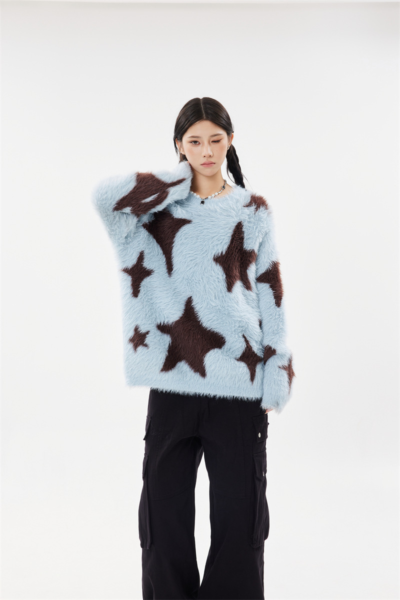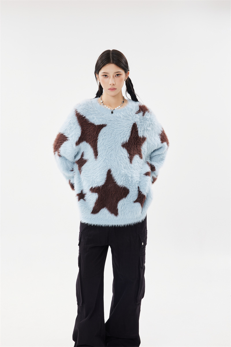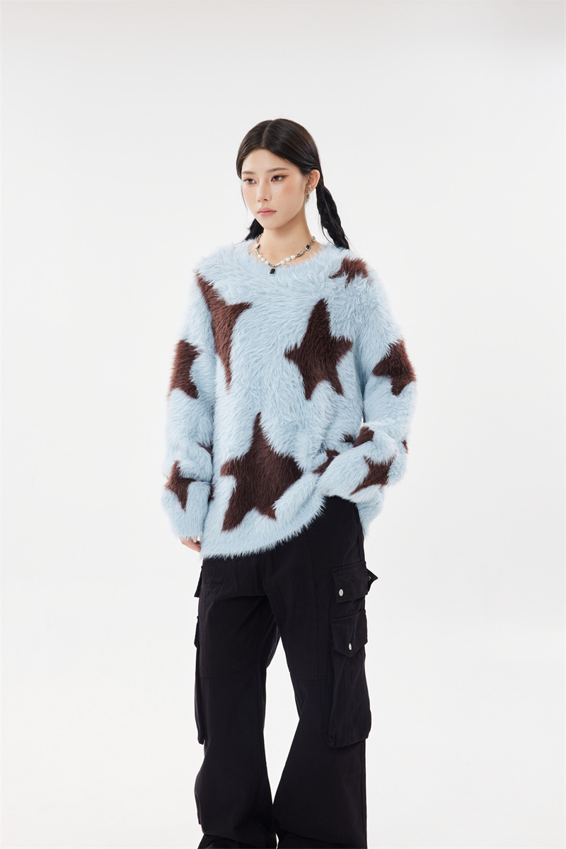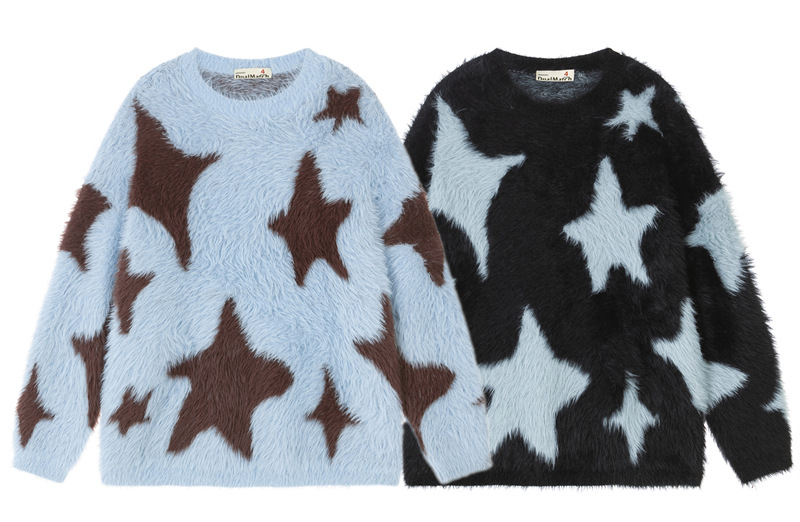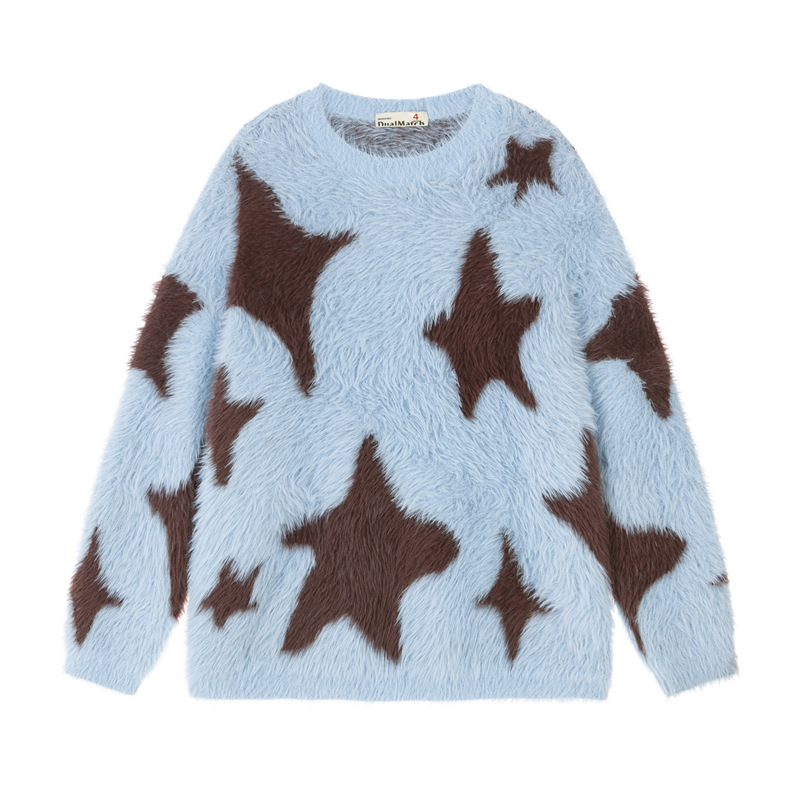 트렌디 한 브랜드 모피 니트 셔츠 크루 넥 긴팔 스타 스웨터 남자 가을 캐주얼 루즈 올 매치 커플 탑