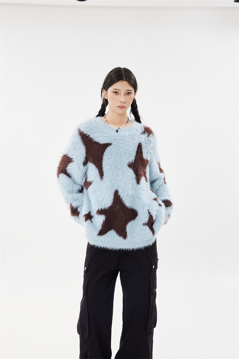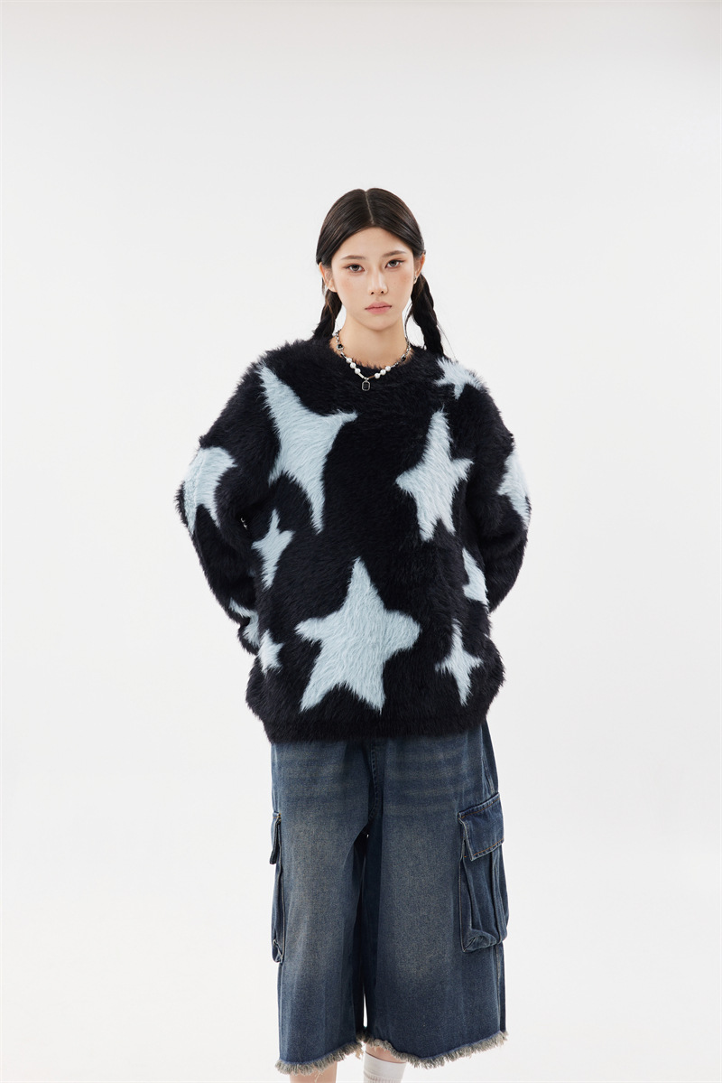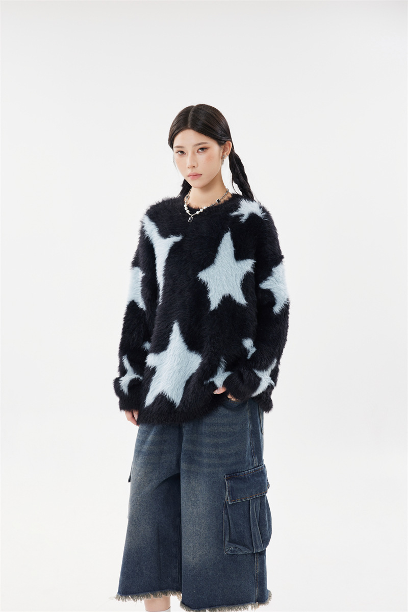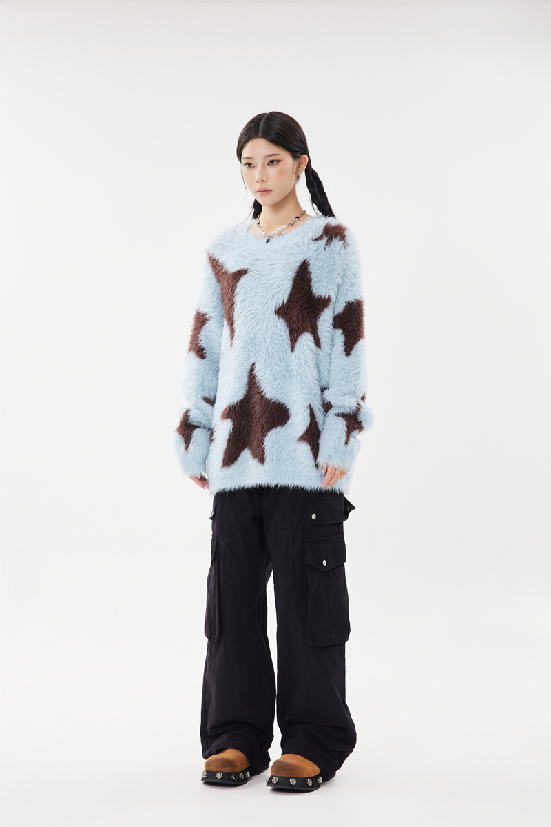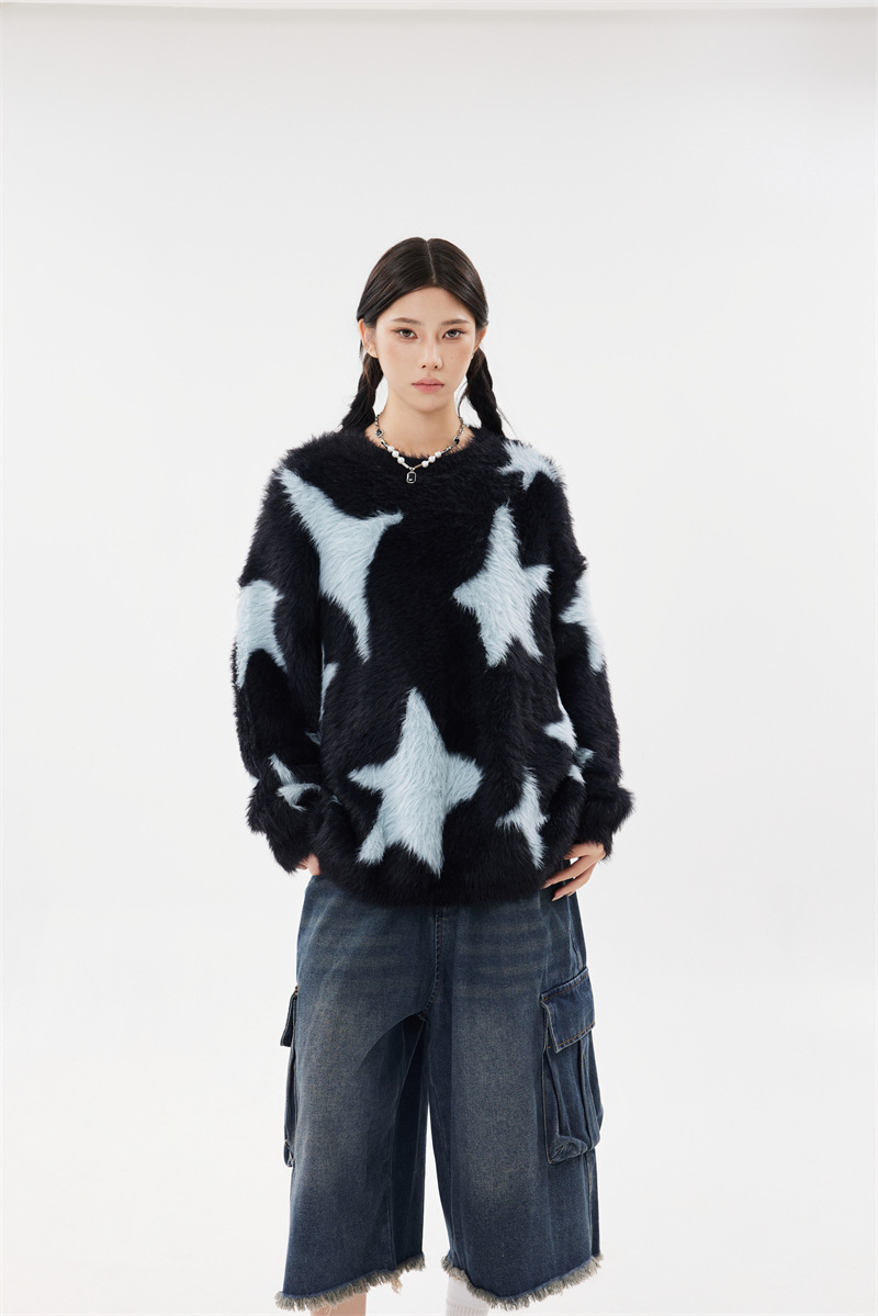 트렌디 한 브랜드 모피 니트 셔츠 크루 넥 긴팔 스타 스웨터 남자 가을 캐주얼 루즈 올 매치 커플 탑