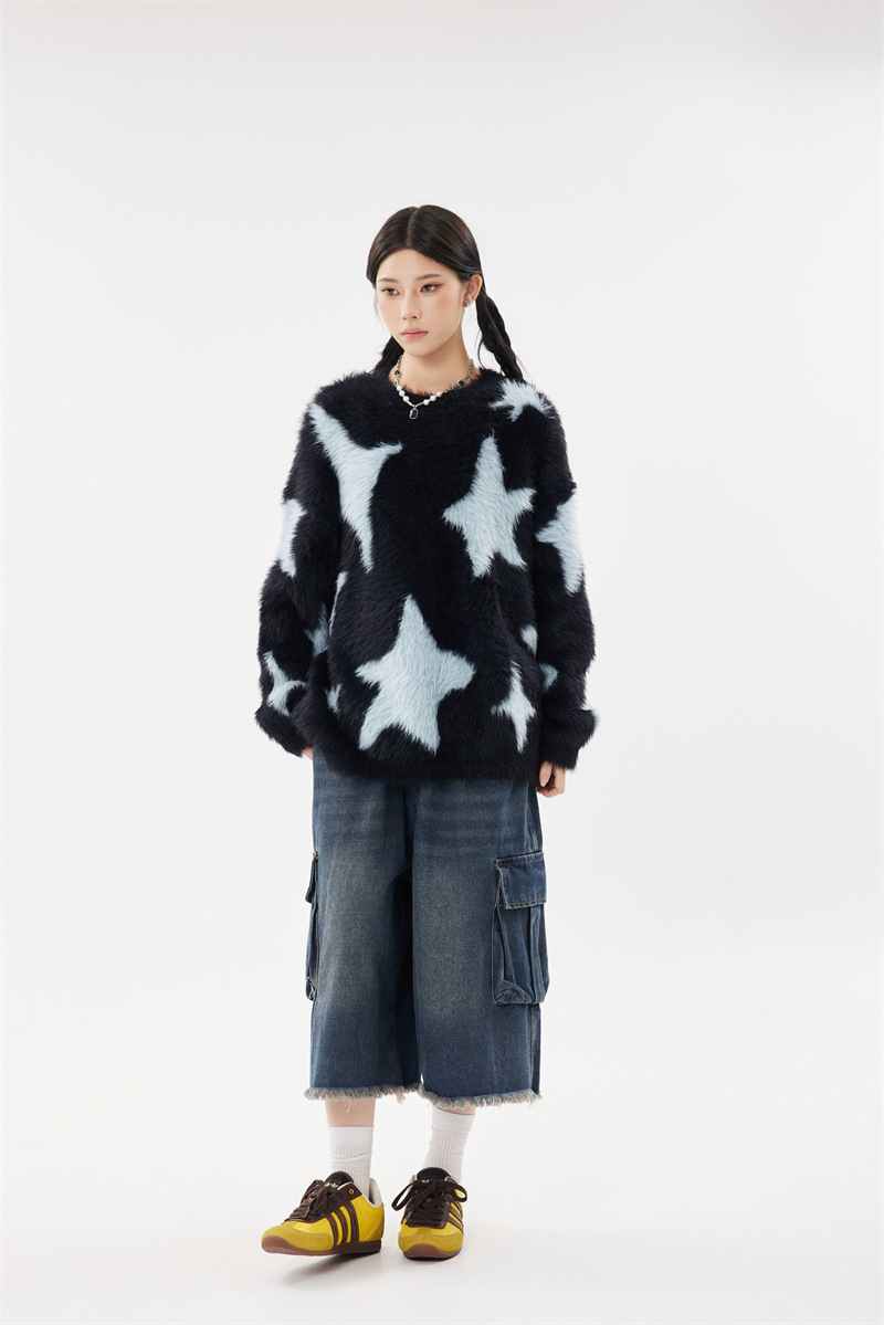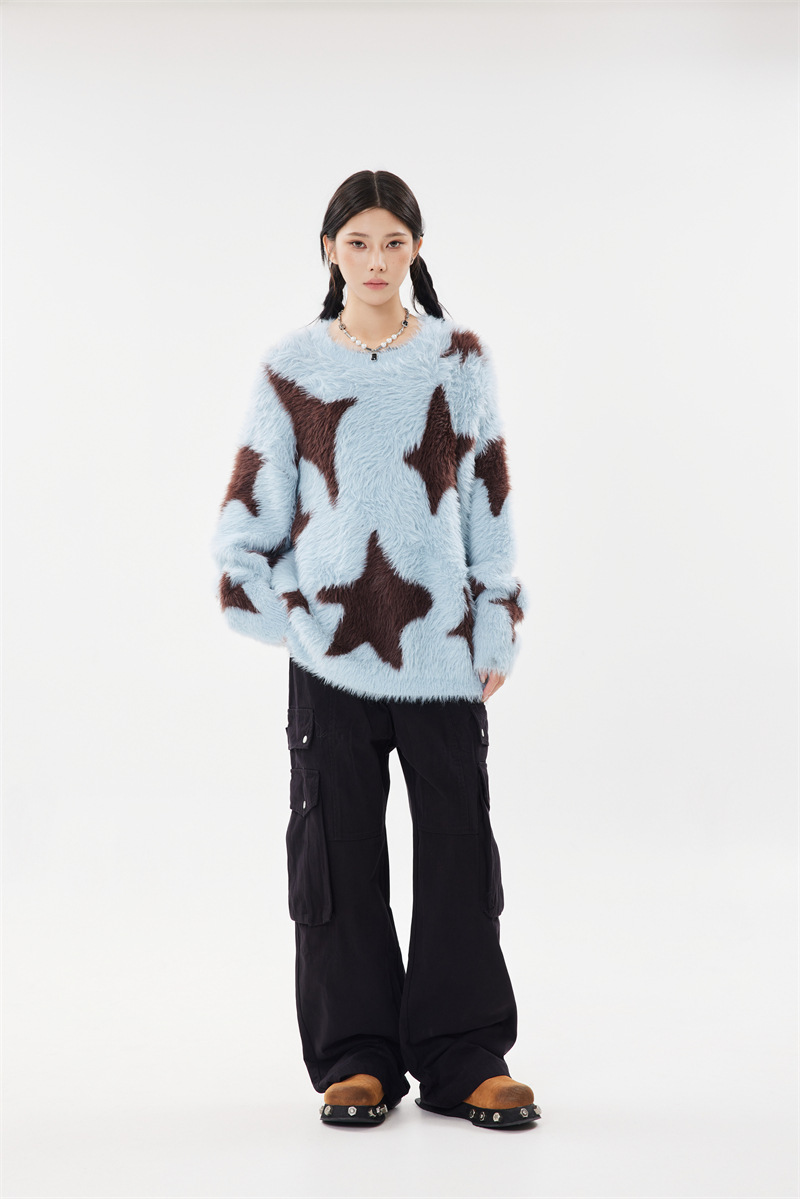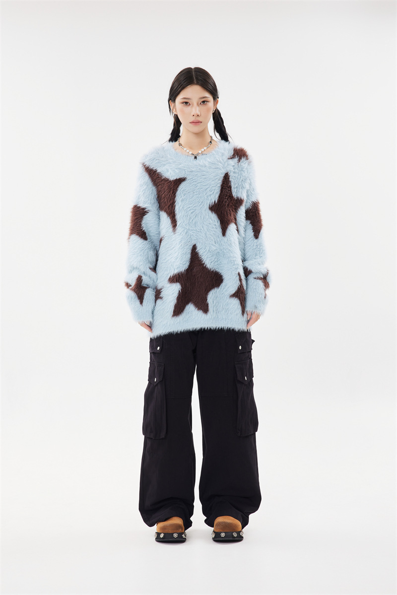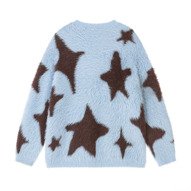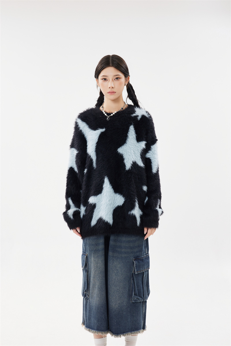 트렌디 한 브랜드 모피 니트 셔츠 크루 넥 긴팔 스타 스웨터 남자 가을 캐주얼 루즈 올 매치 커플 탑