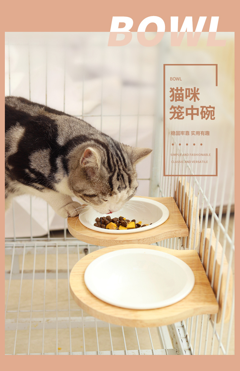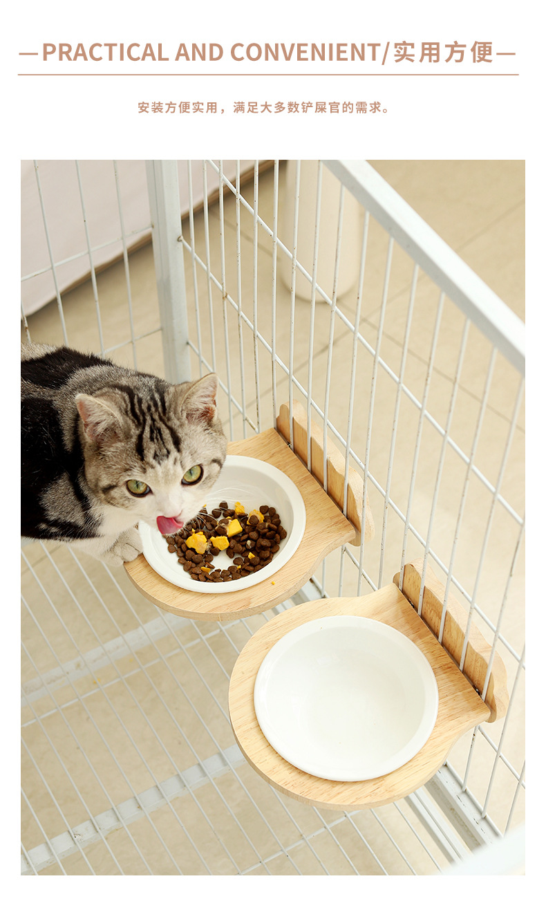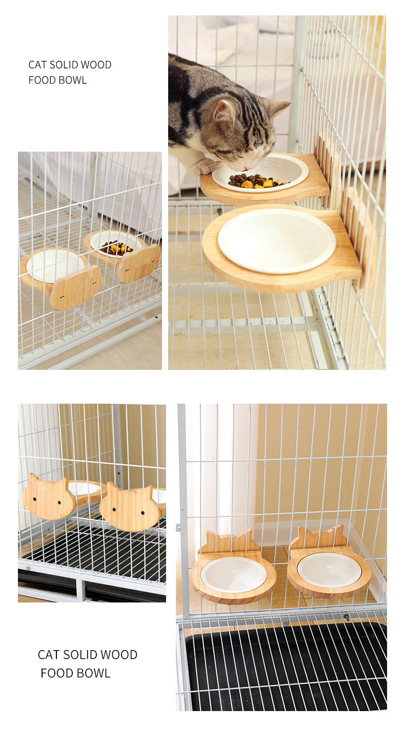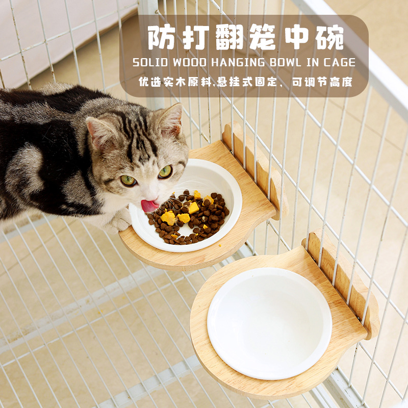 고양이 밥그릇 급식기 고양이 그릇 세라믹 고양이 및 강아지 식기 케이지 내 원목 프레임 넘어짐 방지 걸이식 그릇 애완동물 고양이용