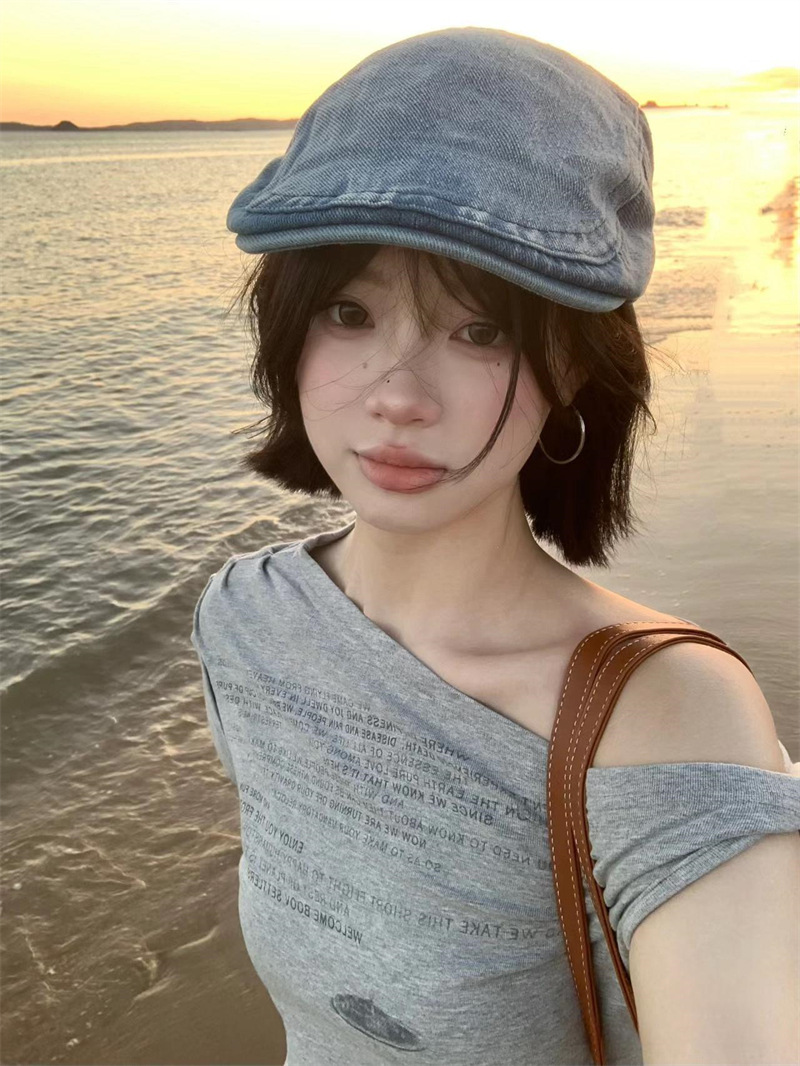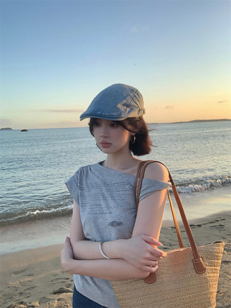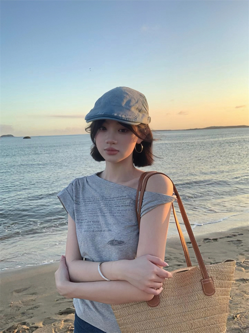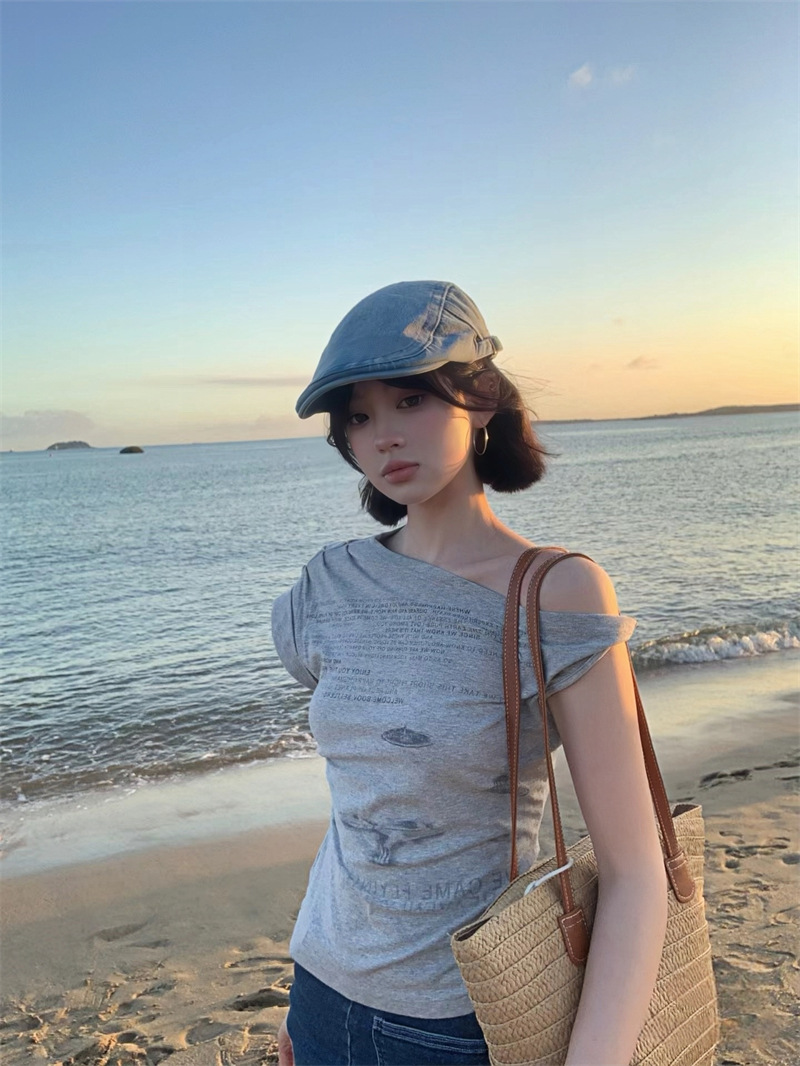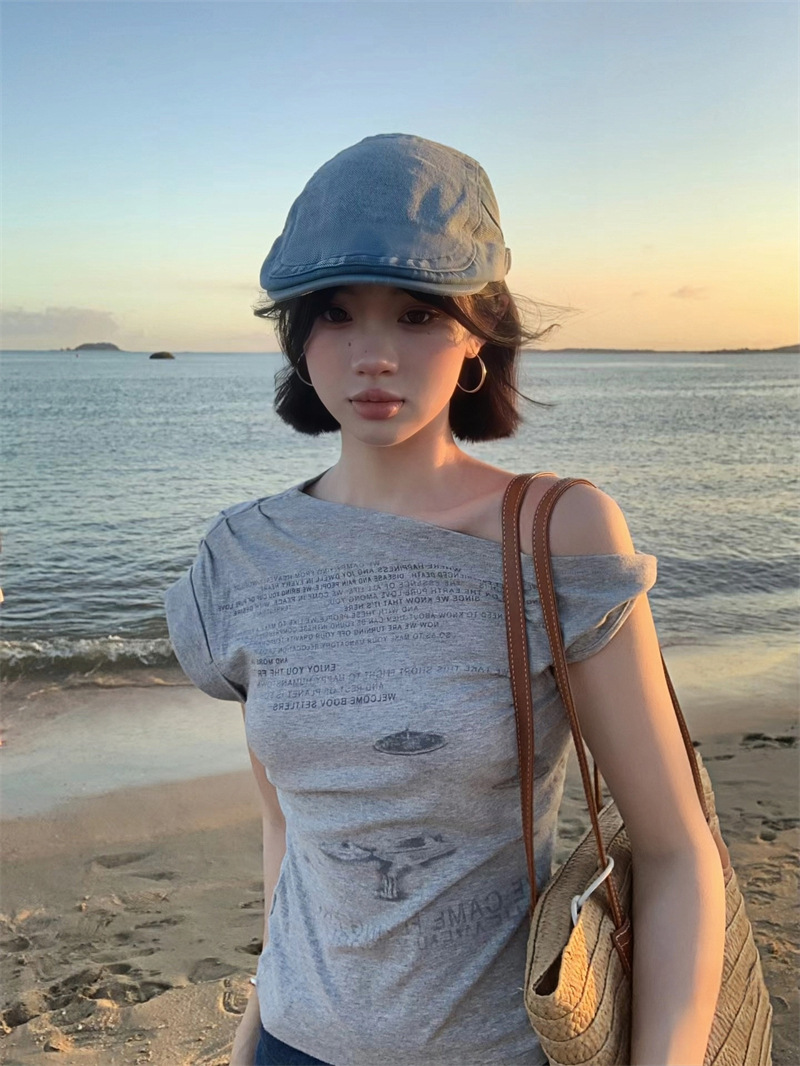 빈티지 아메리칸 스타일 스파이스 소녀 불규칙한 슬림 핏 슬림 숄더 반팔 티셔츠 여성용 여름 틈새 올 매치 그레이 칙 탑스토어 가기