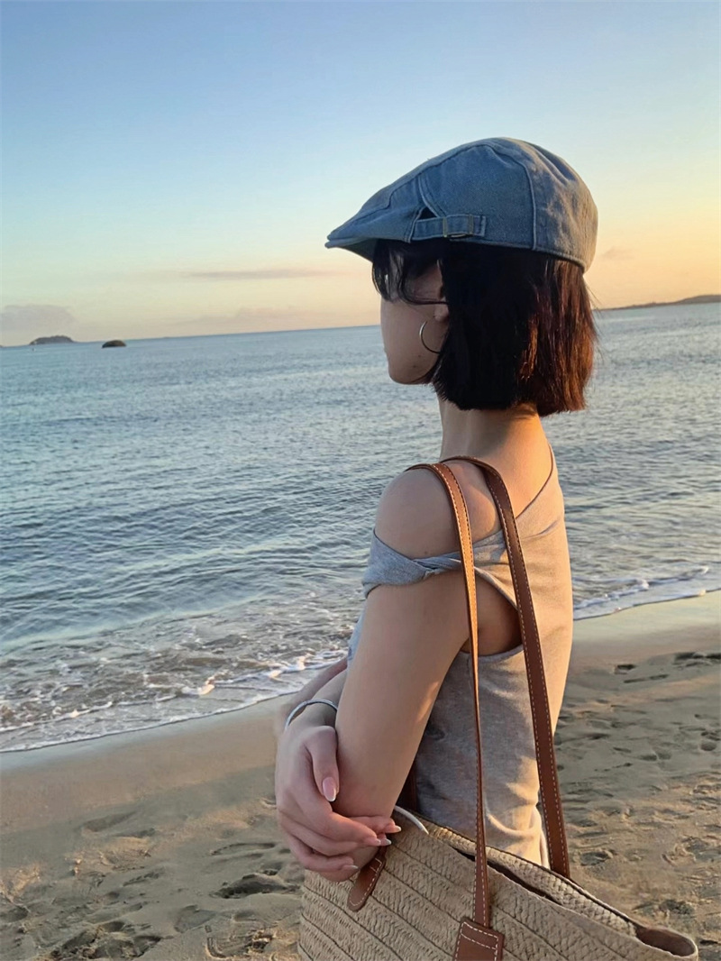 빈티지 아메리칸 스타일 스파이스 소녀 불규칙한 슬림 핏 슬림 숄더 반팔 티셔츠 여성용 여름 틈새 올 매치 그레이 칙 탑