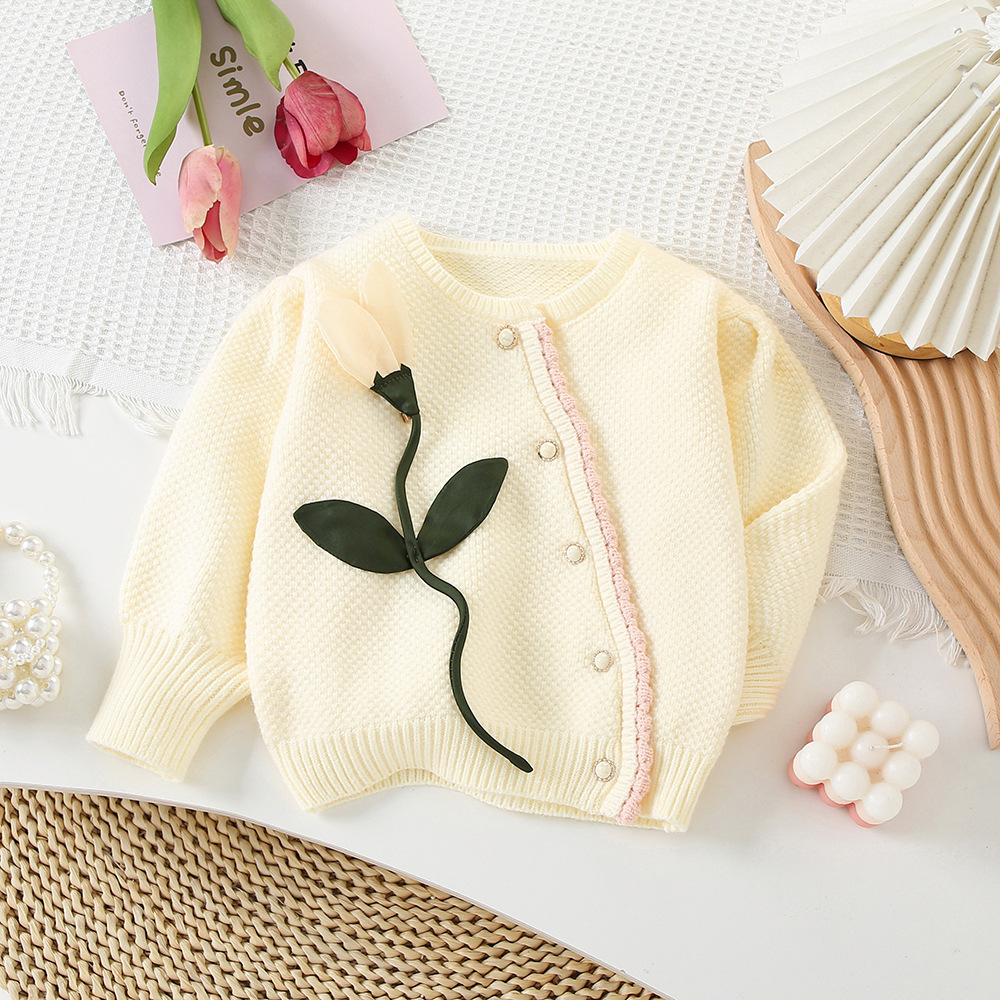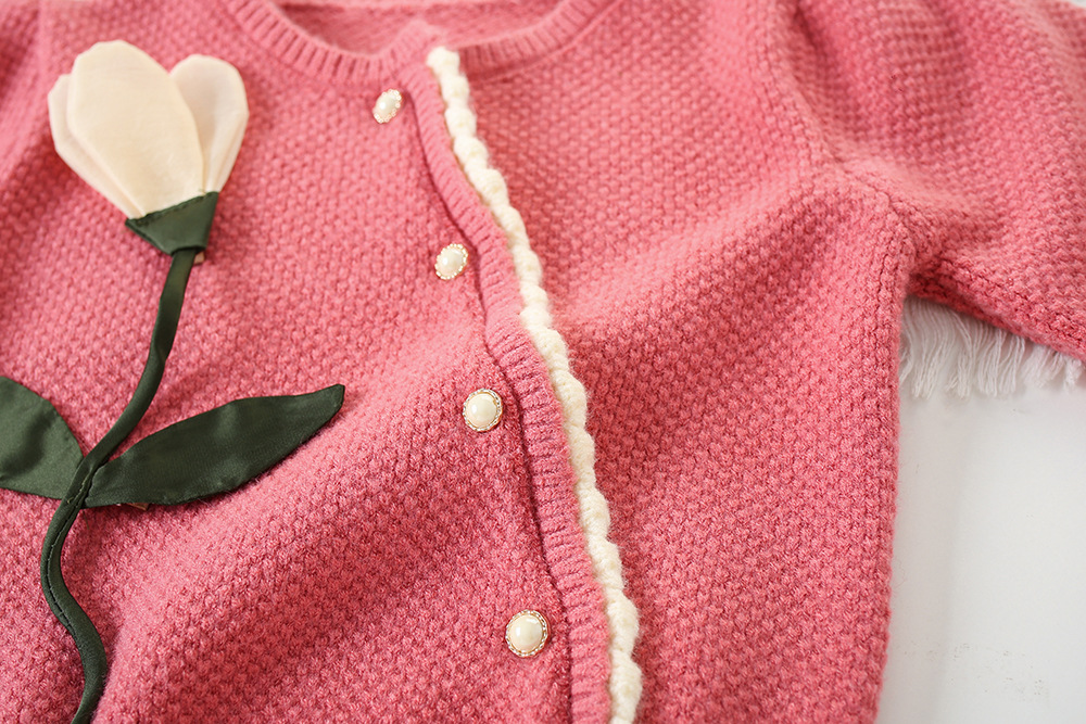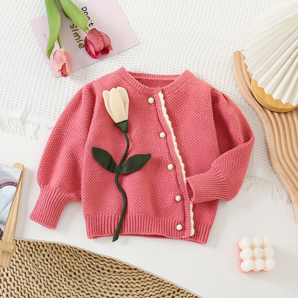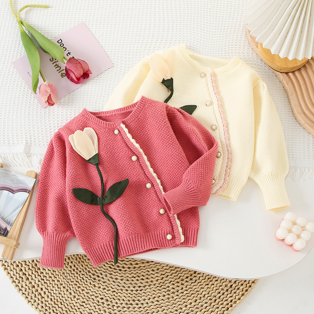 어린이 3 차원 꽃 한국 니트 스웨터 소녀 스웨터 카디건 2024 가을 새 아기의 서양식 니트 자켓