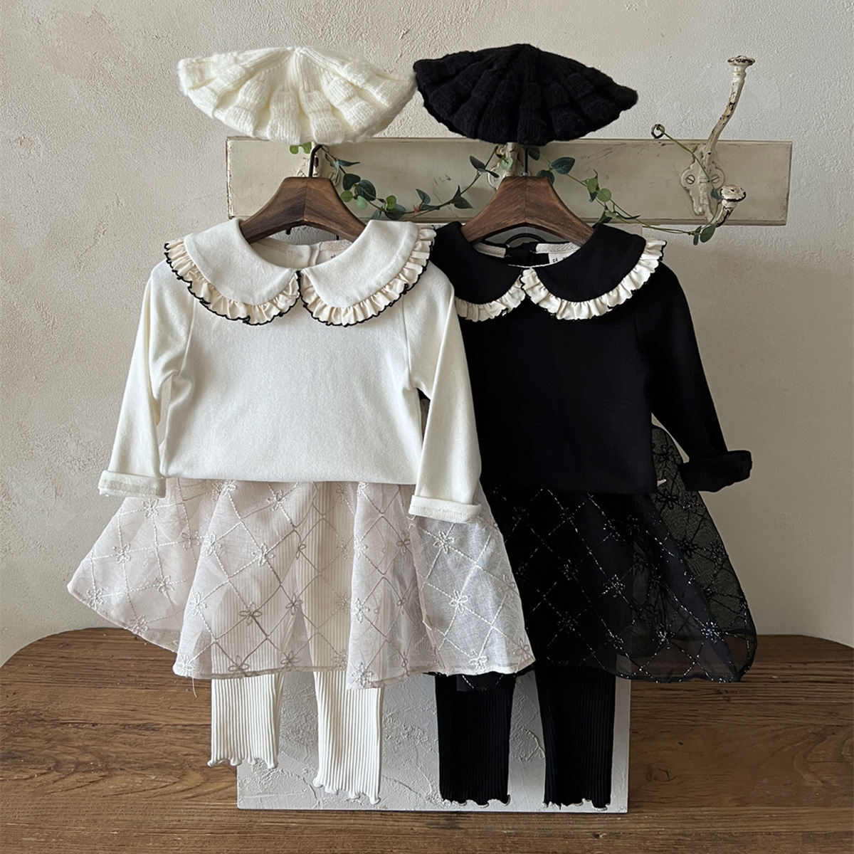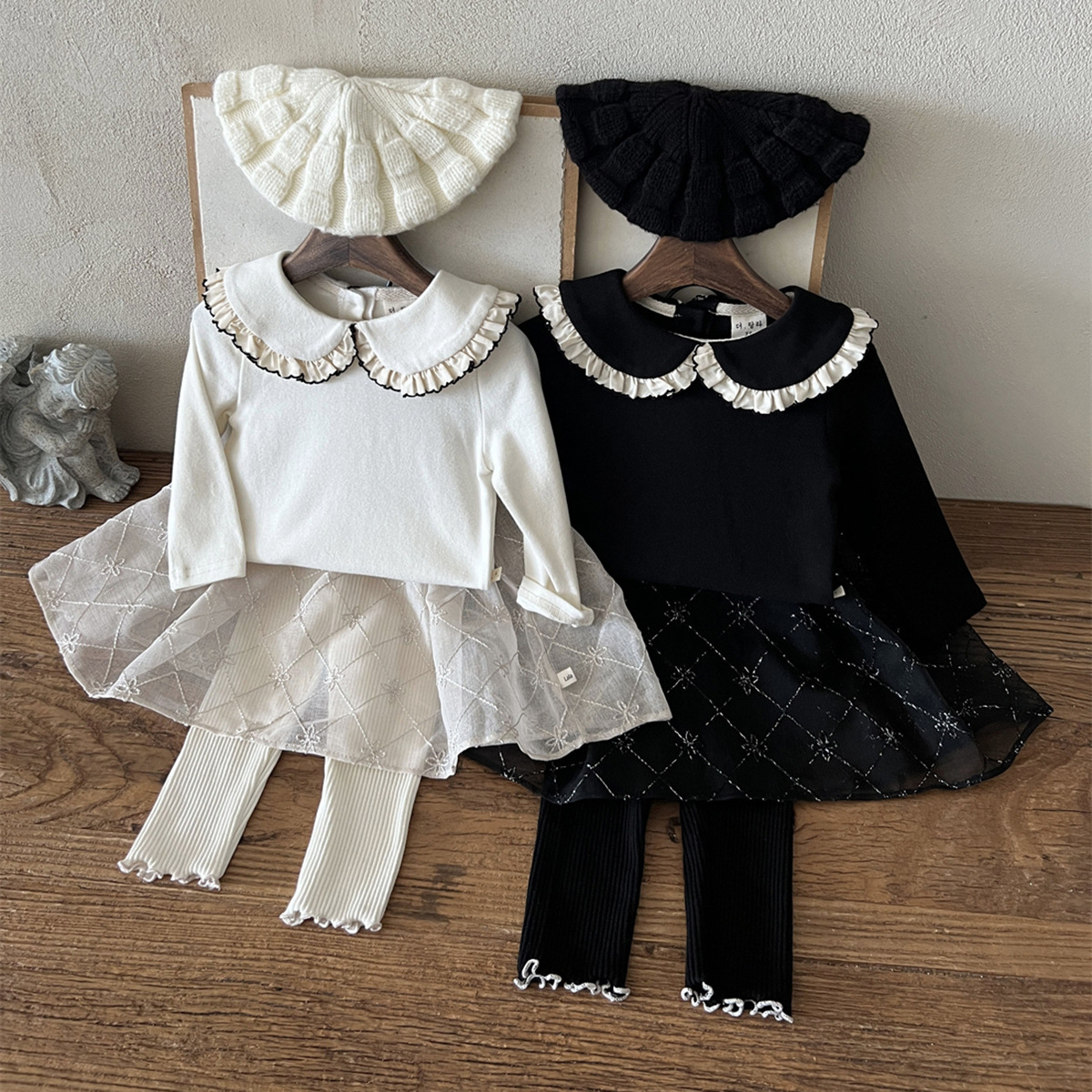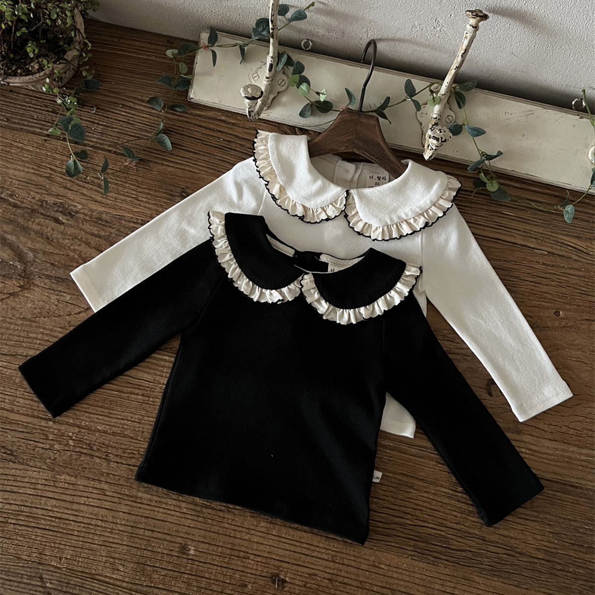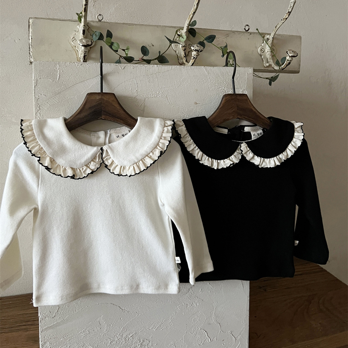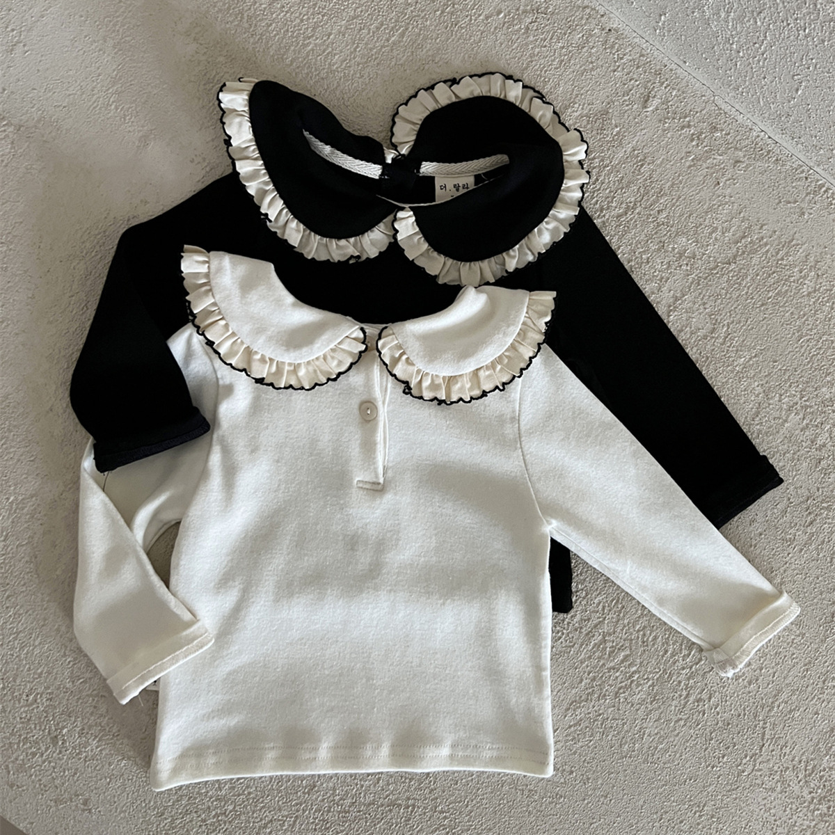 25 가을 한국어 버전 ins 아동복 유아 및 유아 아기 플라잉 에지 인형 칼라 긴팔 다목적 바닥 셔츠 티셔츠스토어 가기