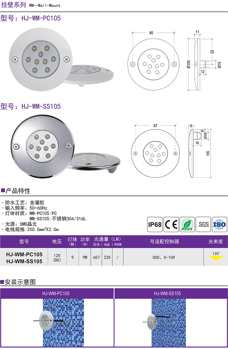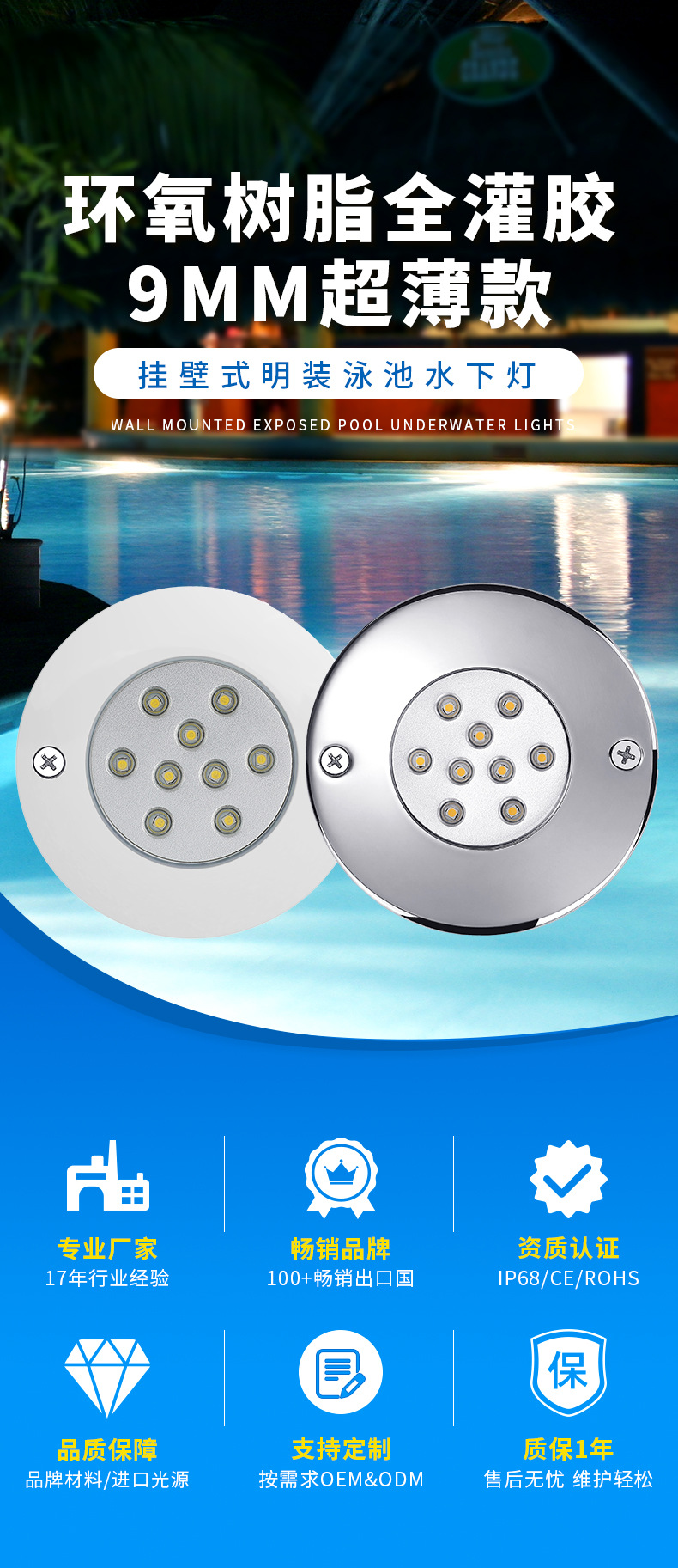 스몰 사이즈 벽에 장착 된 수영장 램프 조절 가능한 밝기 수중 램프 수중 램프 얇은 PVC 접착제 충전 작은 전원 방수 램프