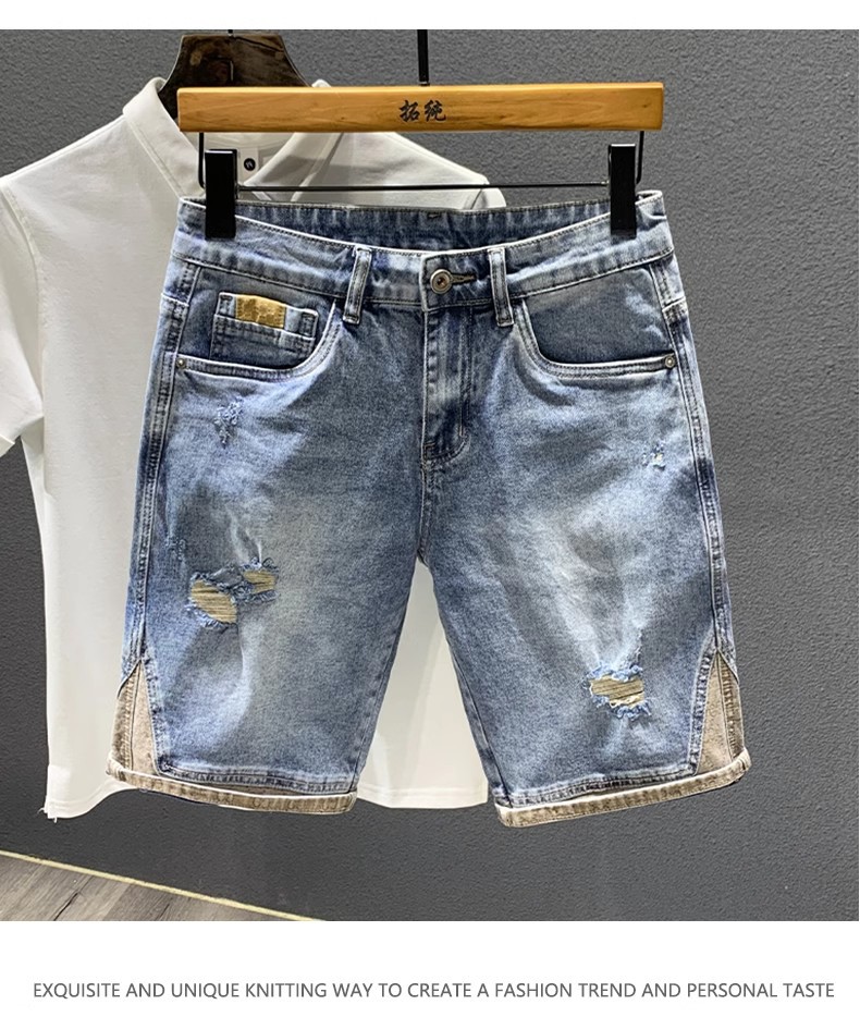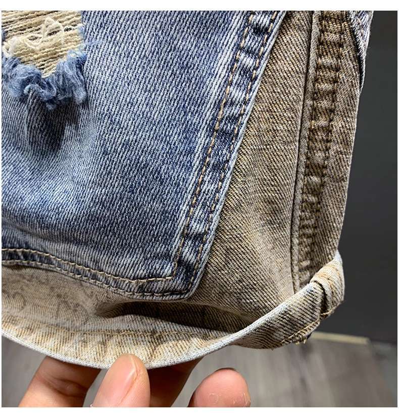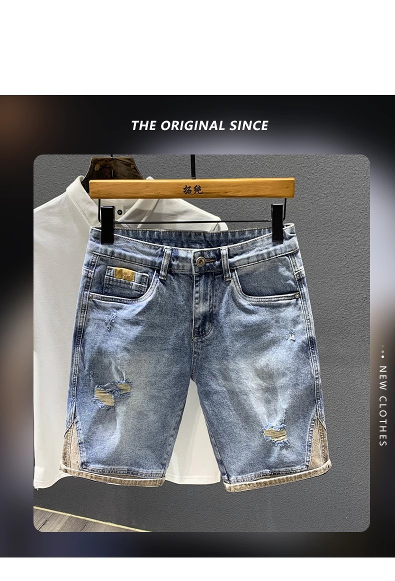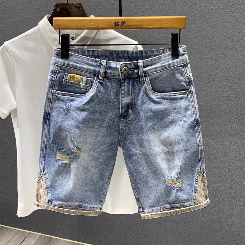 여름 얇은 빛 럭셔리 트렌디 브랜드 하이 엔드 레트로 거지의 찢어진 데님 반바지 남자 스티칭 중간 길이 바지 스트레치 바지스토어 가기