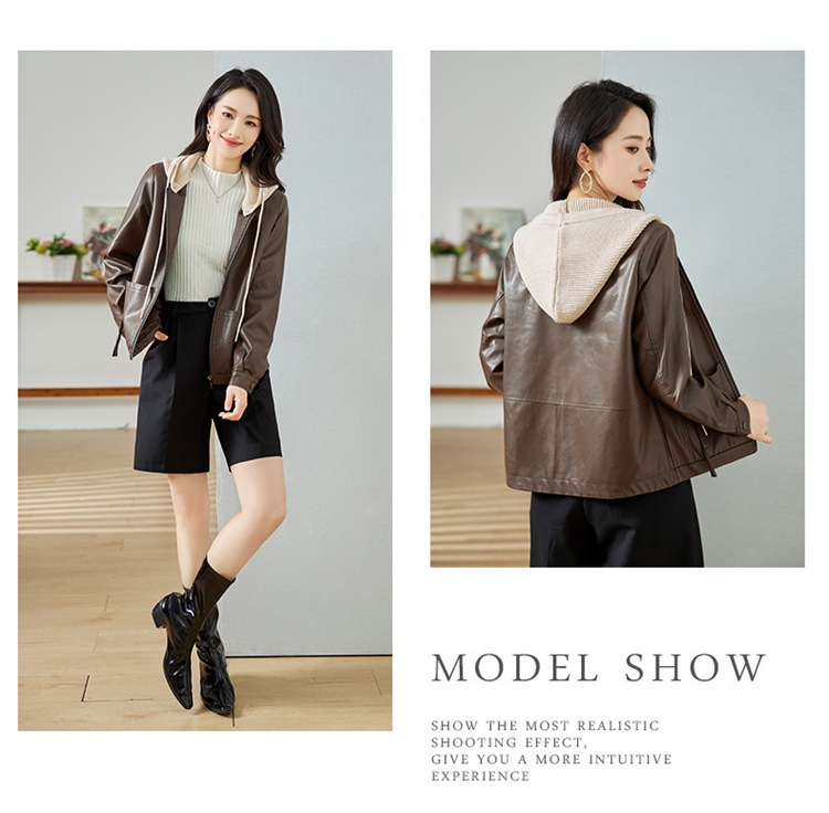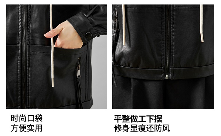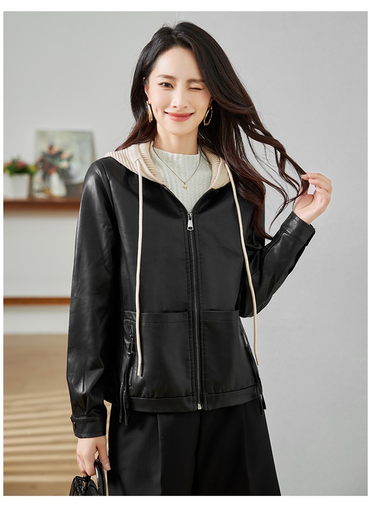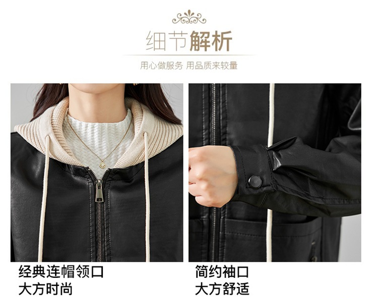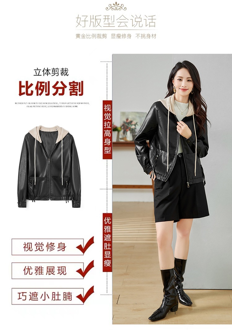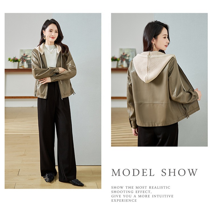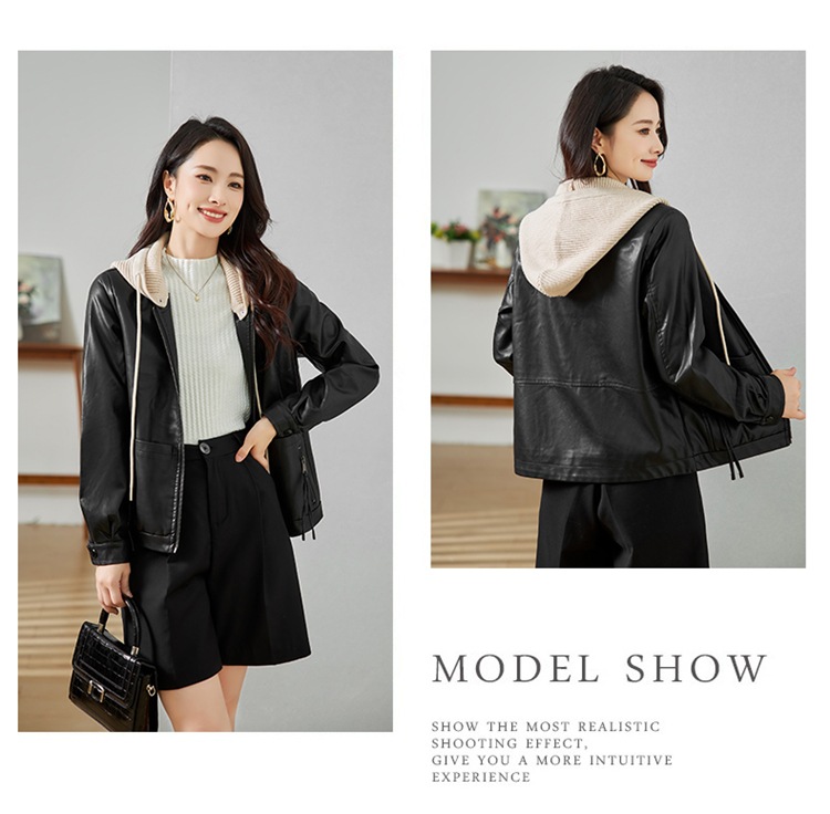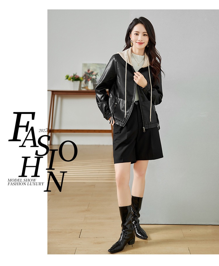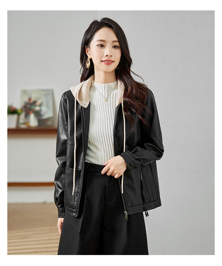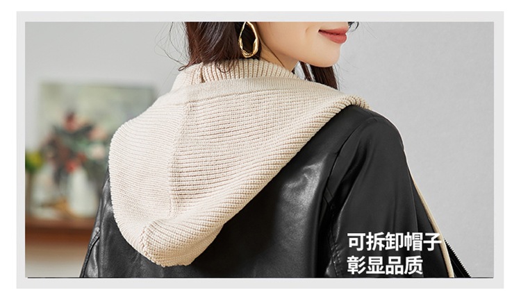 24 신상 탈부착 가능한 니트 후드 가죽 자켓 여성용 짧은 가죽 자켓 가을 겨울 캐주얼 Pu 만능 자켓 한국 스타일스토어 가기