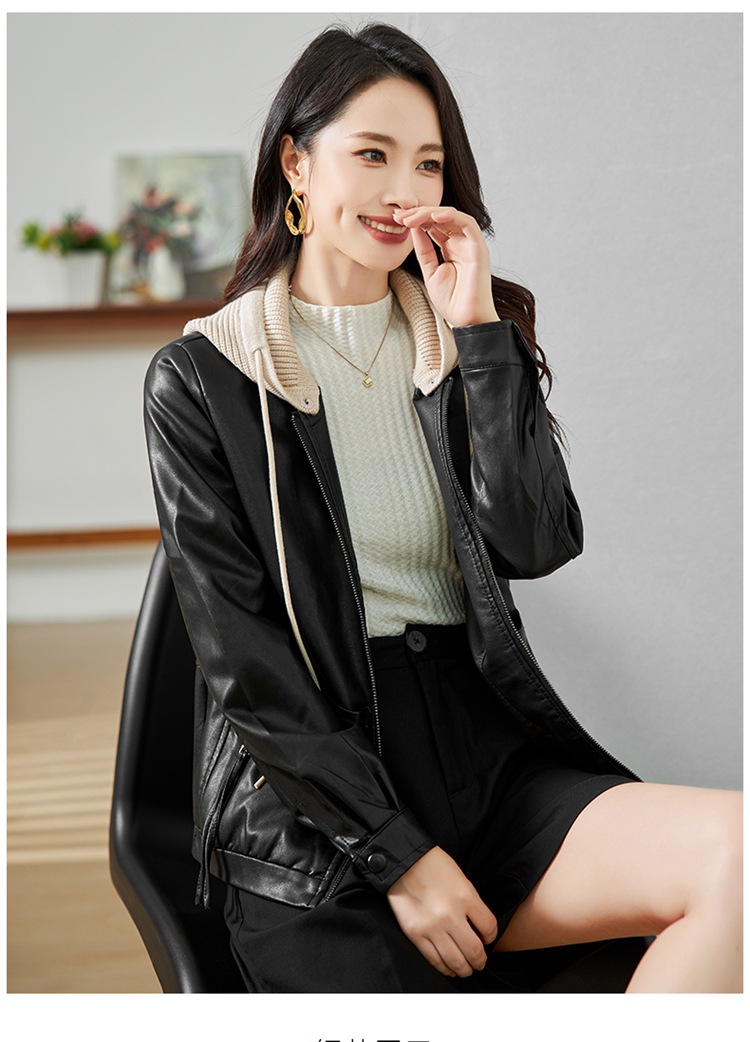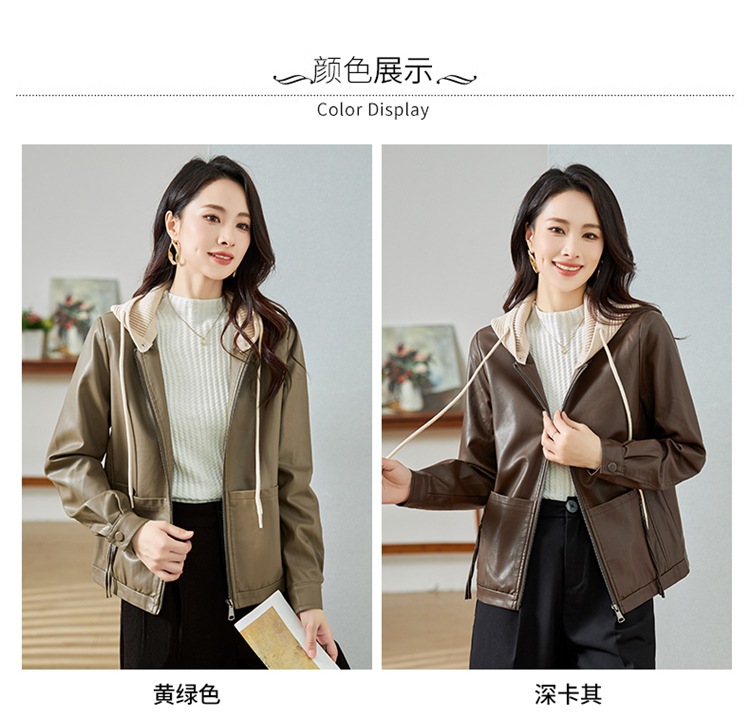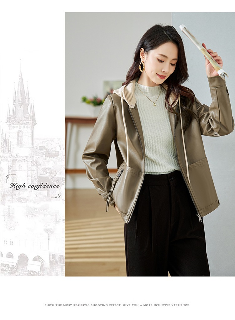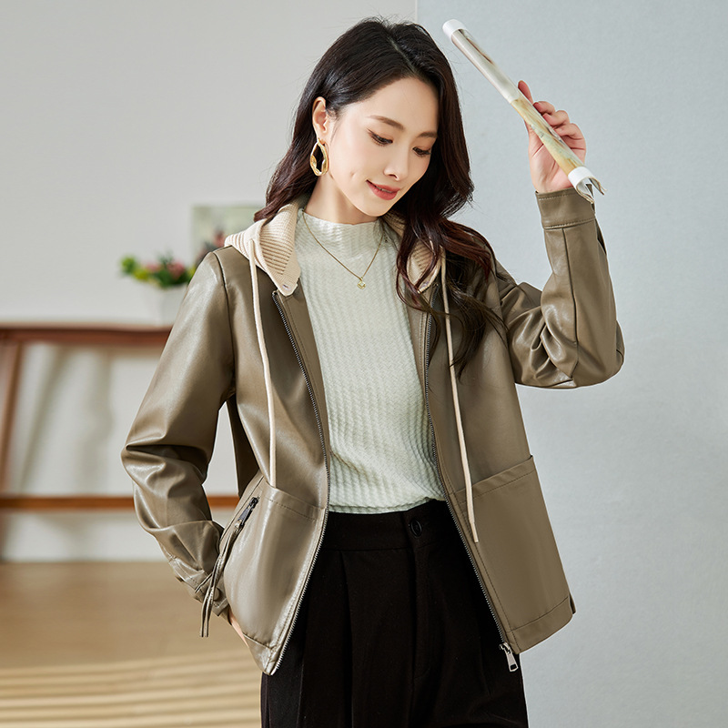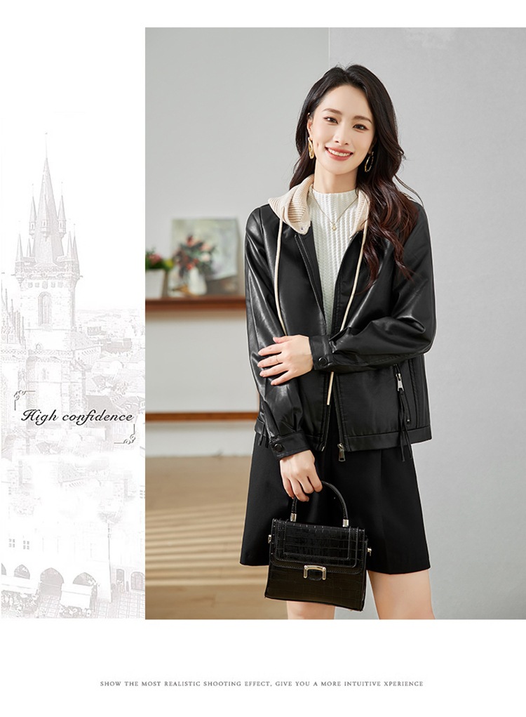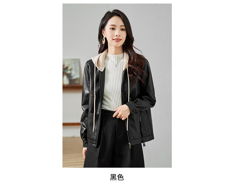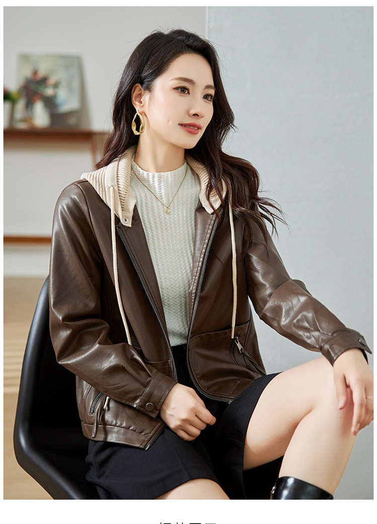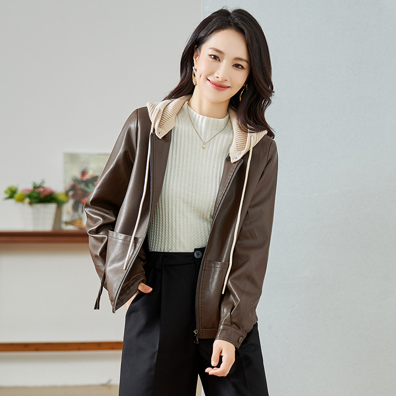 24 신상 탈부착 가능한 니트 후드 가죽 자켓 여성용 짧은 가죽 자켓 가을 겨울 캐주얼 Pu 만능 자켓 한국 스타일스토어 가기
