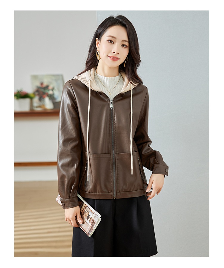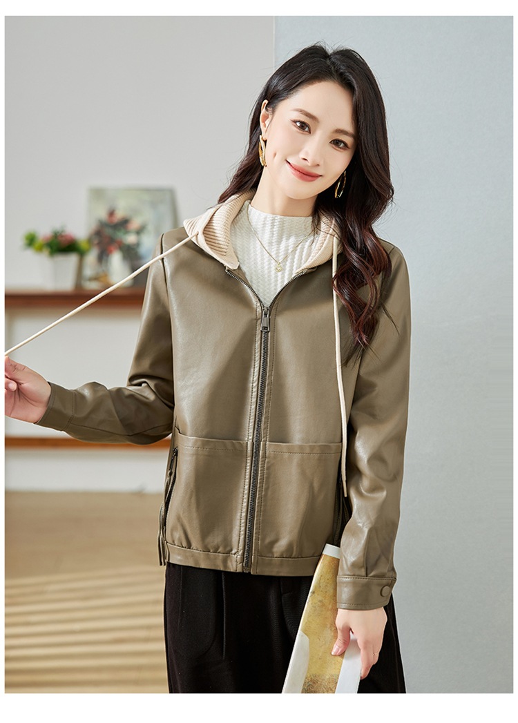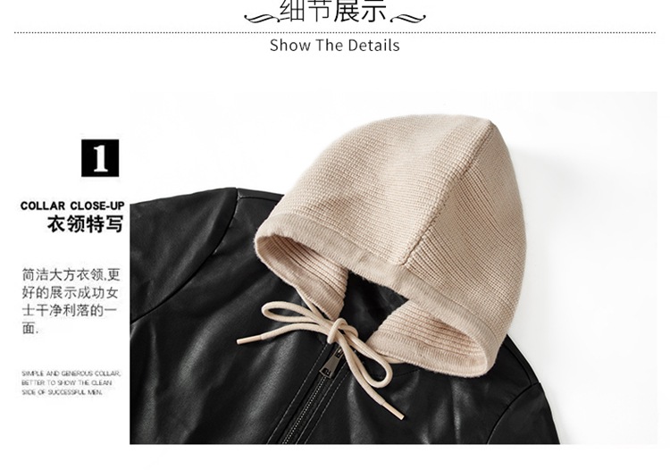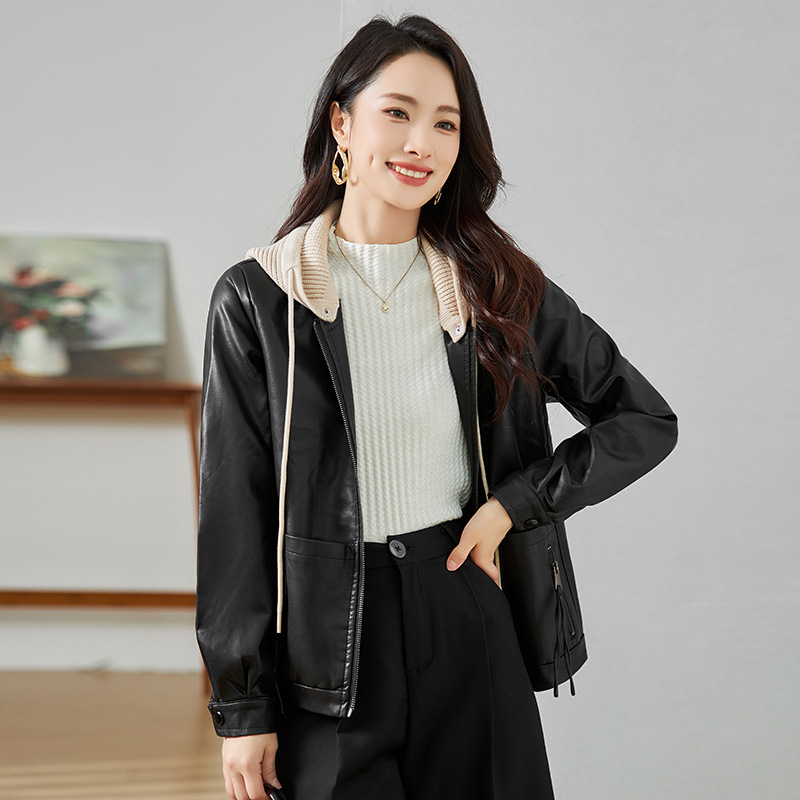 24 신상 탈부착 가능한 니트 후드 가죽 자켓 여성용 짧은 가죽 자켓 가을 겨울 캐주얼 Pu 만능 자켓 한국 스타일
