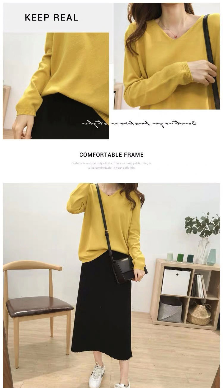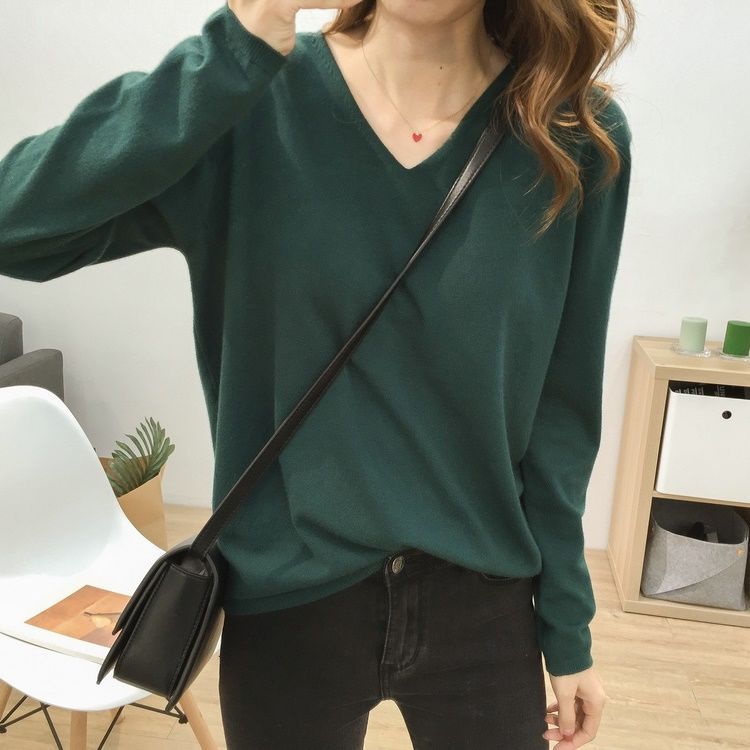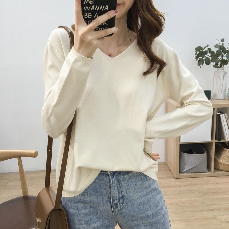 가을 브이넥 니트 여성용 가을 신상품 빅사이즈 루즈핏 슬림핏 상의 단색 이너 니트 베이스 셔츠 스웨터