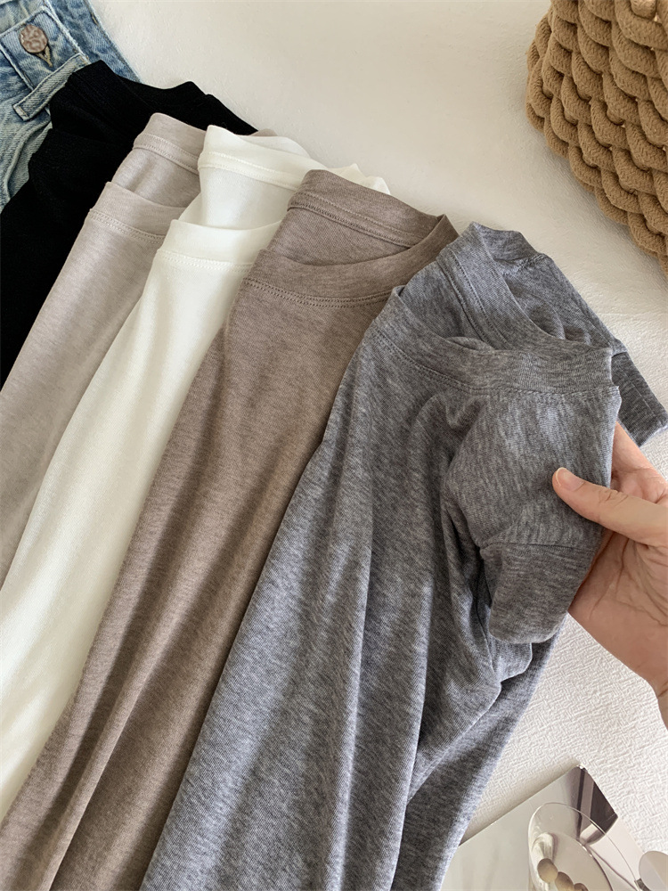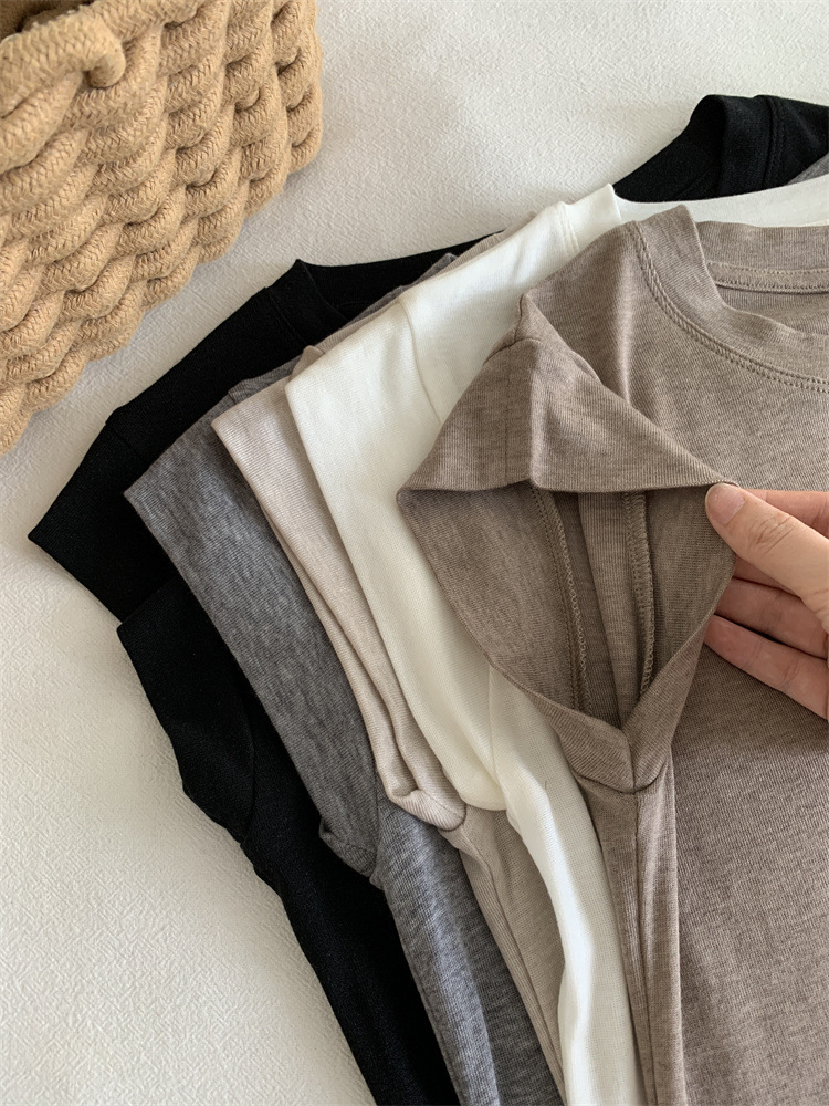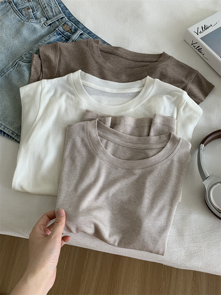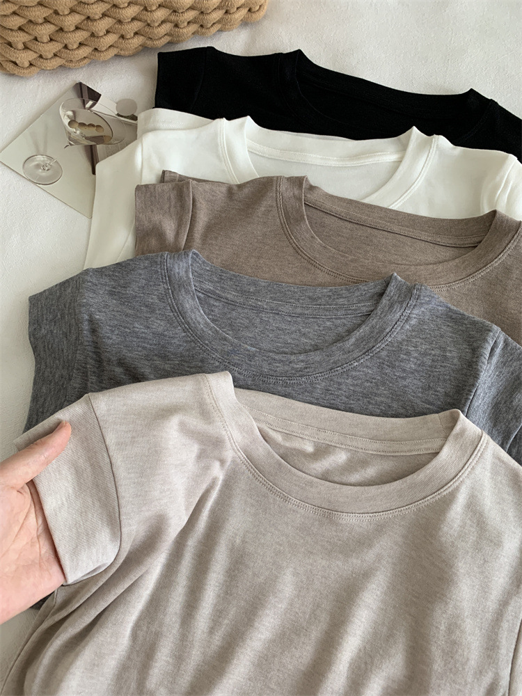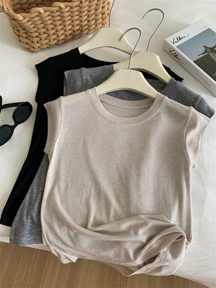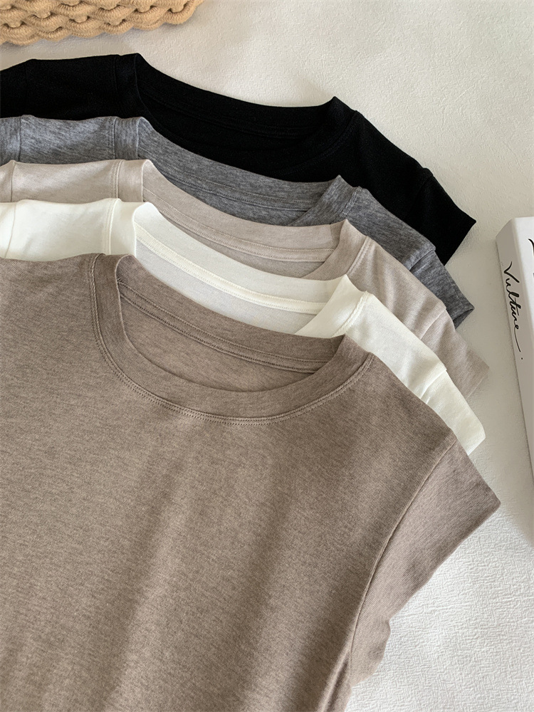 여름 새로운 라운드 넥 작은 플라잉 슬리브 티셔츠 소녀 얇은 슬림 핏 슬리밍 어깨 작은 짧은 소매베이스 탑스토어 가기