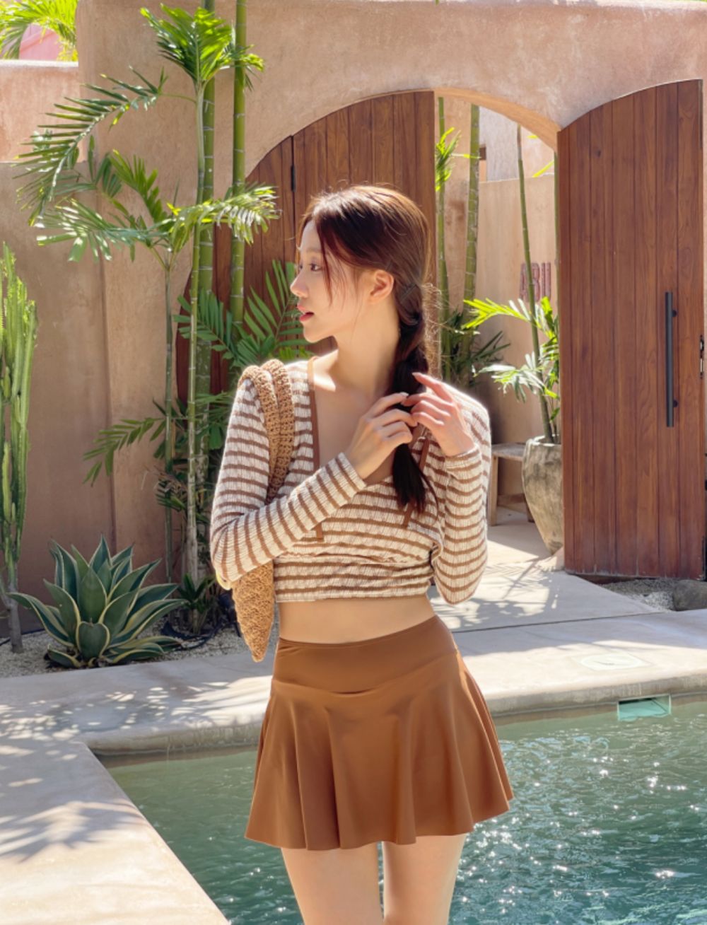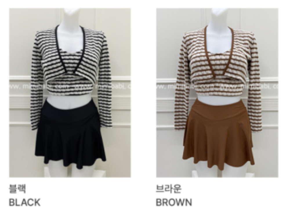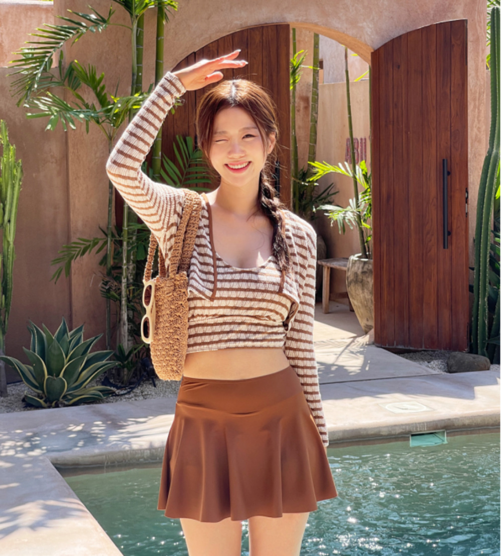 새로운 인터넷 동향 수영복 여성의 높은 허리 배꼽 덮음 줄무늬 긴 소매 태양 보호 고급 감각 보수적 분할 스커트 3 피스 세트