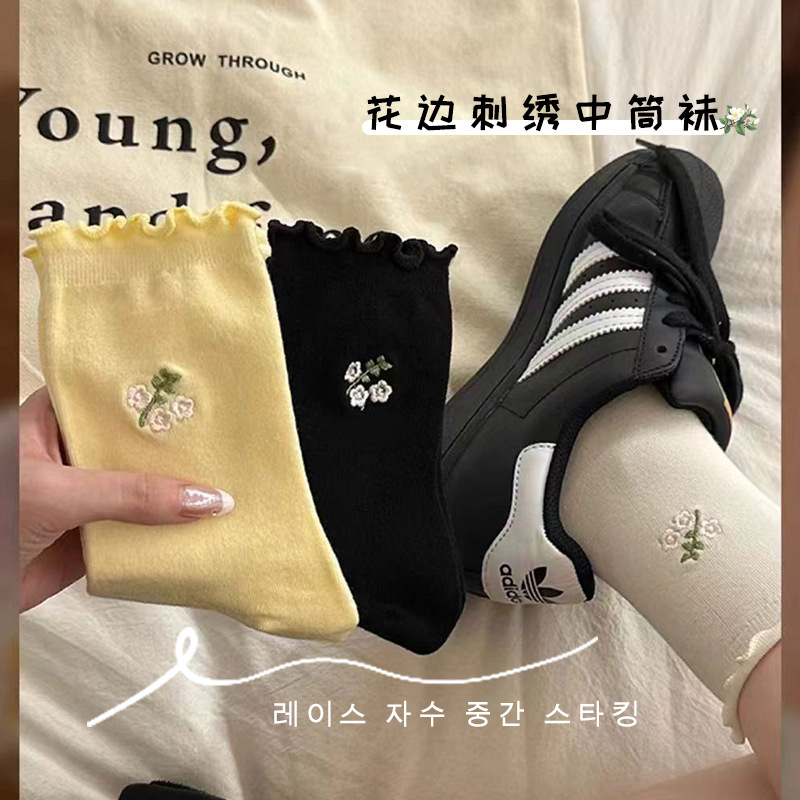 레이스 자수 미드 튜브 양말 올 매치 컴베드 코튼 양말 편안하고 통기성 한국 스타일 트렌디 귀여운 소녀의 스택 양말