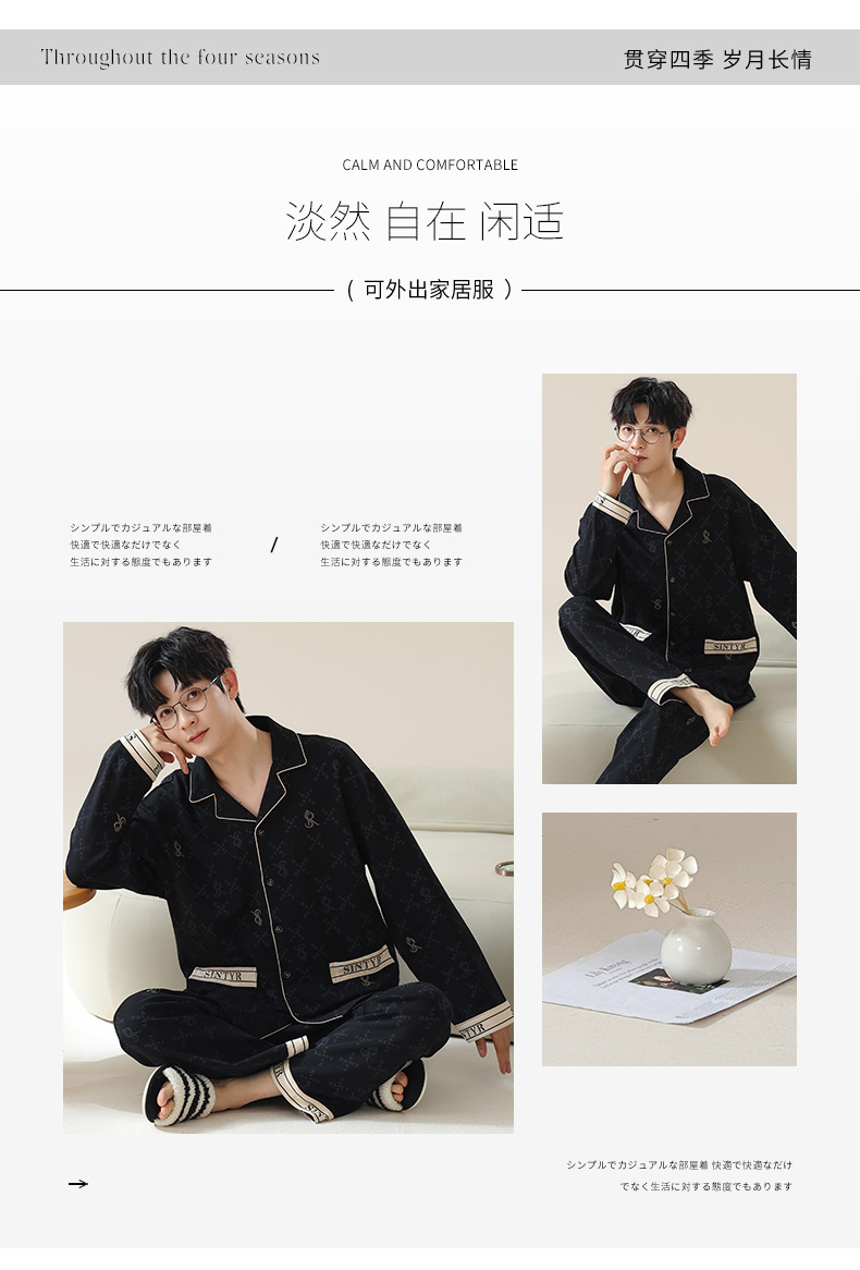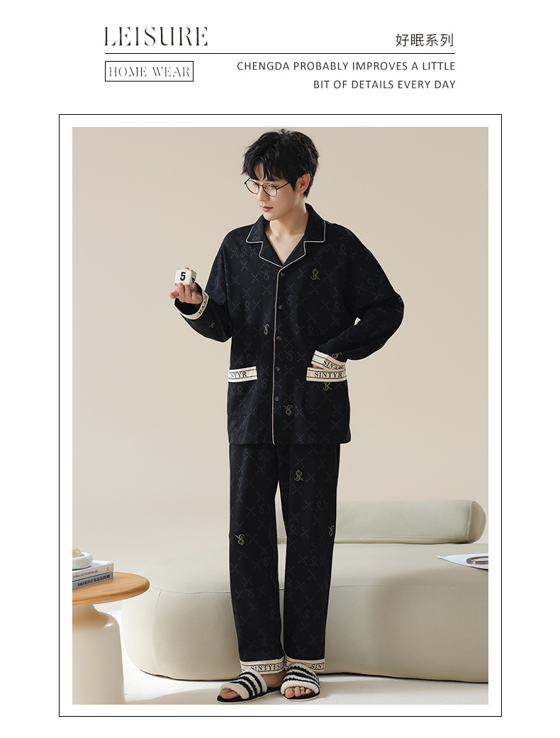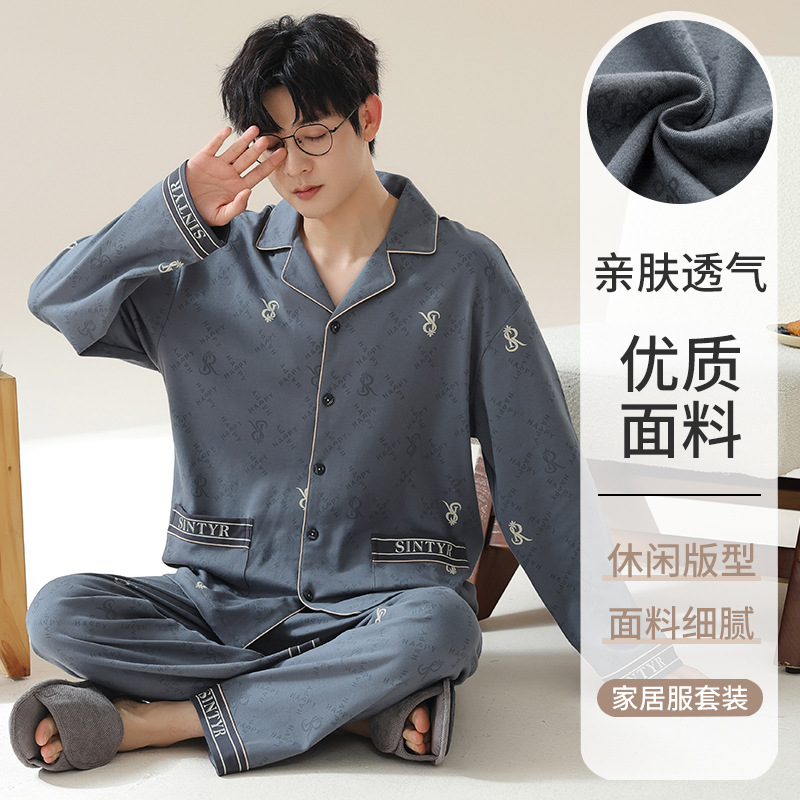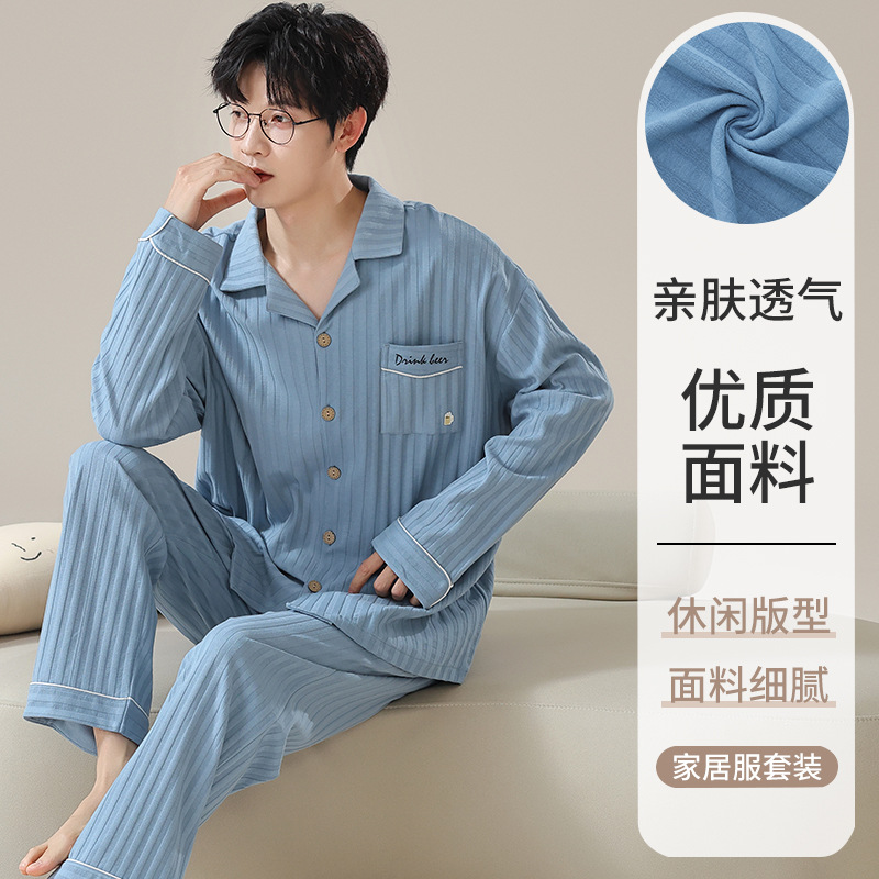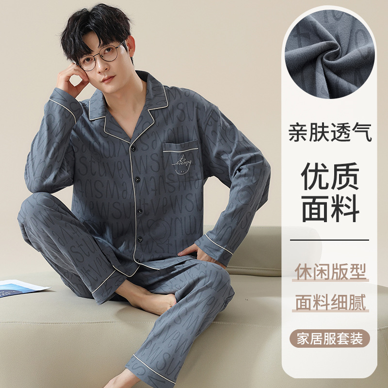 남자 잠옷 봄과 가을 니트 코튼 긴팔 카디건 세트 간단한 고급 청소년 느슨한 플러스 사이즈 홈 옷스토어 가기