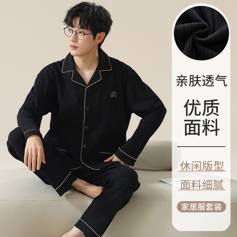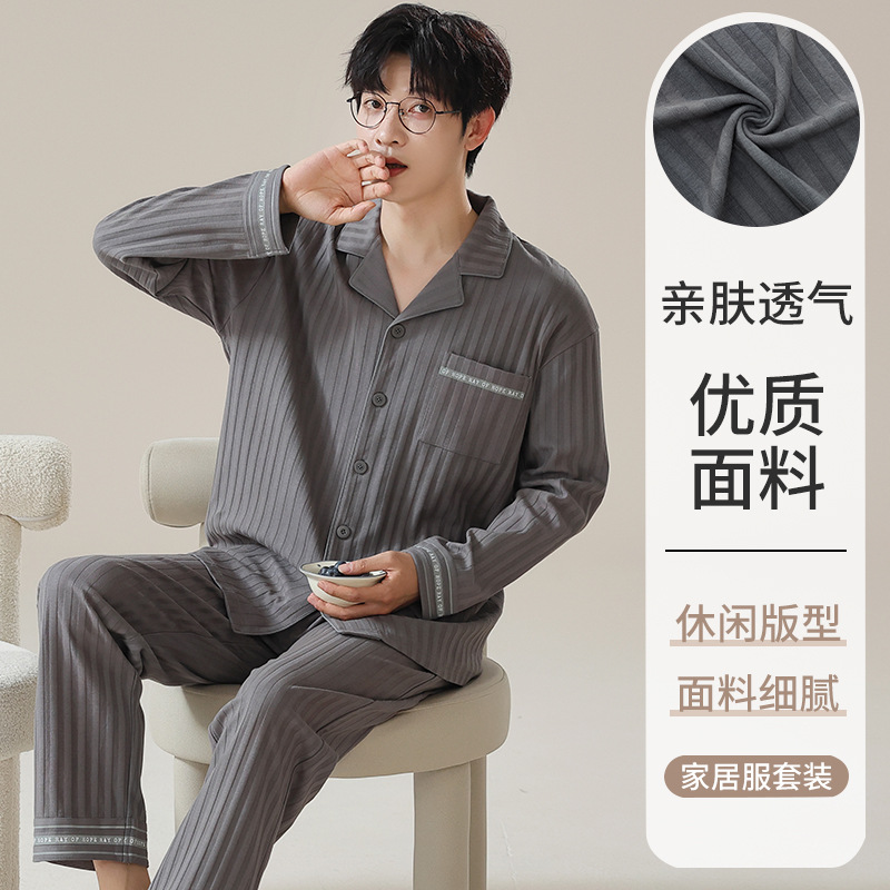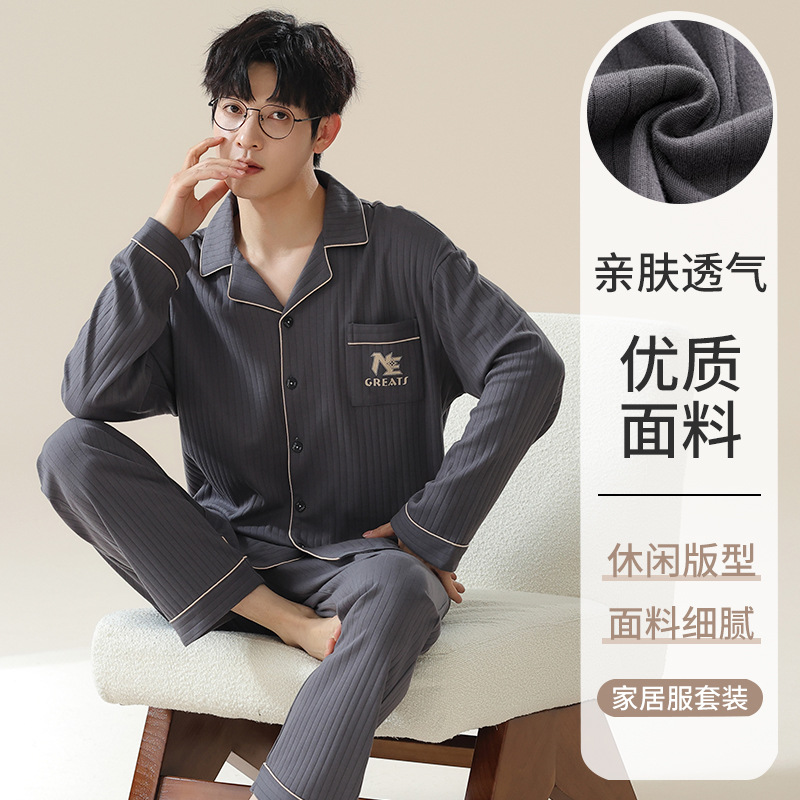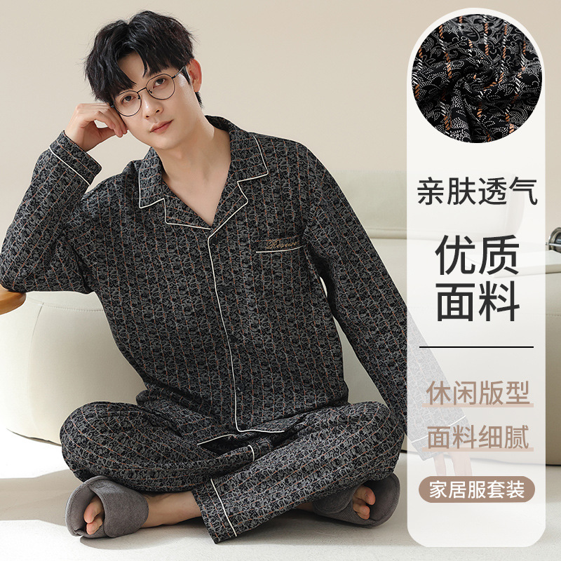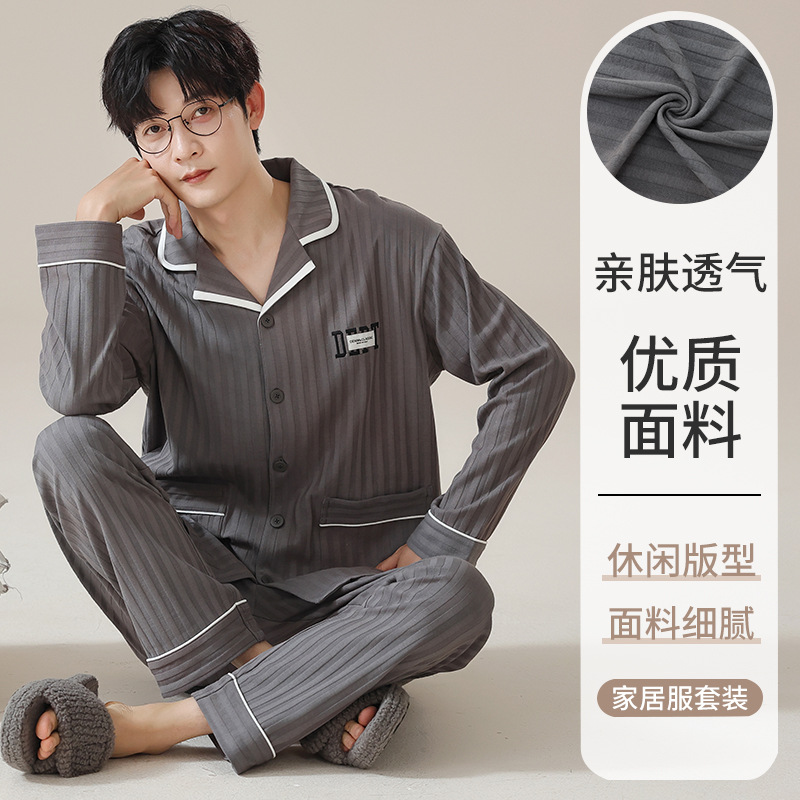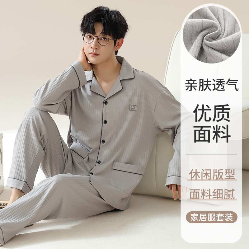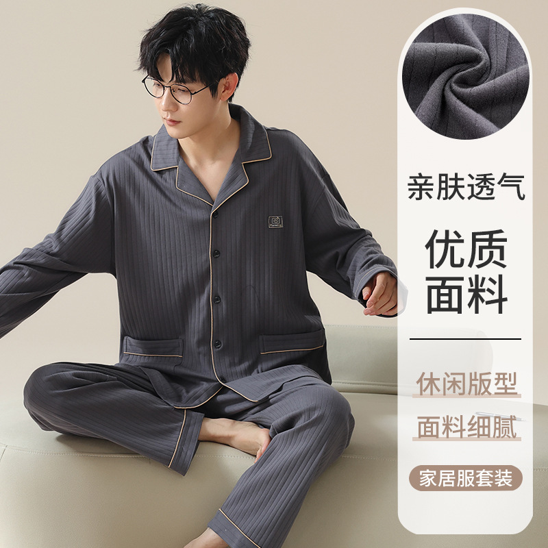 남자 잠옷 봄과 가을 니트 코튼 긴팔 카디건 세트 간단한 고급 청소년 느슨한 플러스 사이즈 홈 옷