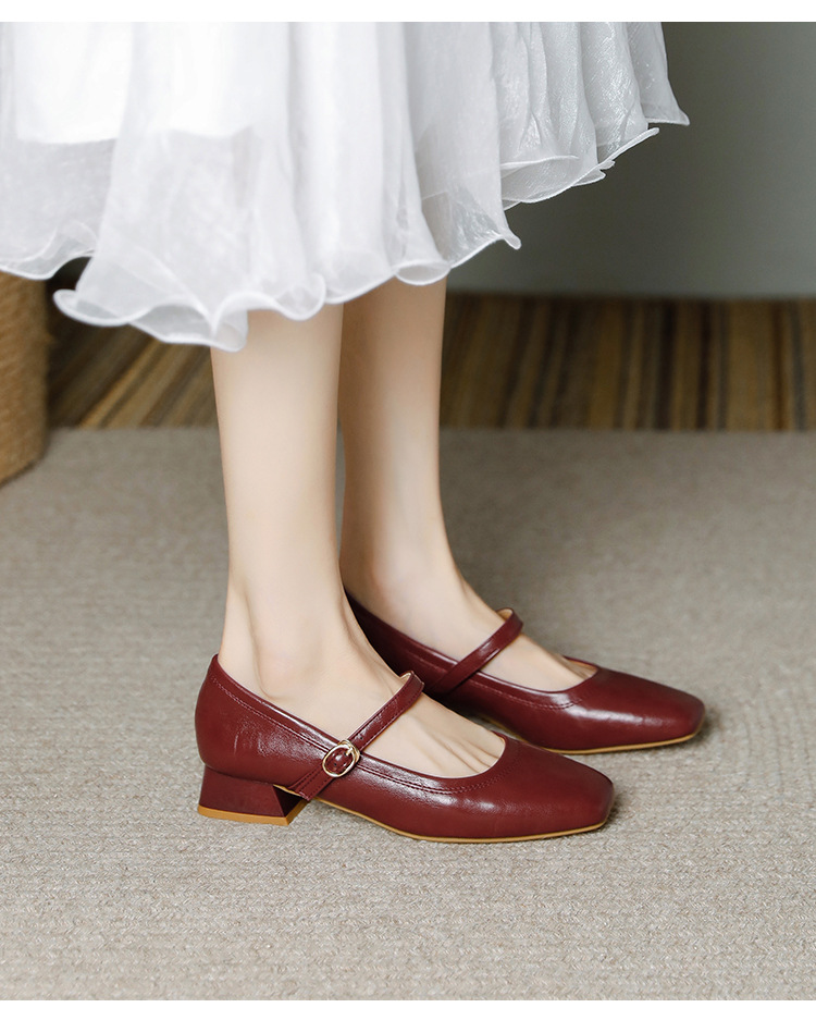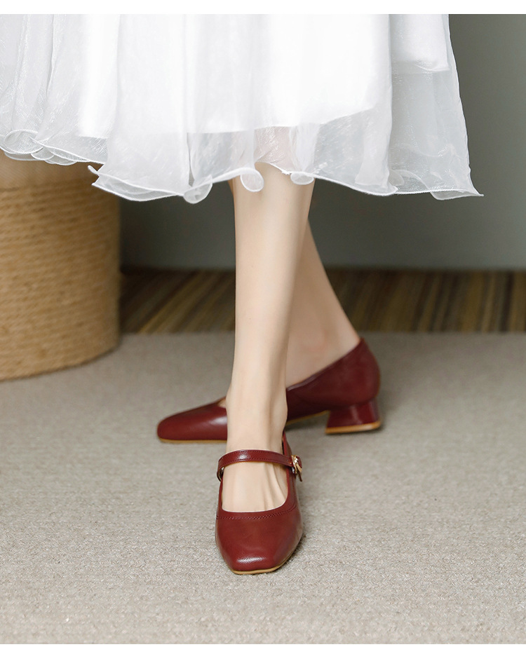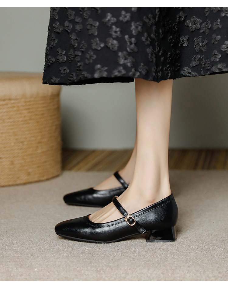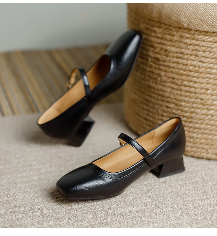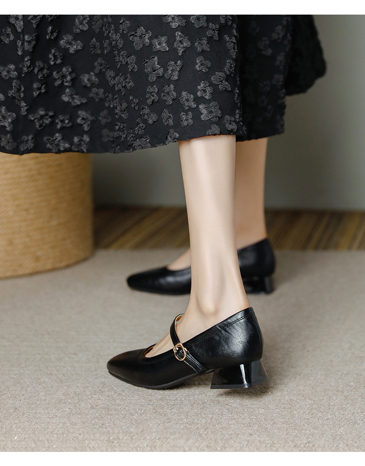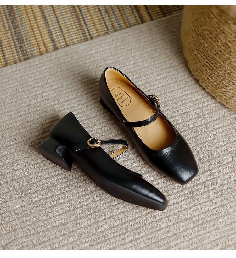 프랑스 정품 가죽 레트로 미니스트 스타일 싱글 레이어 신발 얕은 입 스퀘어 발가락 두꺼운 힐 버클 메리 제인 올 매치 미드 힐 여성 신발스토어 가기