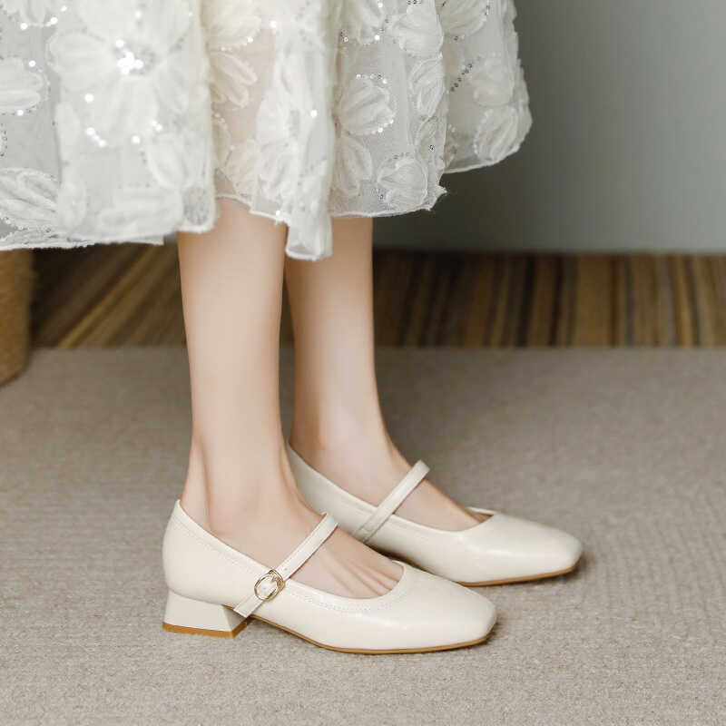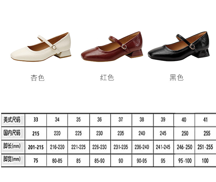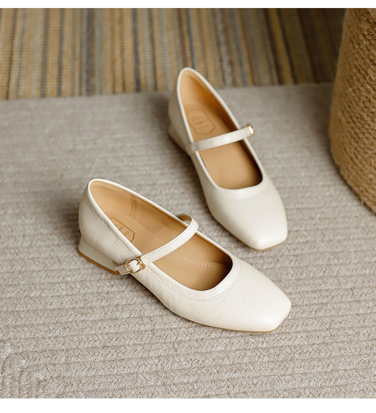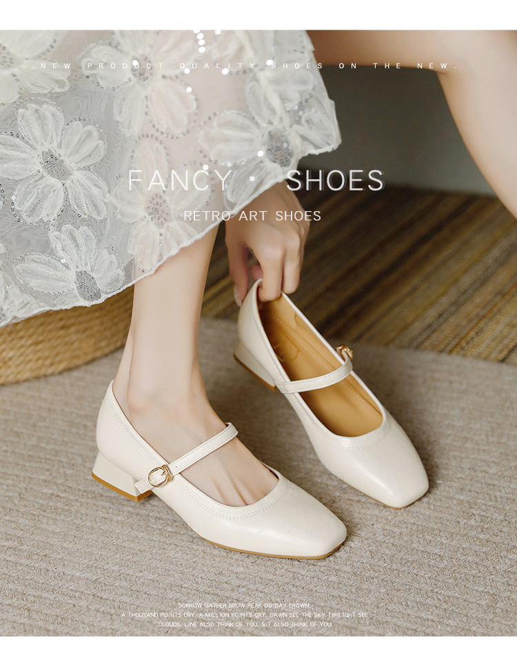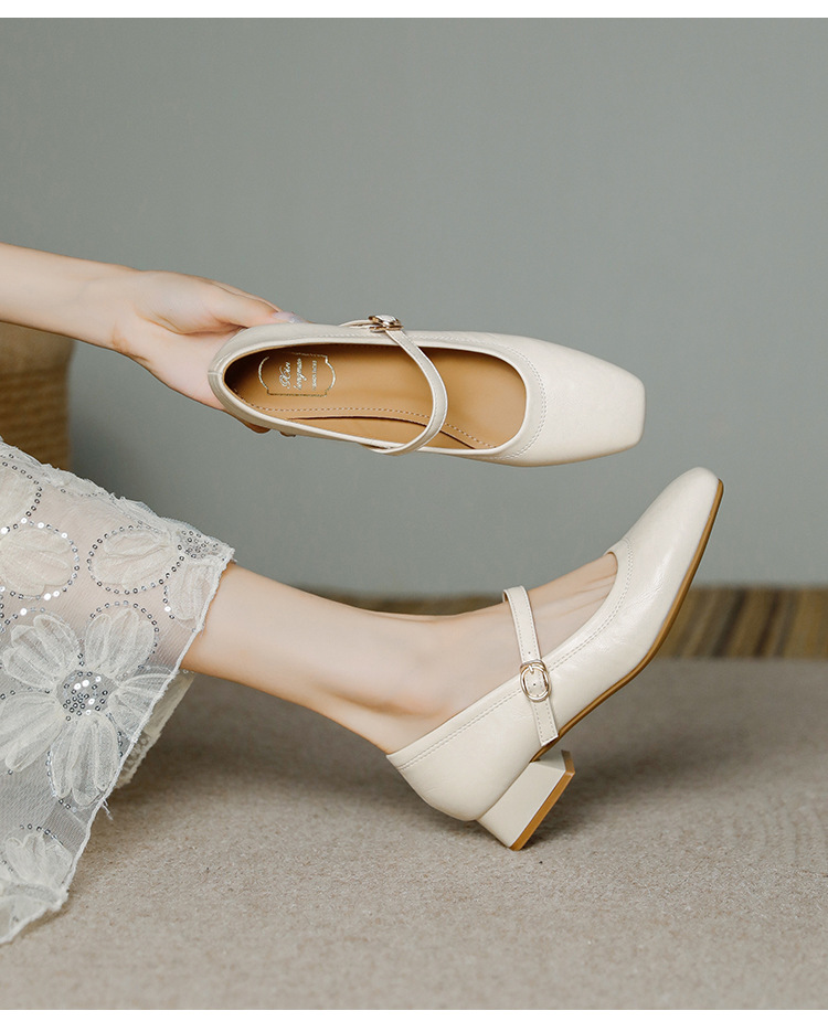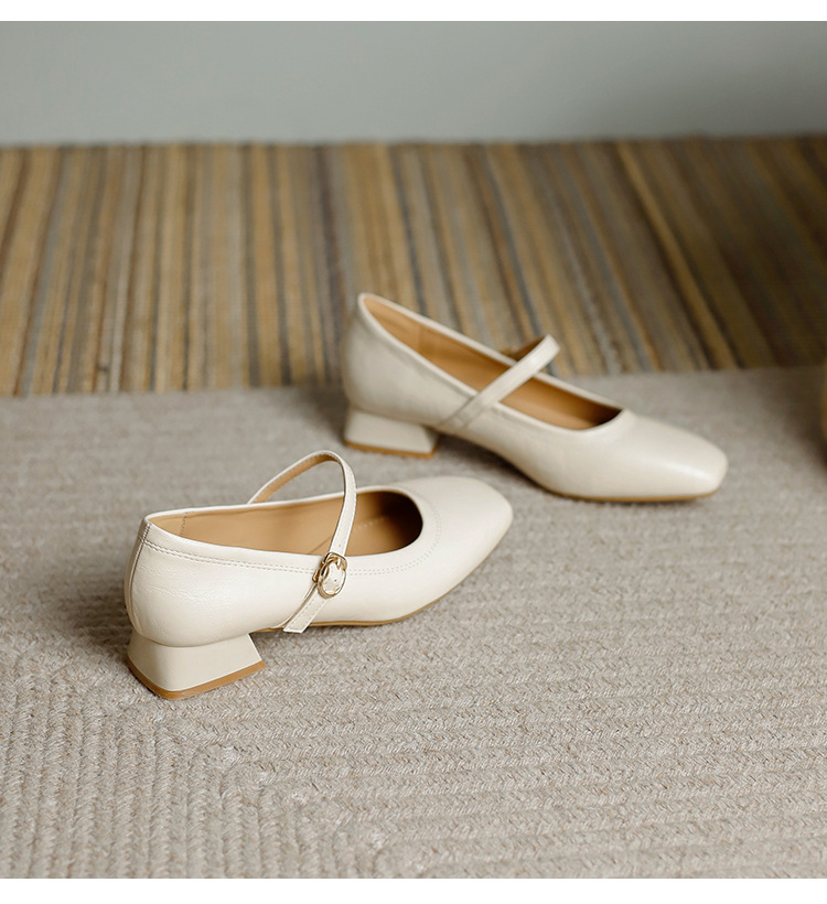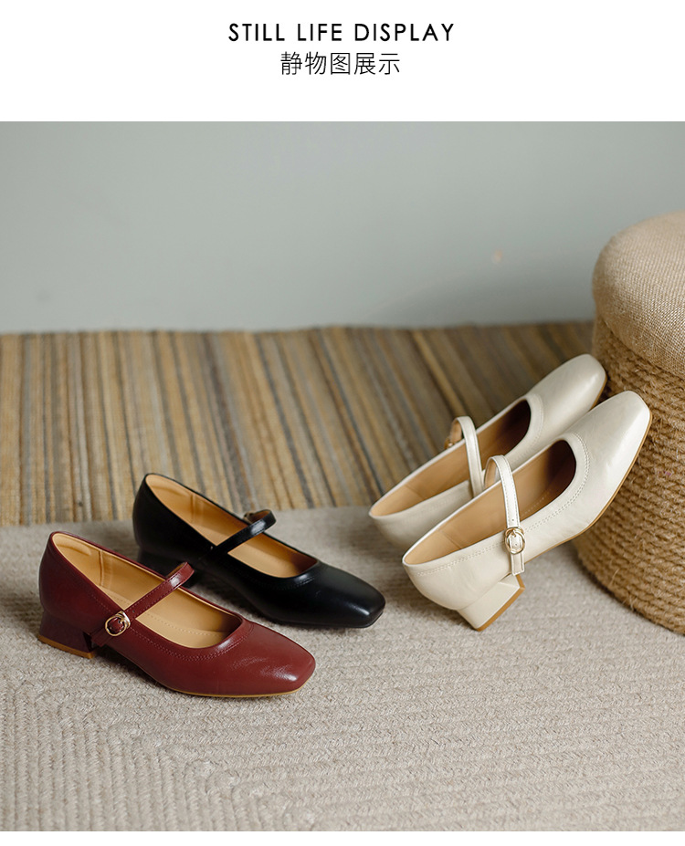 프랑스 정품 가죽 레트로 미니스트 스타일 싱글 레이어 신발 얕은 입 스퀘어 발가락 두꺼운 힐 버클 메리 제인 올 매치 미드 힐 여성 신발스토어 가기