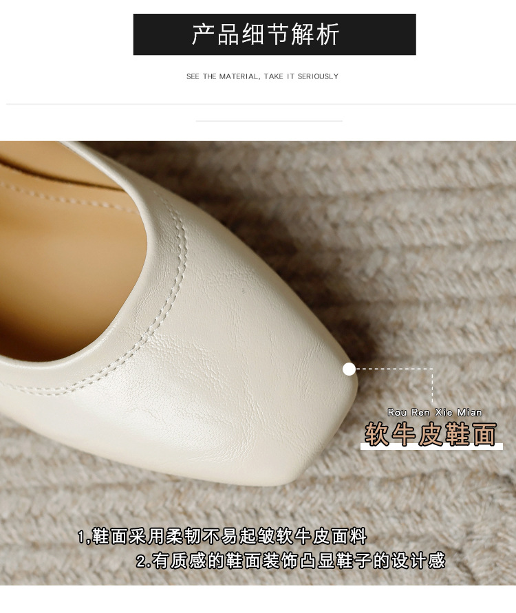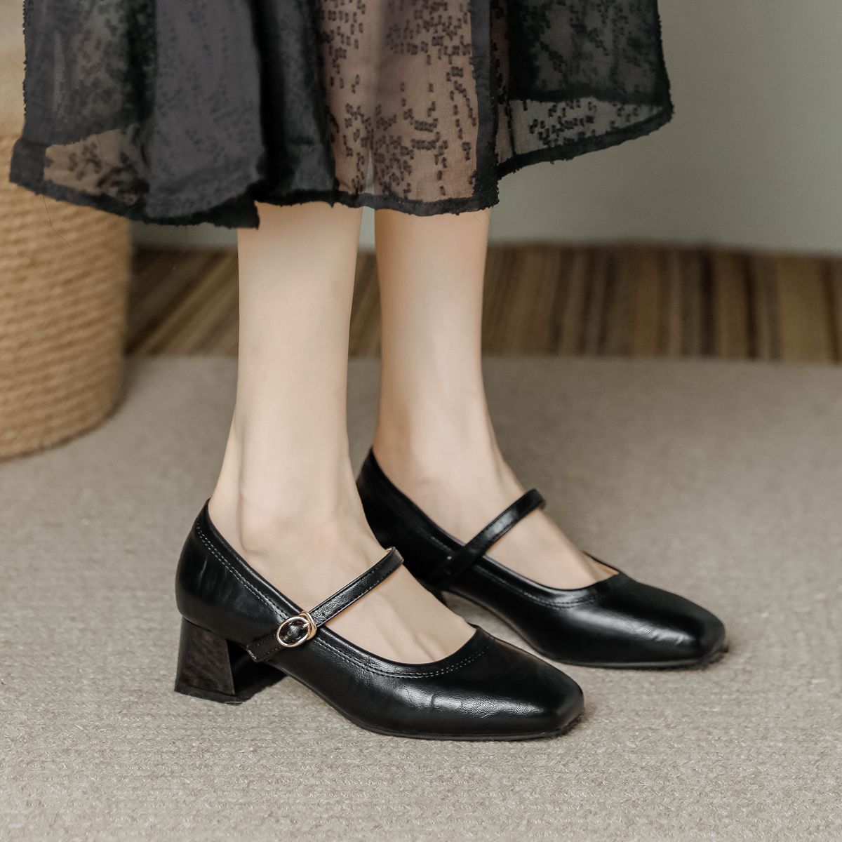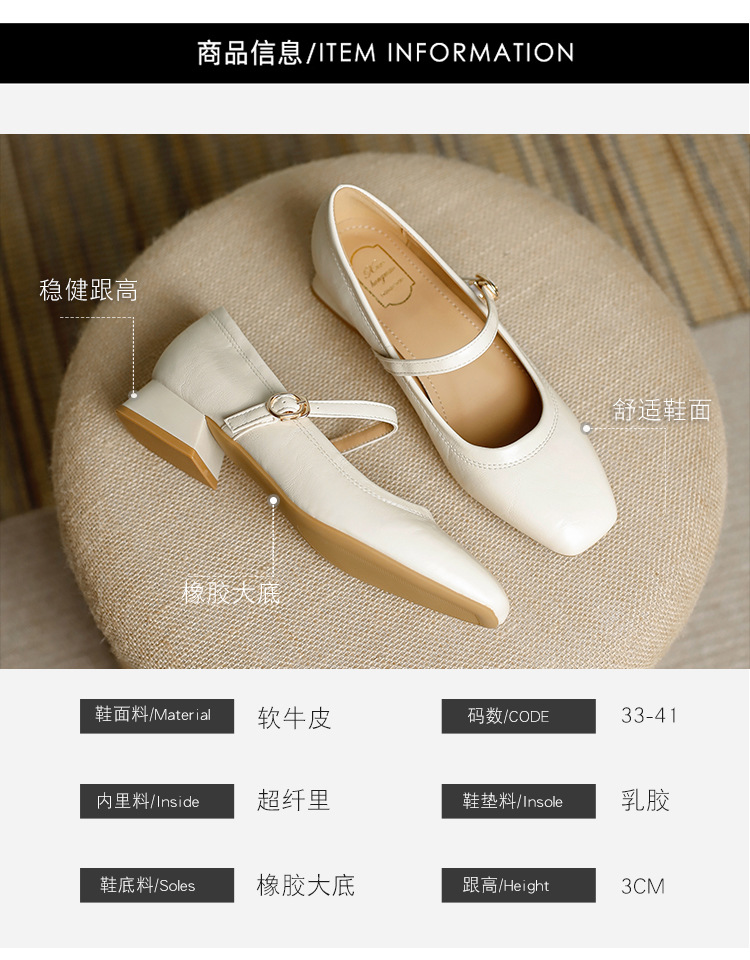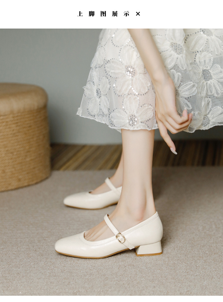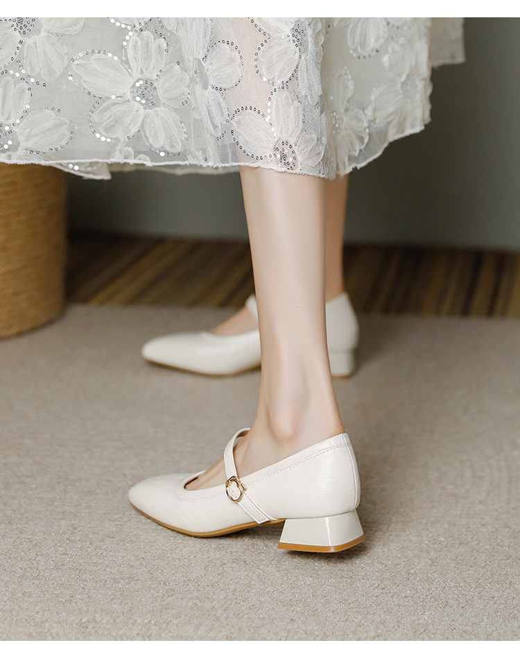 프랑스 정품 가죽 레트로 미니스트 스타일 싱글 레이어 신발 얕은 입 스퀘어 발가락 두꺼운 힐 버클 메리 제인 올 매치 미드 힐 여성 신발스토어 가기