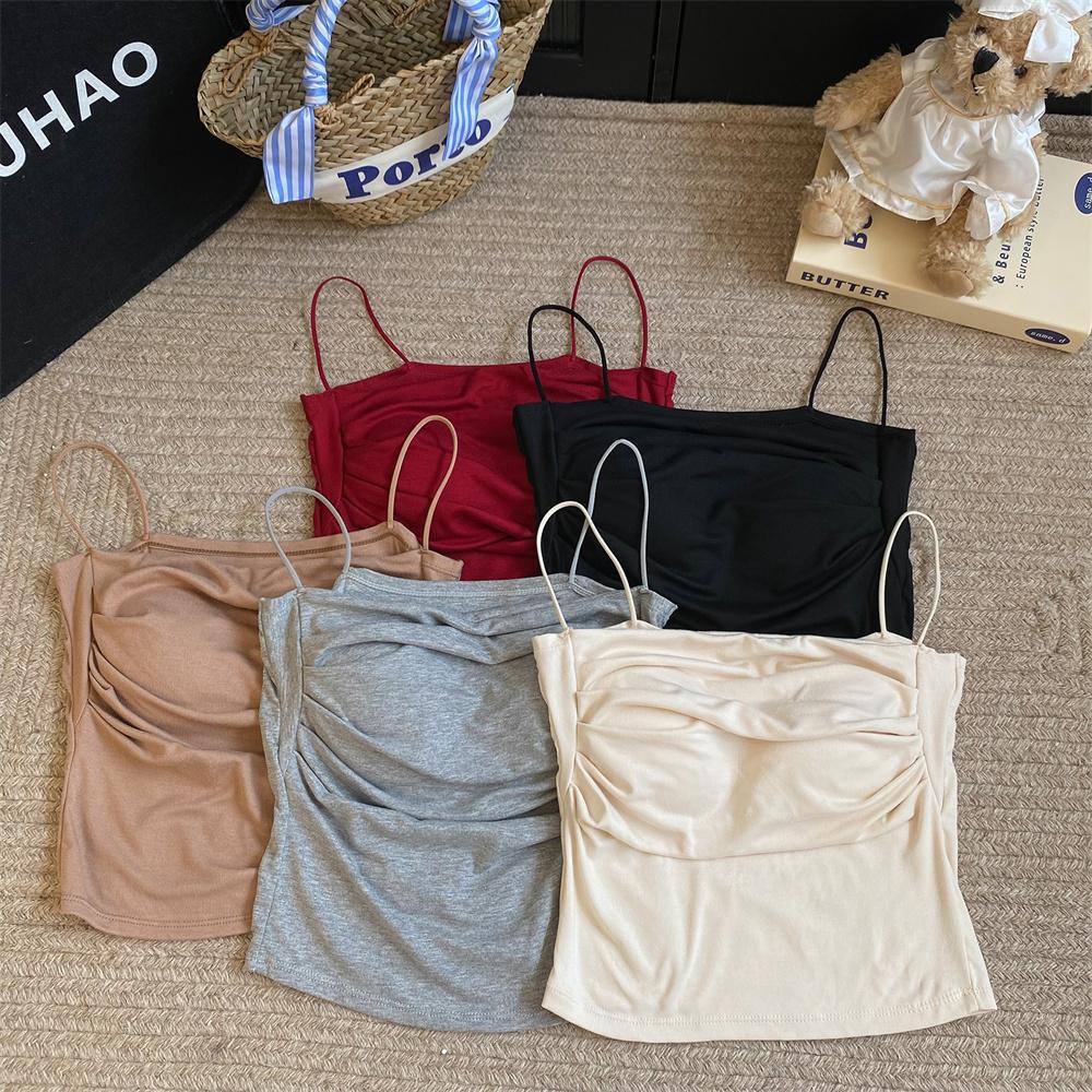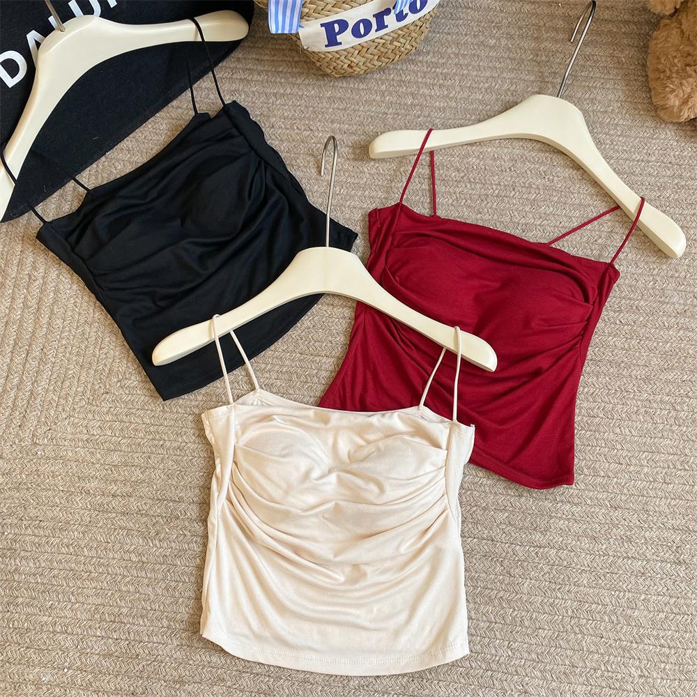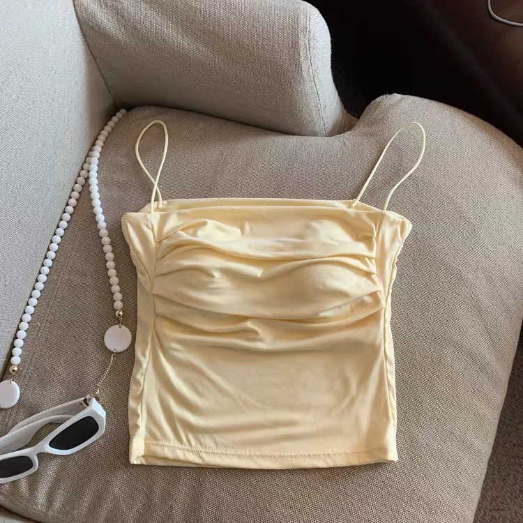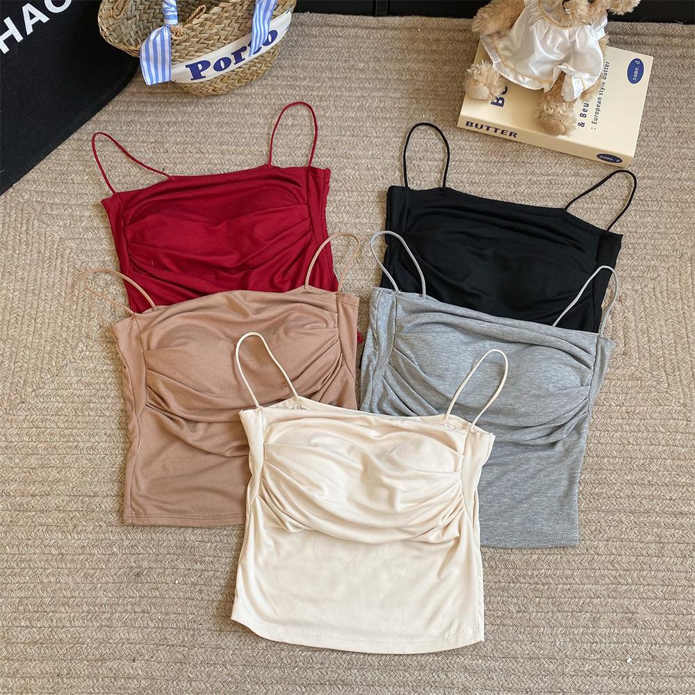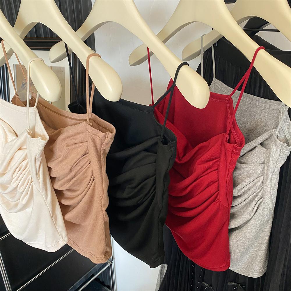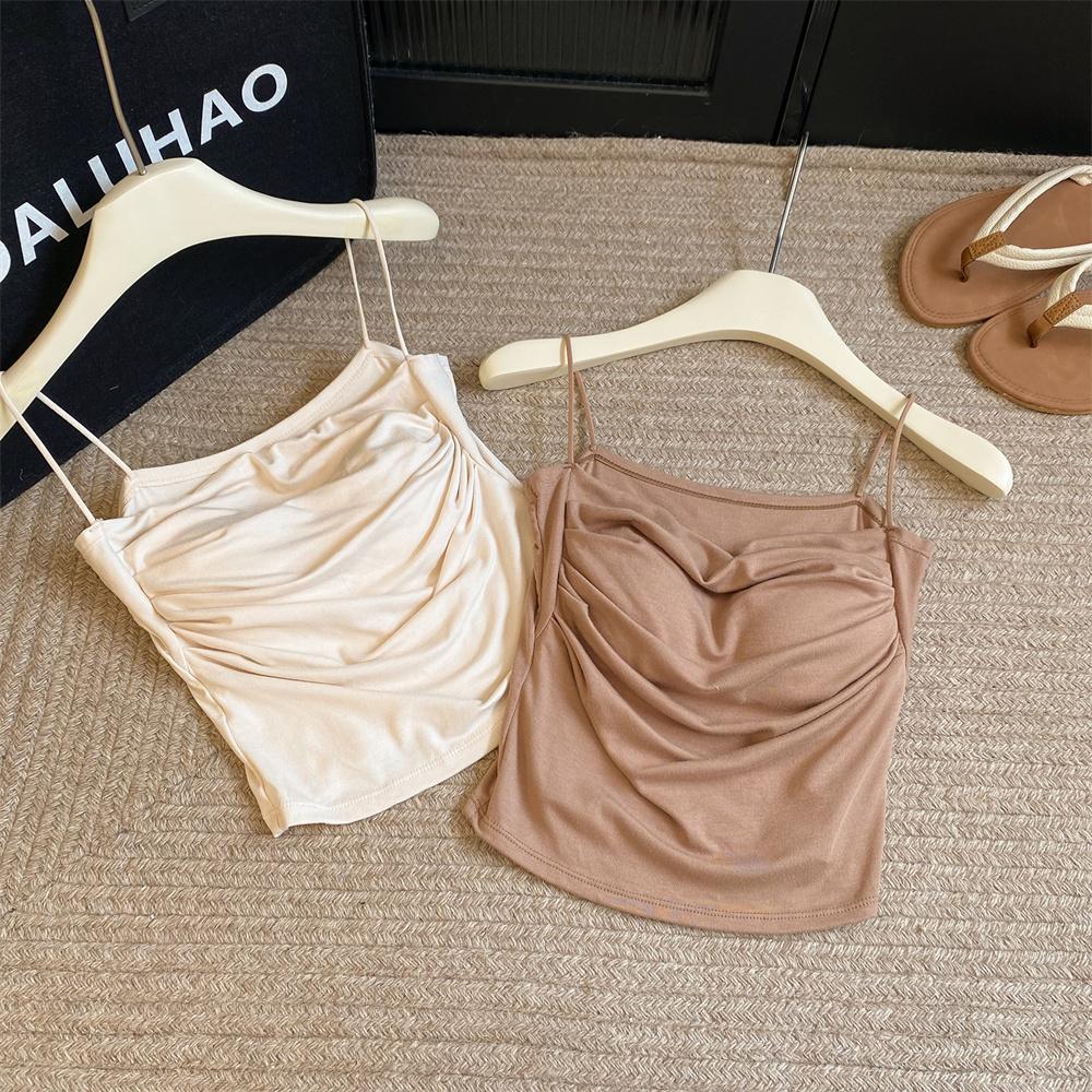 가슴 패드와 함께하는 Ins 고급 여름 슬링 여성의 짧은 한 줄 칼라 주름 니트 내부 섹시한 조끼 탑
