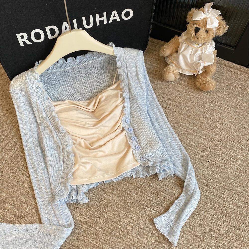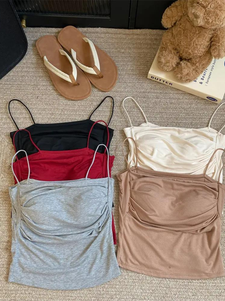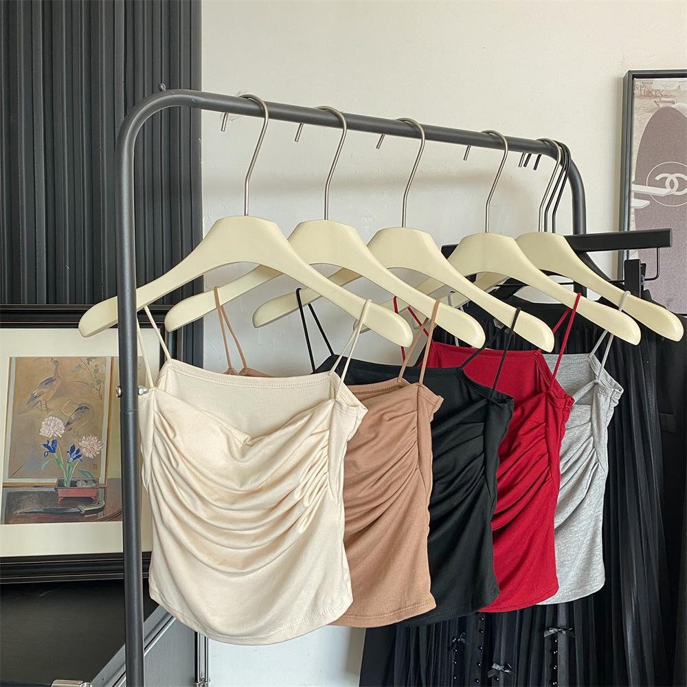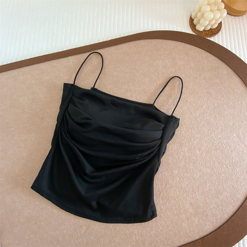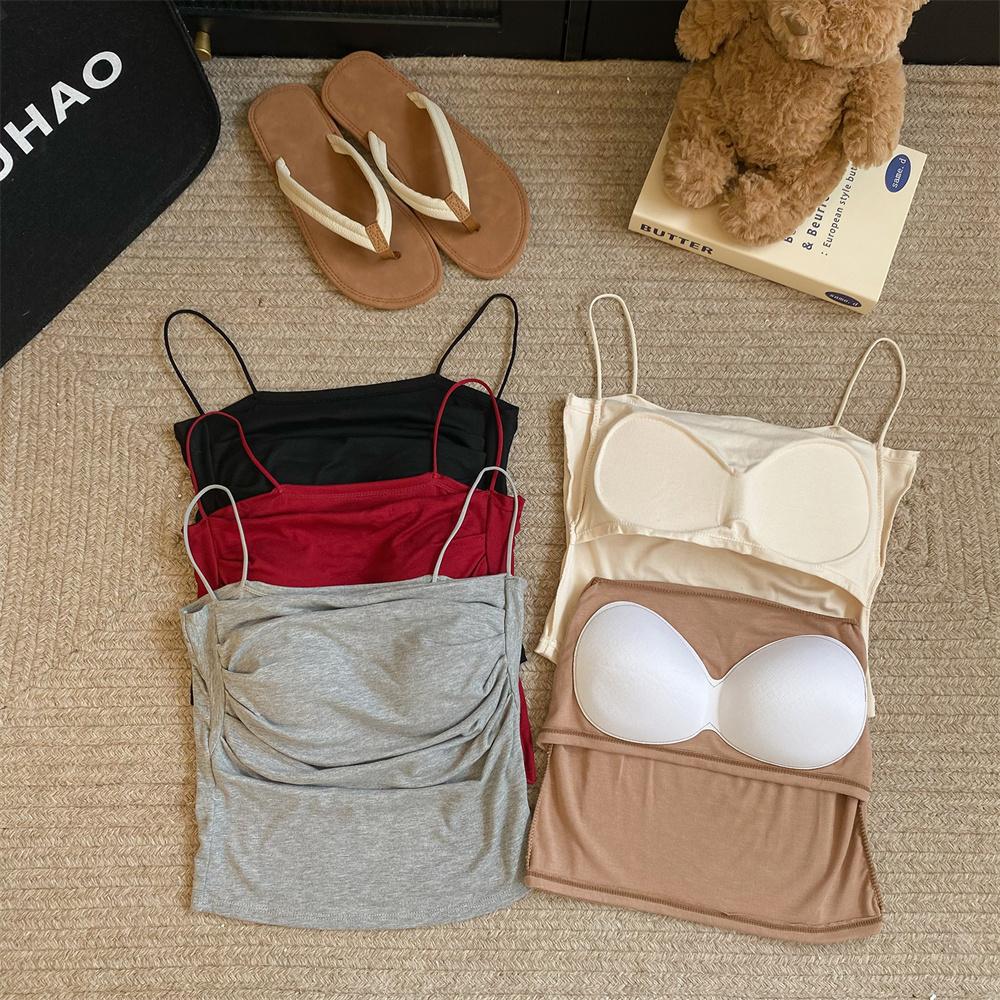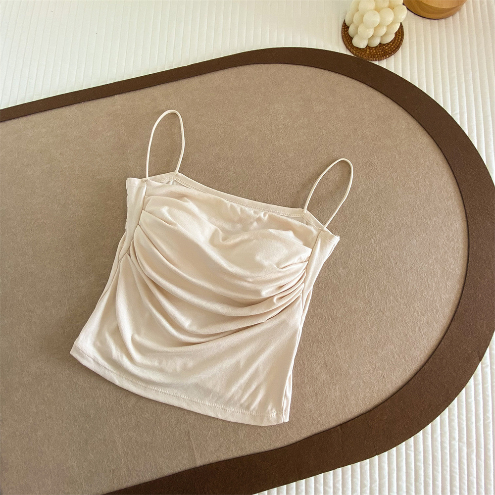 가슴 패드와 함께하는 Ins 고급 여름 슬링 여성의 짧은 한 줄 칼라 주름 니트 내부 섹시한 조끼 탑