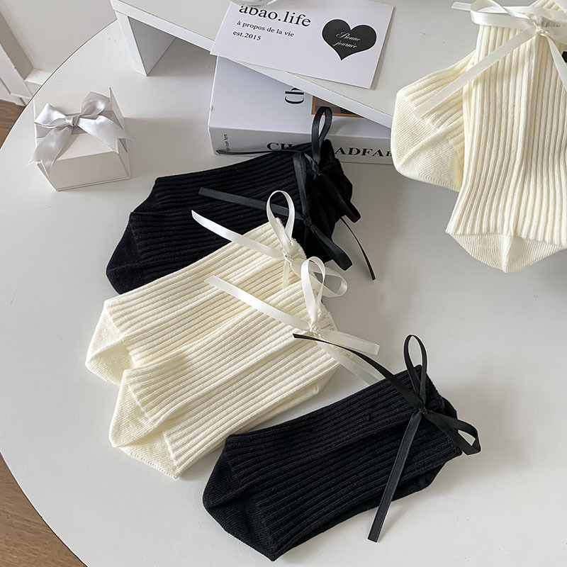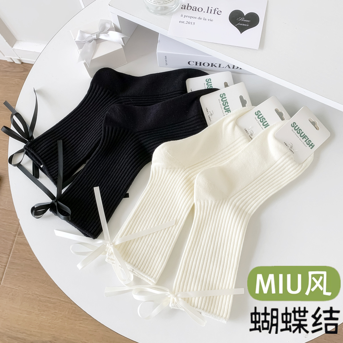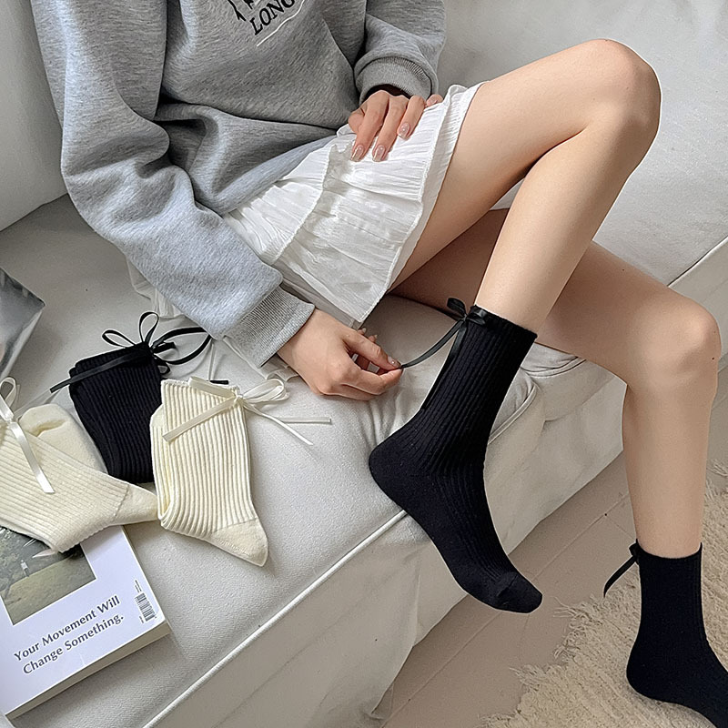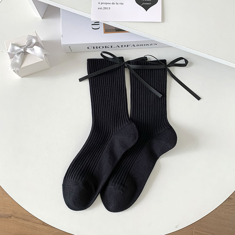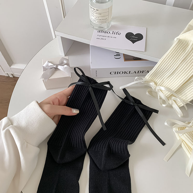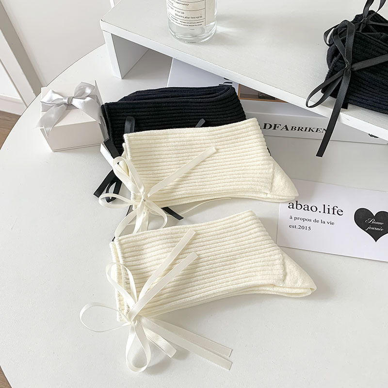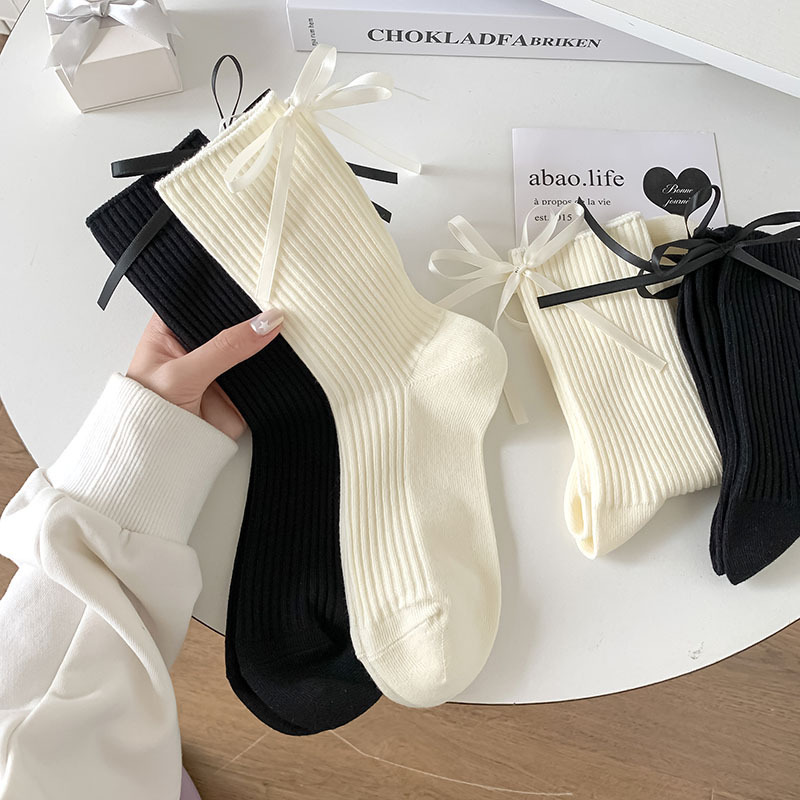 JK 양말 여성 가을 및 겨울 새로운 미드 튜브 더블 바늘 리본 활 여성 양말 한국 내부 흑백 발레 스타일 코튼 양말스토어 가기