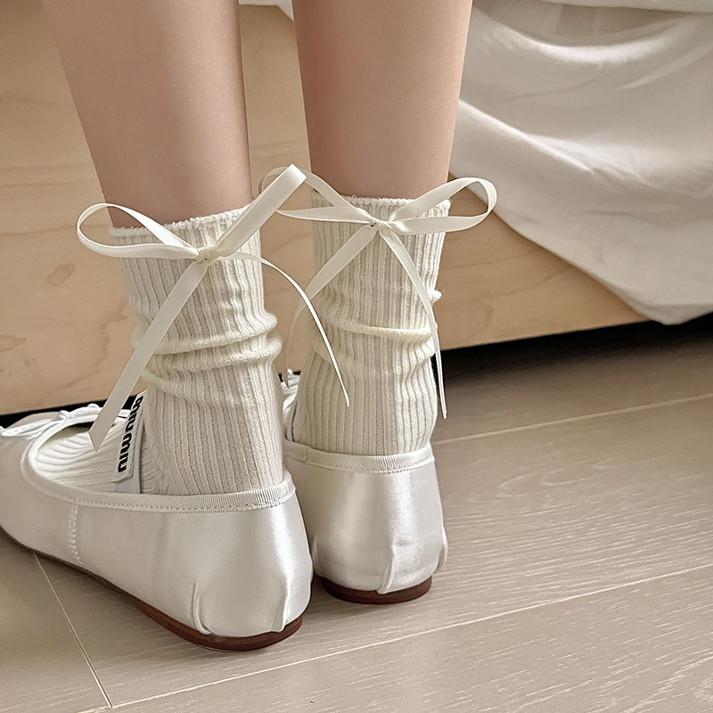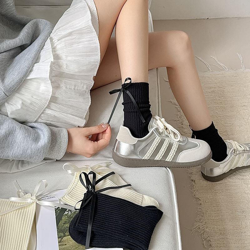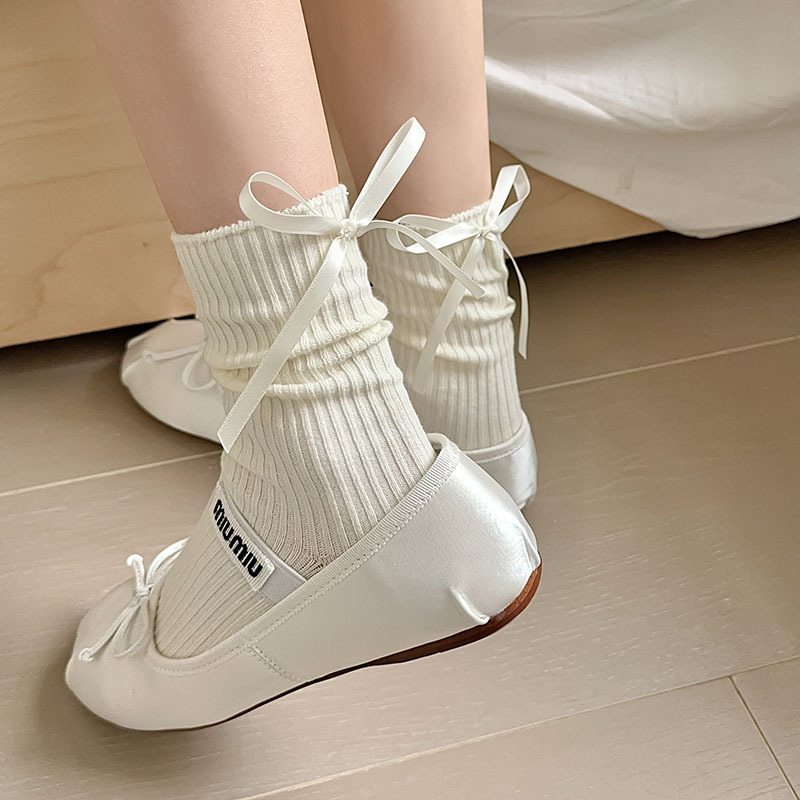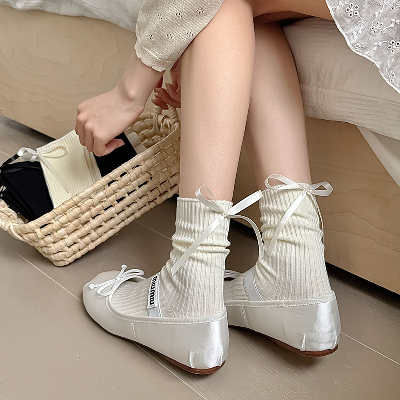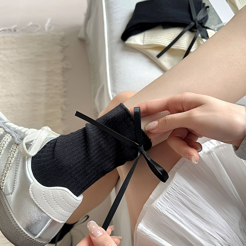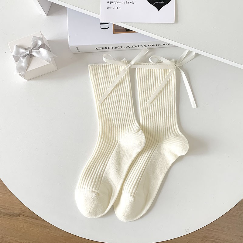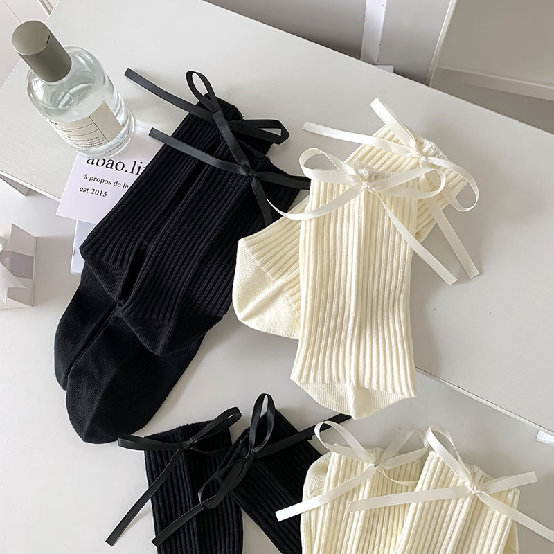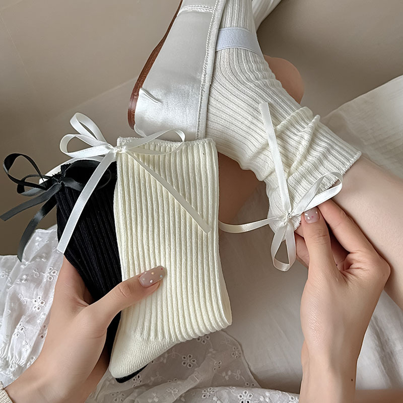 JK 양말 여성 가을 및 겨울 새로운 미드 튜브 더블 바늘 리본 활 여성 양말 한국 내부 흑백 발레 스타일 코튼 양말스토어 가기
