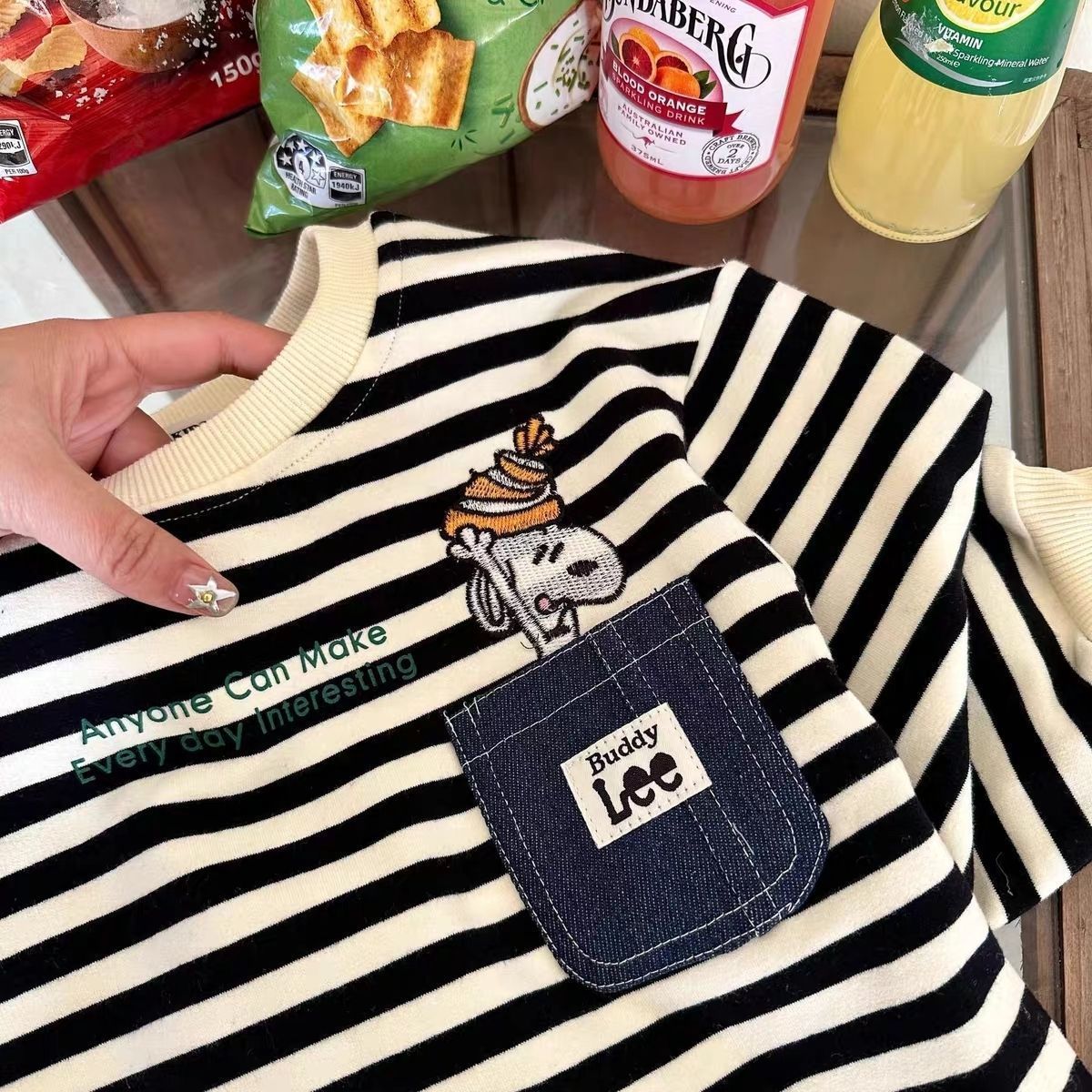 봄과 가을 새로운 만화 서양식 남성과 여성의 어린이 티셔츠 아기 포켓 스트라이프 긴 소매 스웨터베이스 셔츠스토어 가기