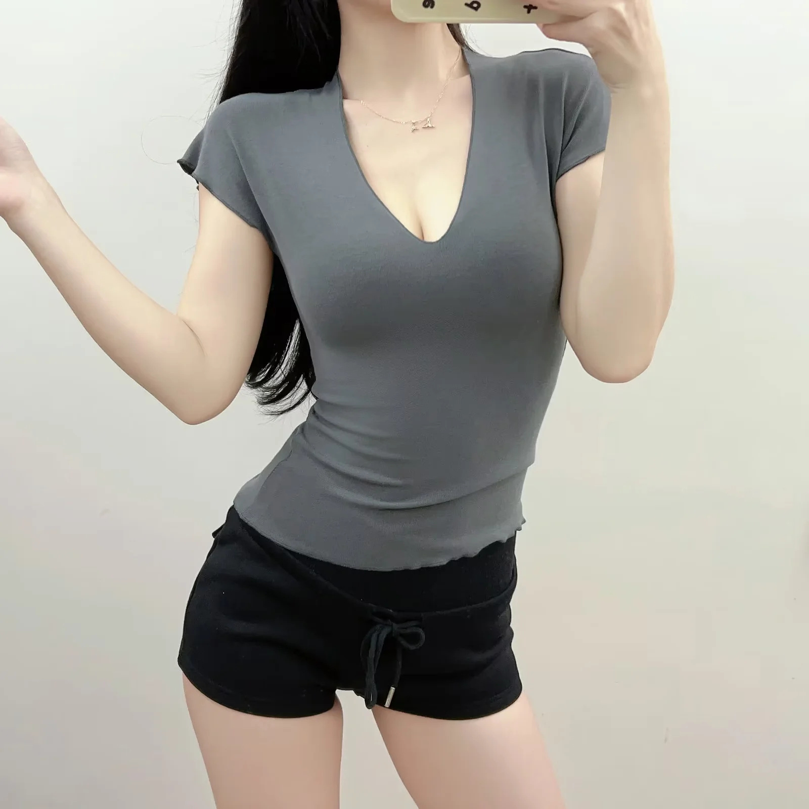 유럽과 미국의 순수한 욕망 깊은 V-Neck 귀 티셔츠 여성용 프랑스 틈새 섹시 스트레치 터트 아웃 바텀 반팔 탑 착용스토어 가기