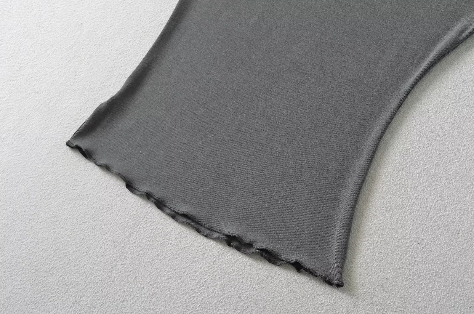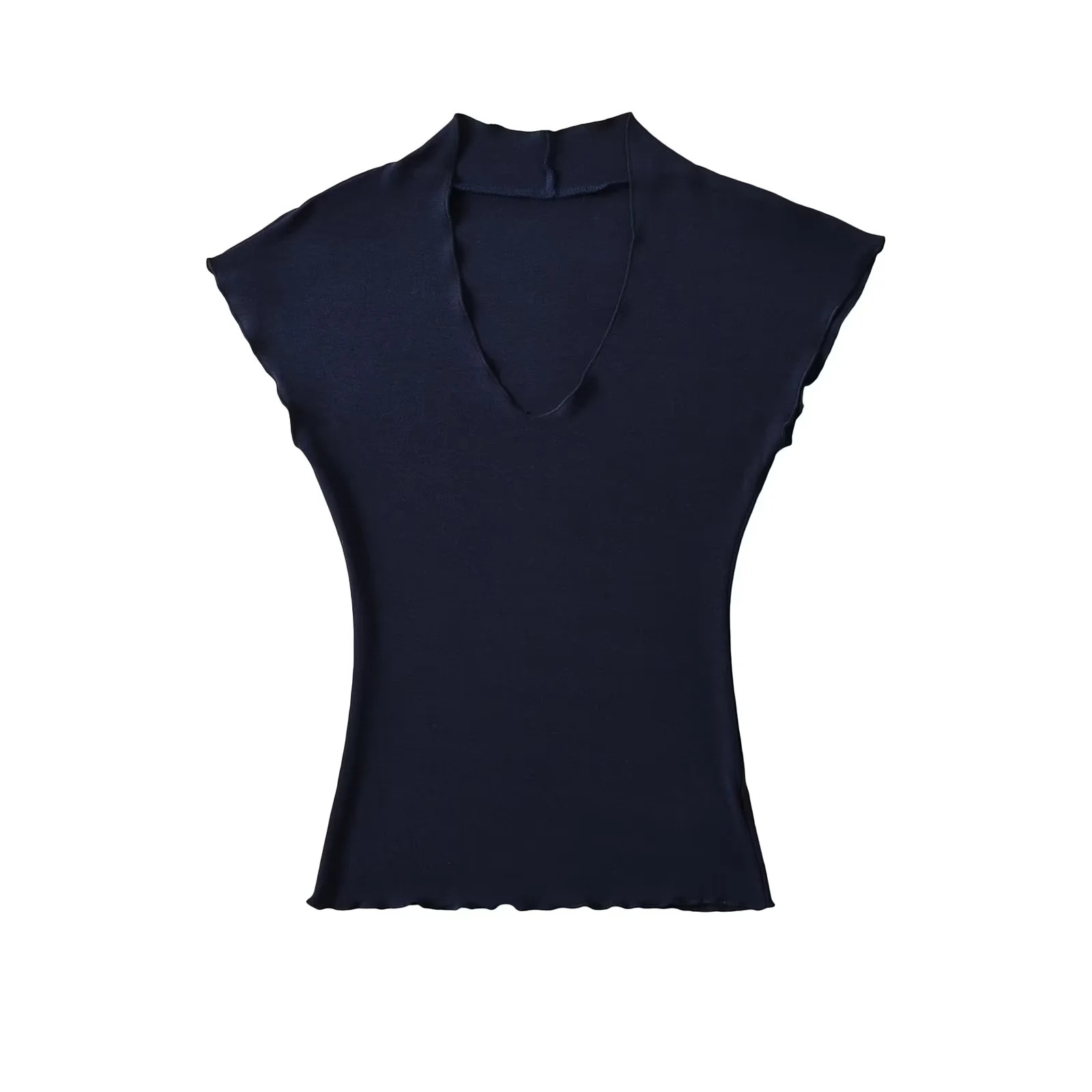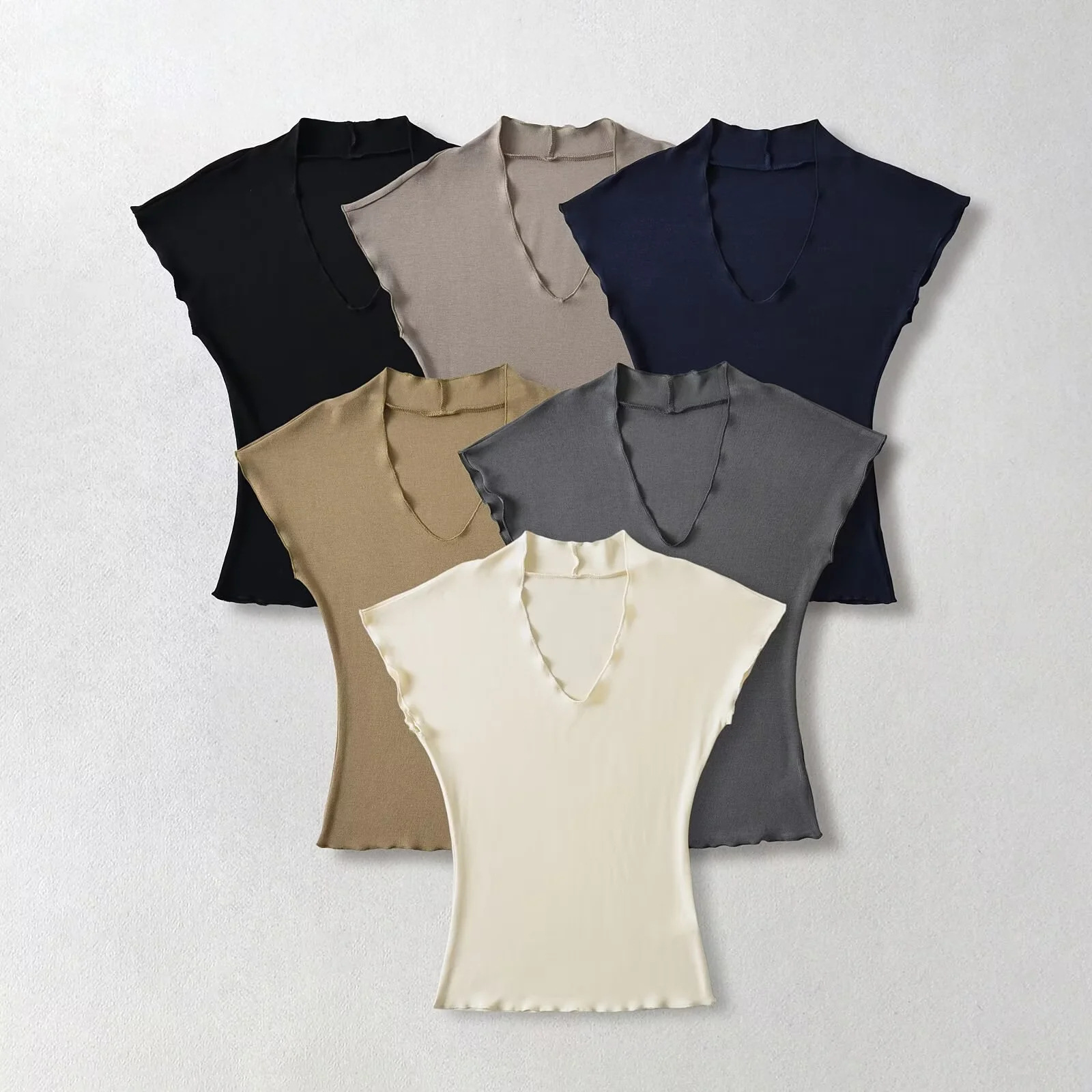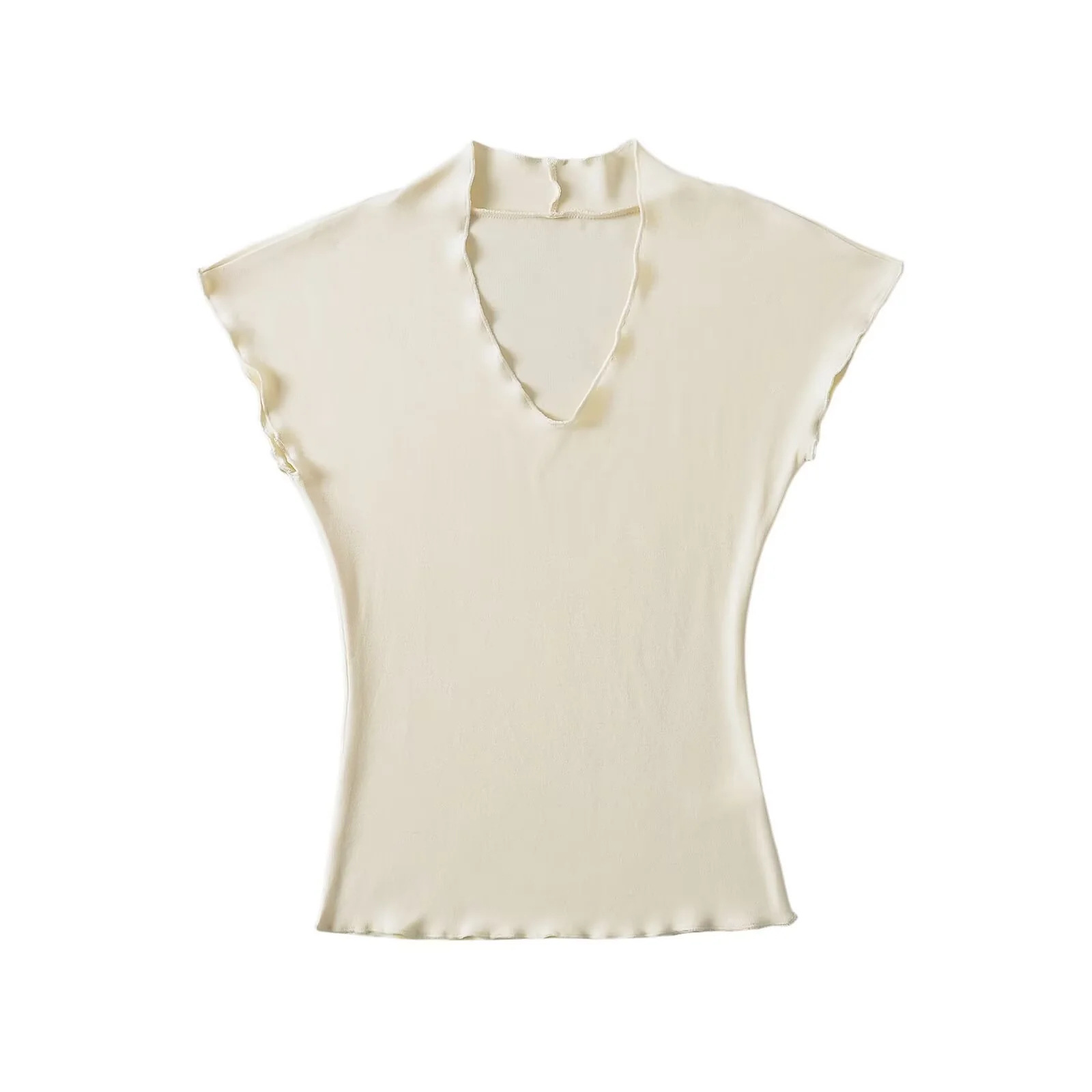 유럽과 미국의 순수한 욕망 깊은 V-Neck 귀 티셔츠 여성용 프랑스 틈새 섹시 스트레치 터트 아웃 바텀 반팔 탑 착용