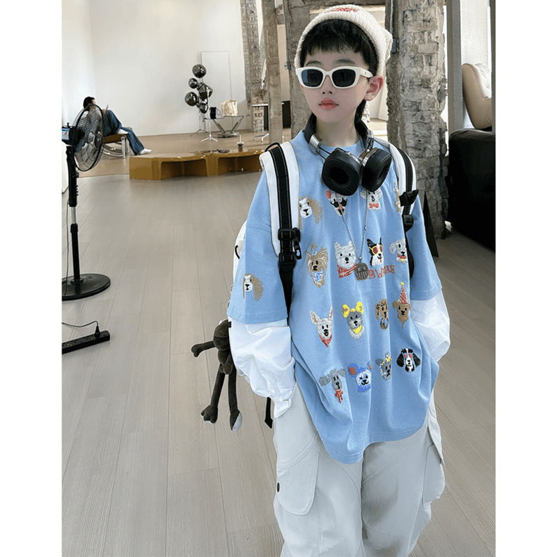 남학생 '2024 가을 아기 하늘 푸른 강아지 인쇄 가짜 투피스 긴팔 티셔츠 중 큰 어린이를위한 유행 탑