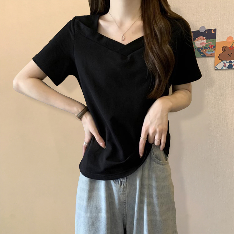 여성을위한 v 넥 반팔 티셔츠 여름 새로운 느슨한 슬림 솔리드 컬러 학생 핫 소녀 쇄골 탑 디자인스토어 가기