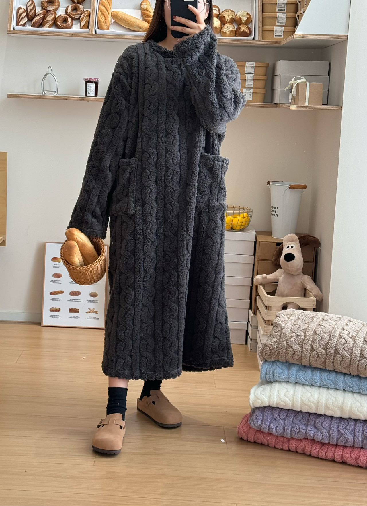 파자마 여성 겨울 플란넬 나이트가운 여성의 가을과 겨울 따뜻한 중간 길이의 산호 양털 귀여운 두꺼운 한국어 스타일스토어 가기