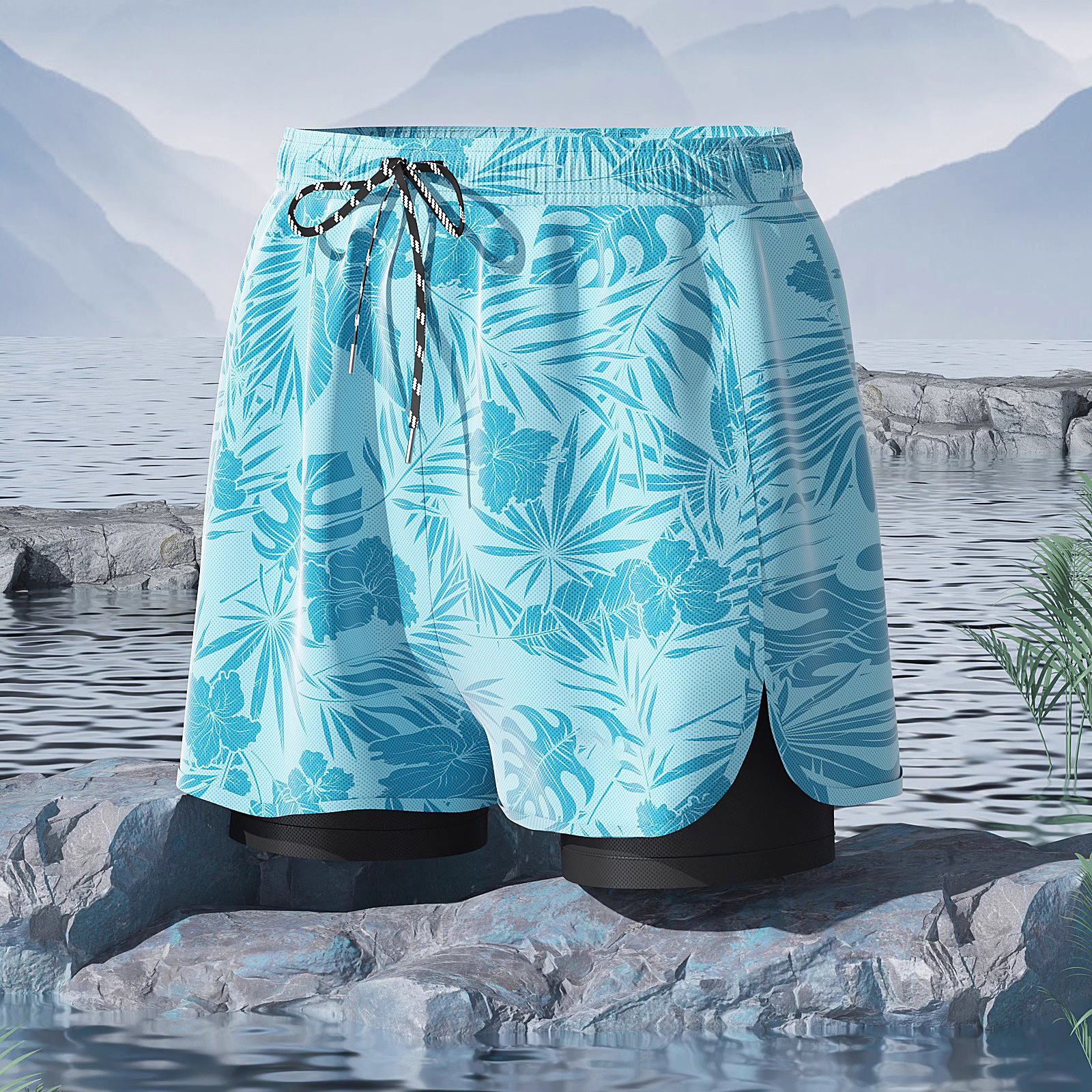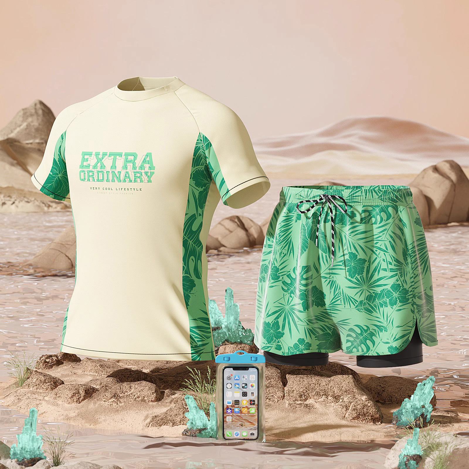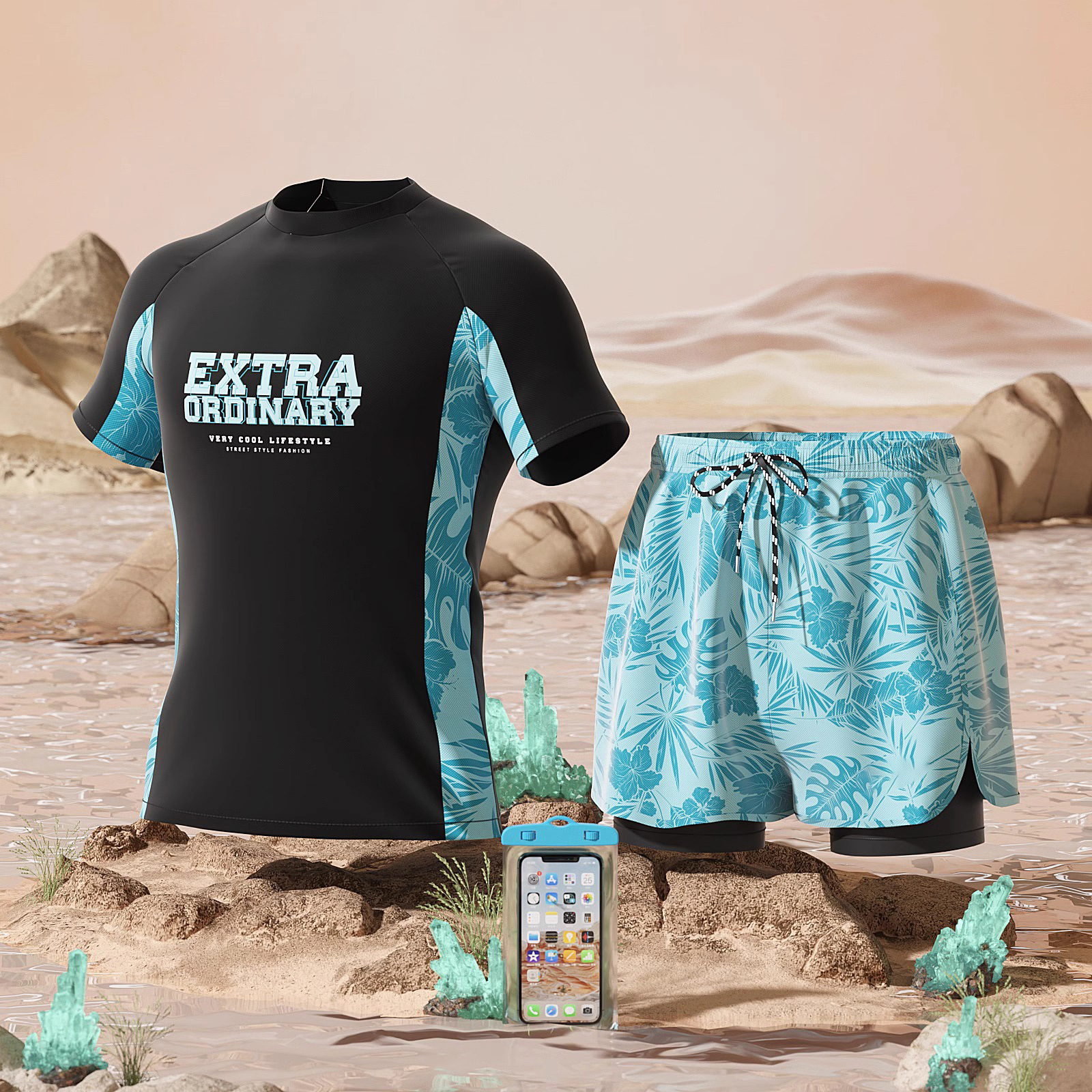 수영복 남성용 패셔너블 캐주얼 탄성 부드러운 통기성 빠른 건조 플러스 사이즈 인쇄 된 짧은 2 피스 온천 세트