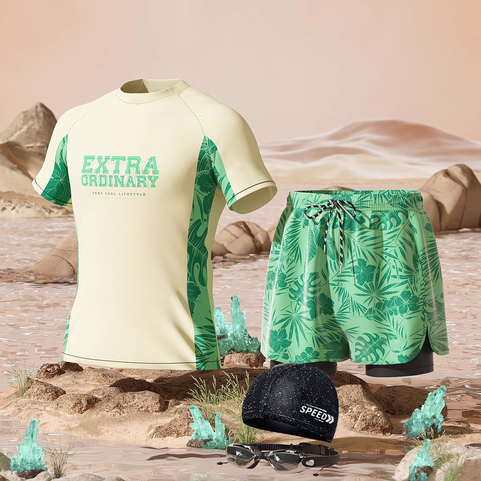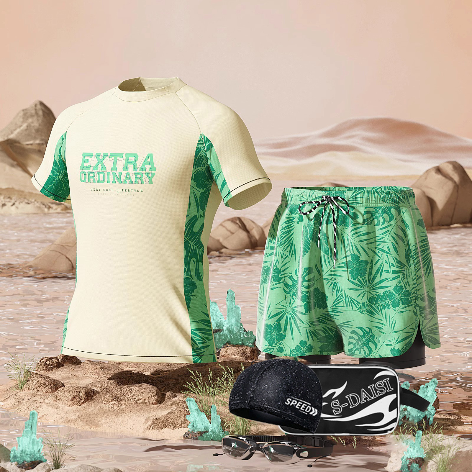 • 베이지색 꽃무늬 슈트 + 수영 고글