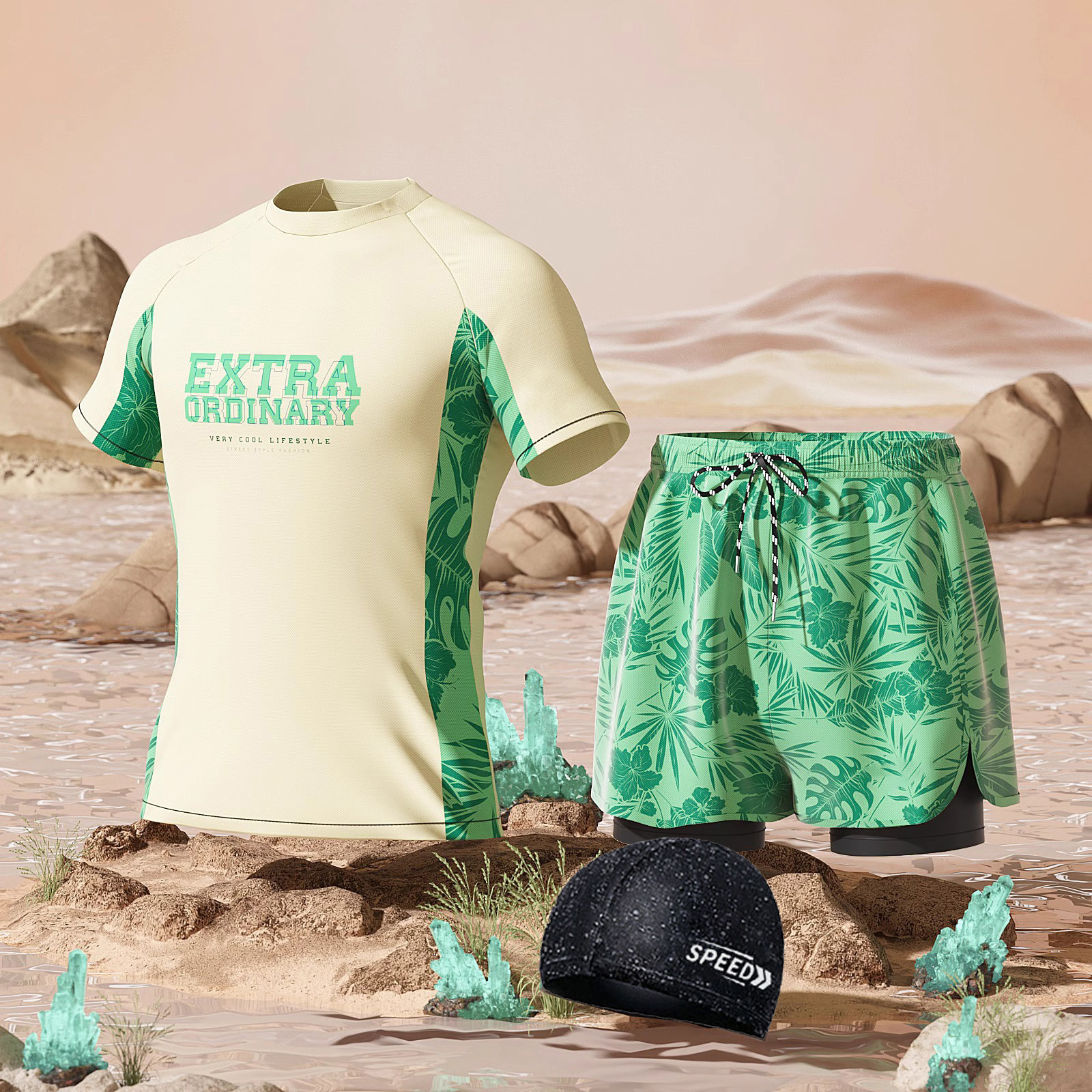 • 베이지색 꽃무늬 슈트 + 수영모