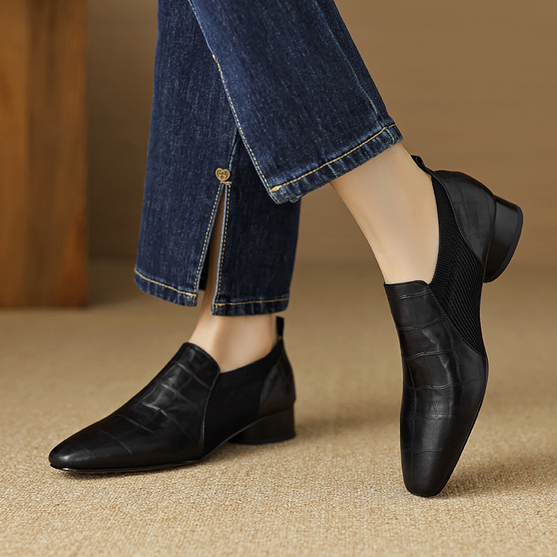 두꺼운 힐 중간 발 뒤꿈치 사각형 발가락 신발 부드러운 가죽 부드러운 바닥 양모 니트 스티칭 양가죽 딥 스퀘어 발가락 가죽 신발스토어 가기