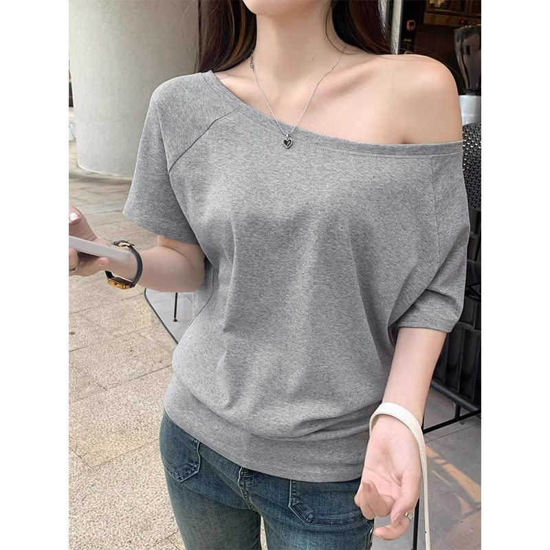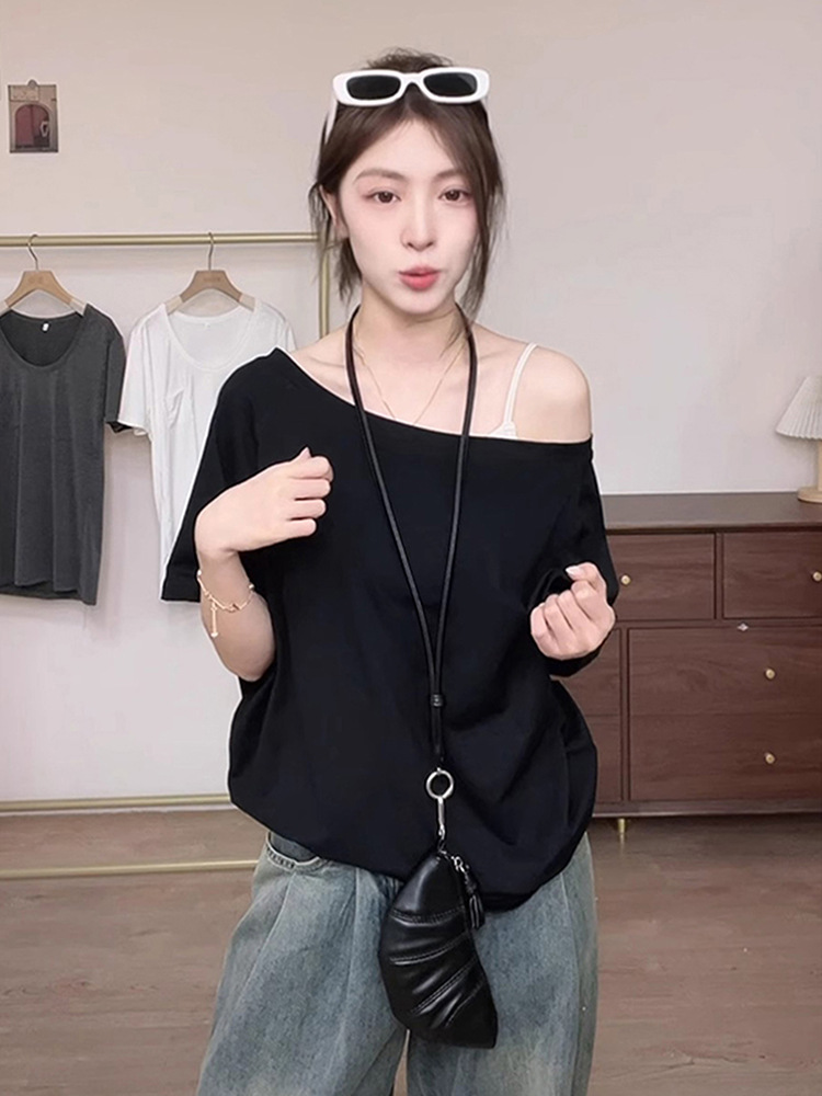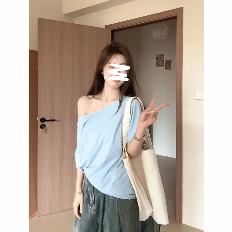 디자인 센스 경사 어깨 반팔 티셔츠 여성의 2024 년 새로운 여름 세련된 어깨 셔츠 퓨어 코튼 숄더 탑 Ins