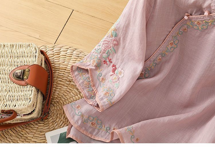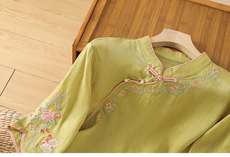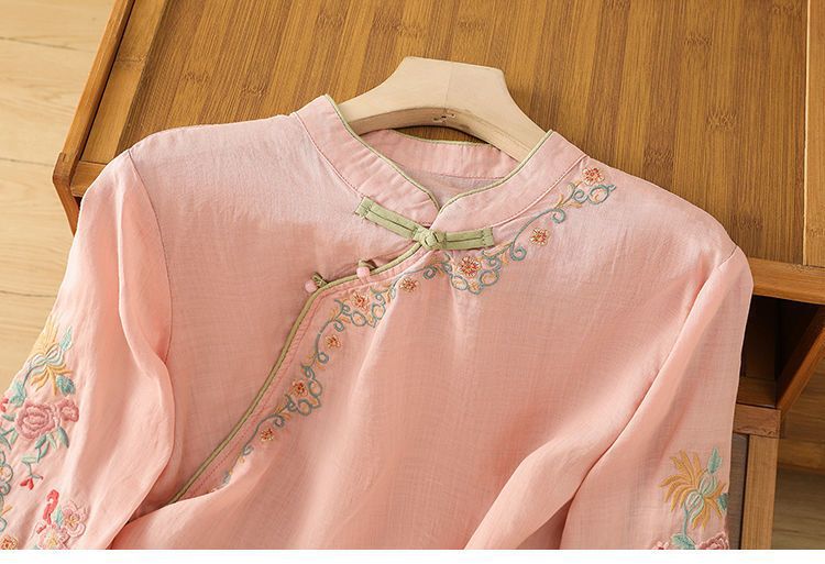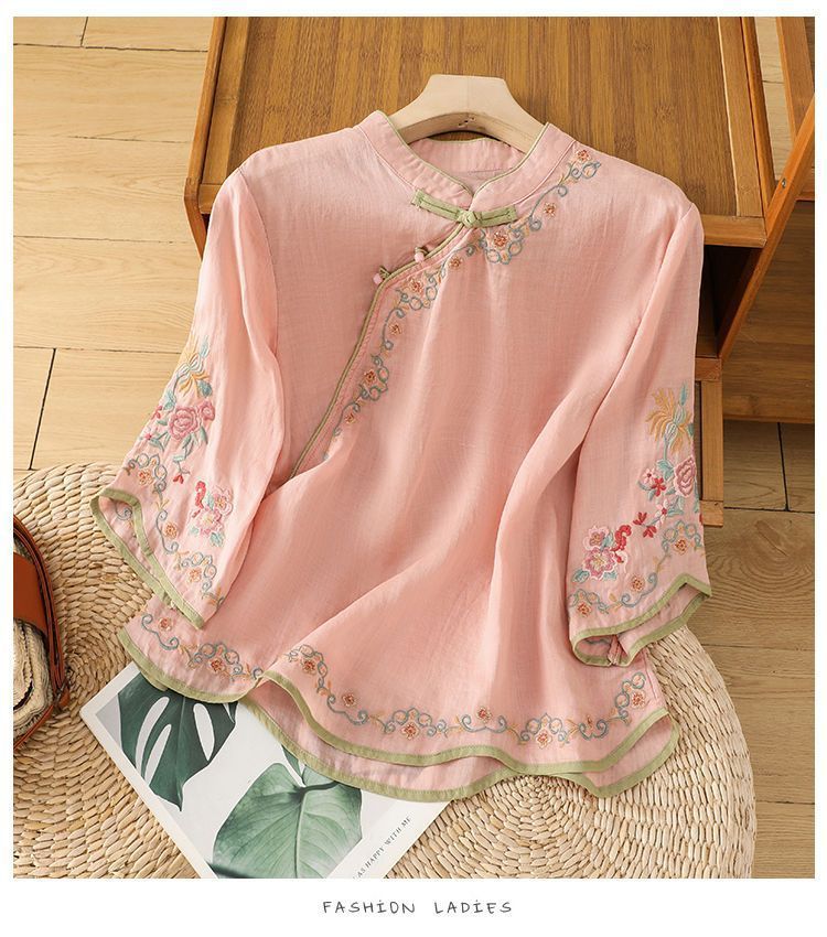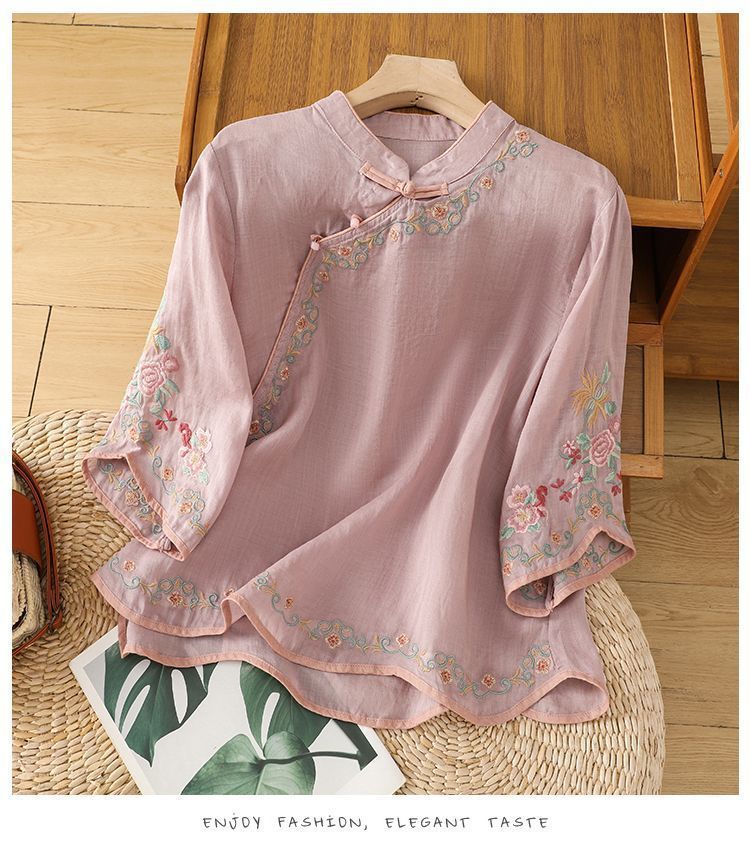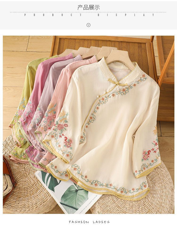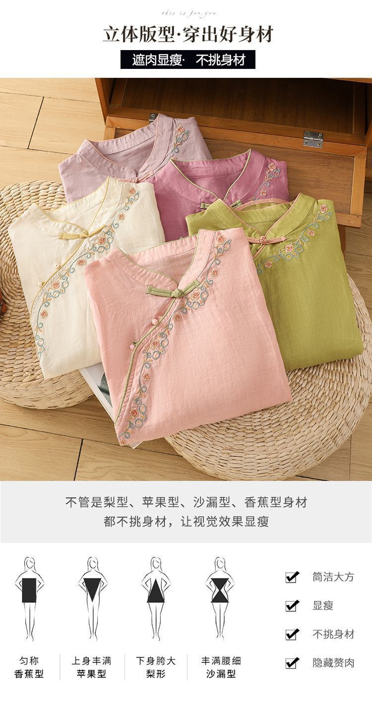 봄 가을 문예 복고풍 자수 면마 상의 여성용 버튼 슬랜트 카라 7부 소매 신중국풍 슬림핏 셔츠스토어 가기