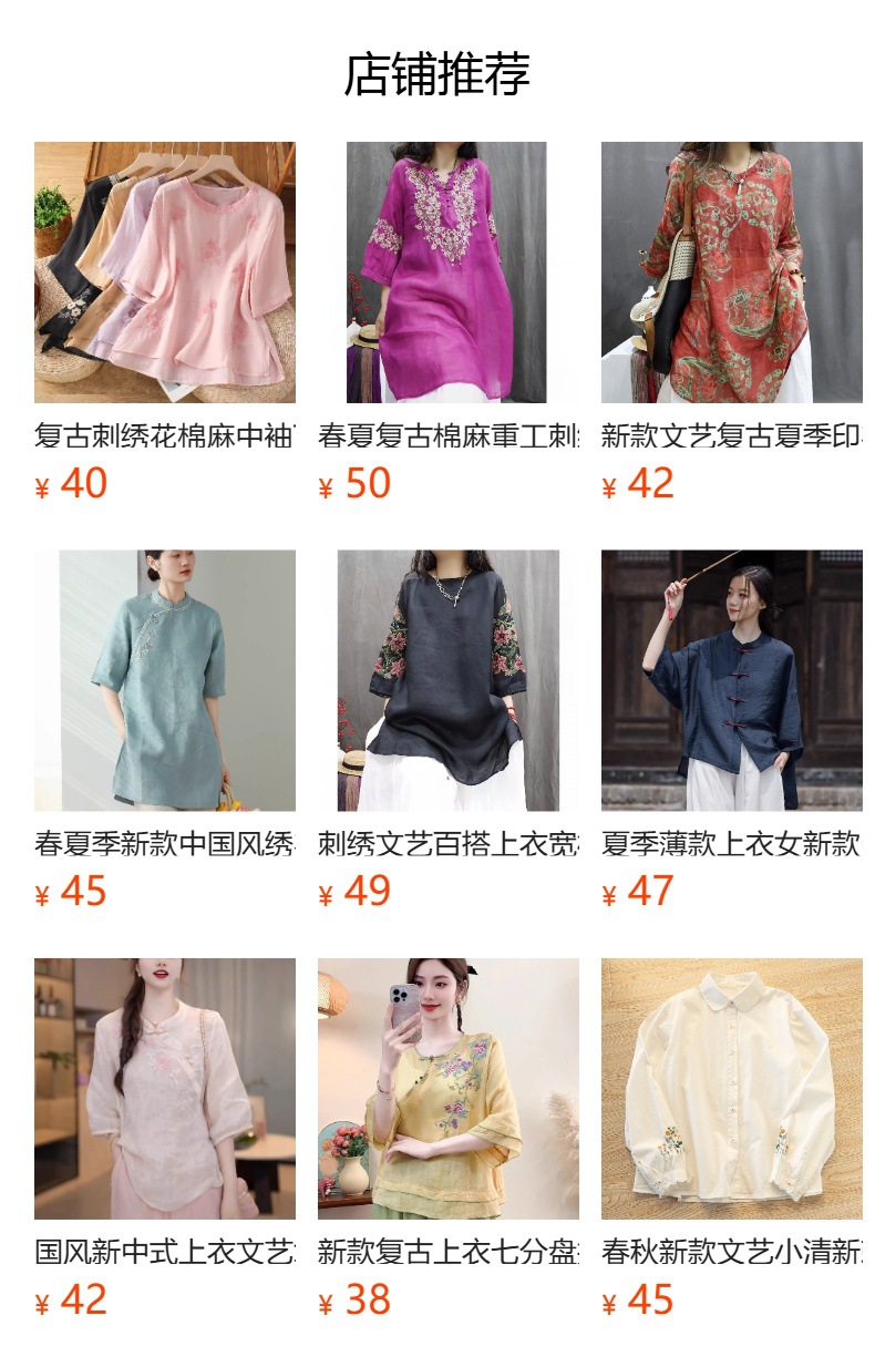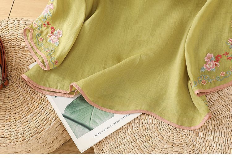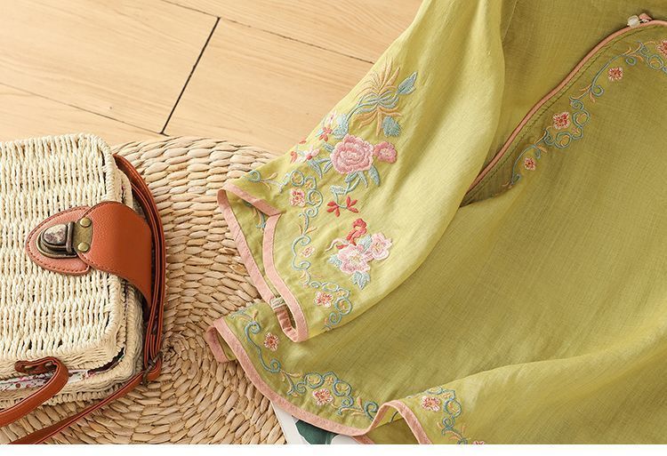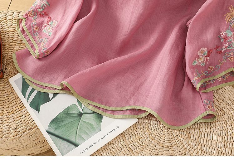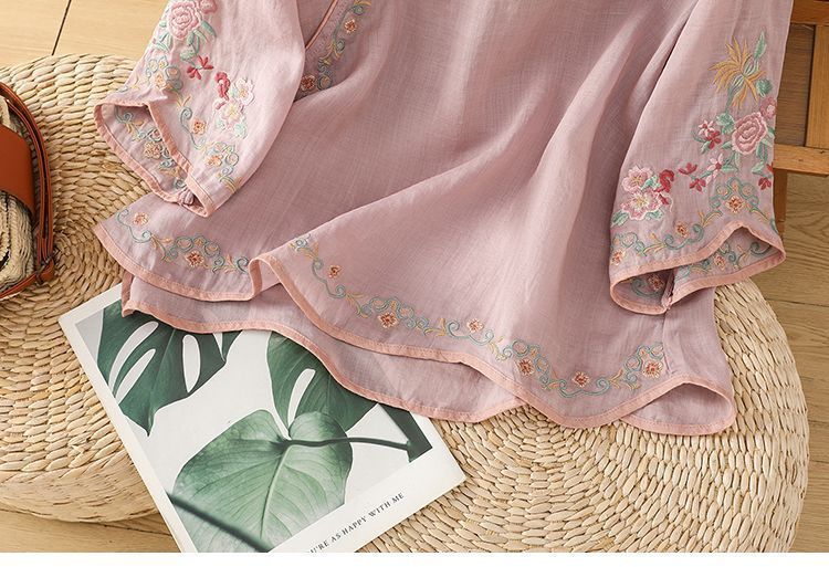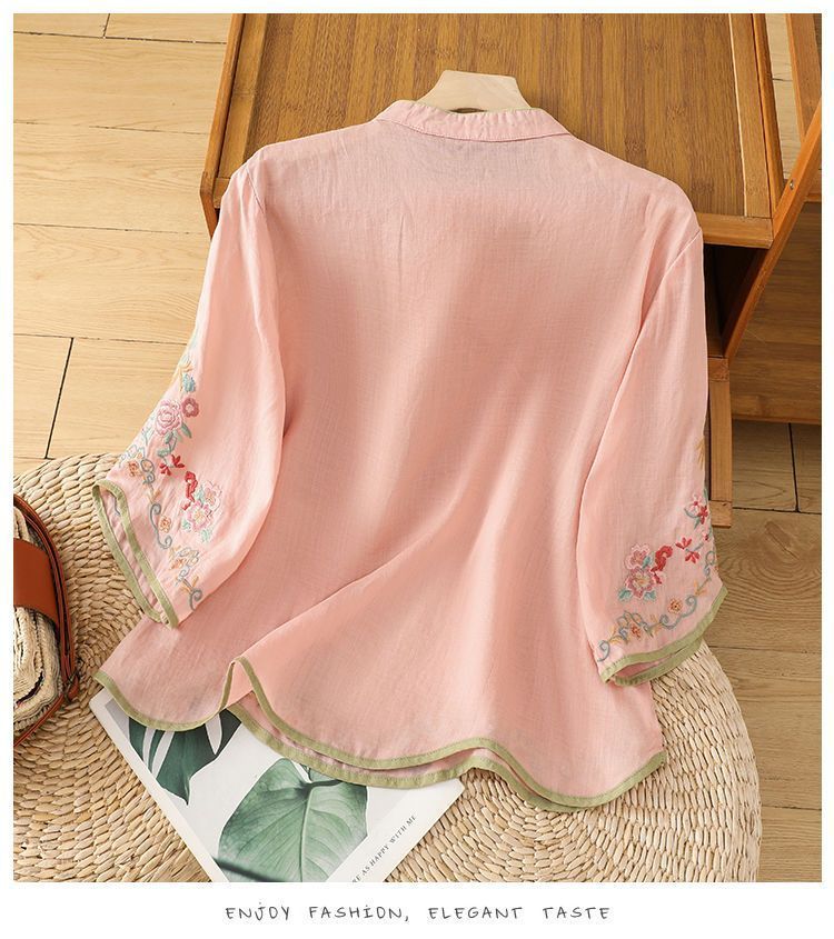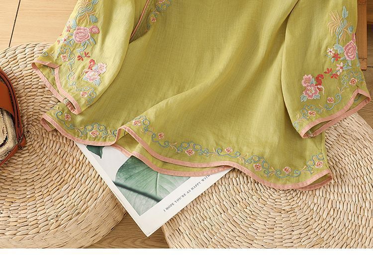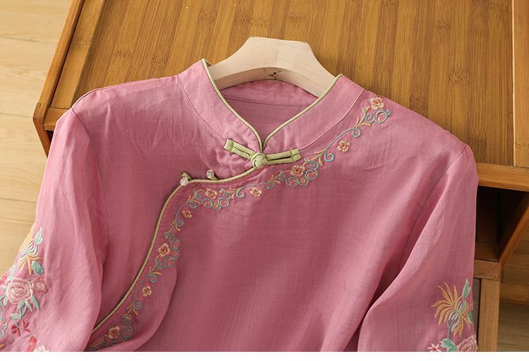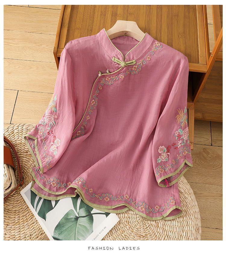 봄 가을 문예 복고풍 자수 면마 상의 여성용 버튼 슬랜트 카라 7부 소매 신중국풍 슬림핏 셔츠스토어 가기