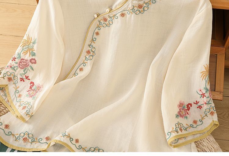 봄 가을 문예 복고풍 자수 면마 상의 여성용 버튼 슬랜트 카라 7부 소매 신중국풍 슬림핏 셔츠