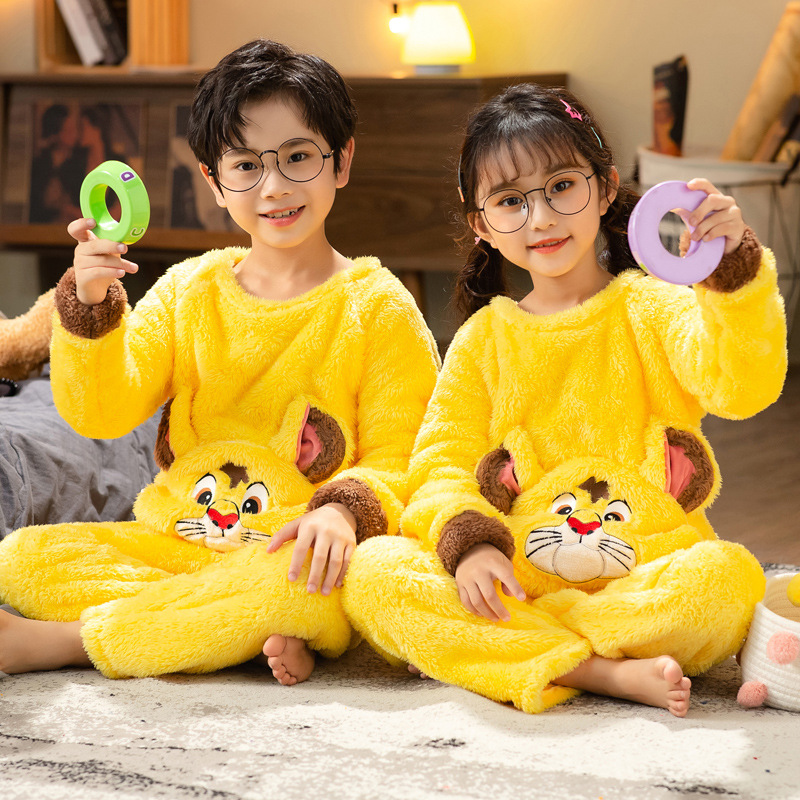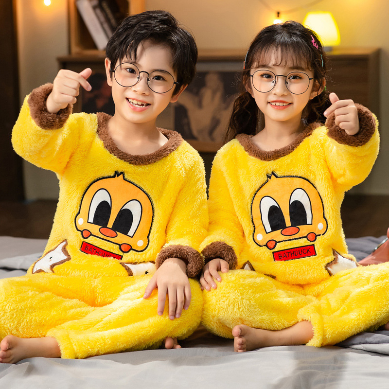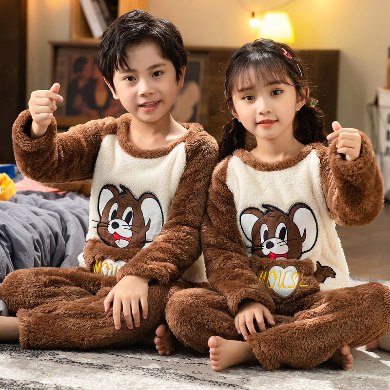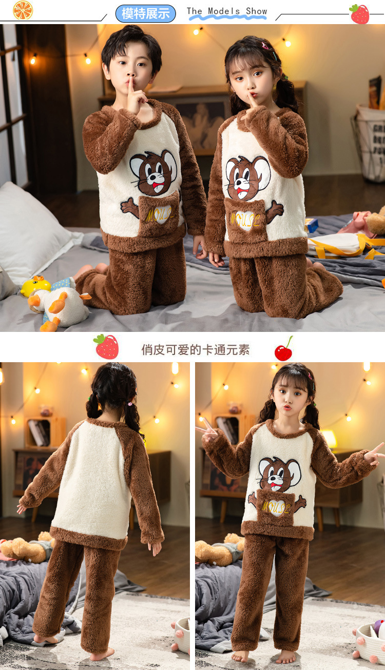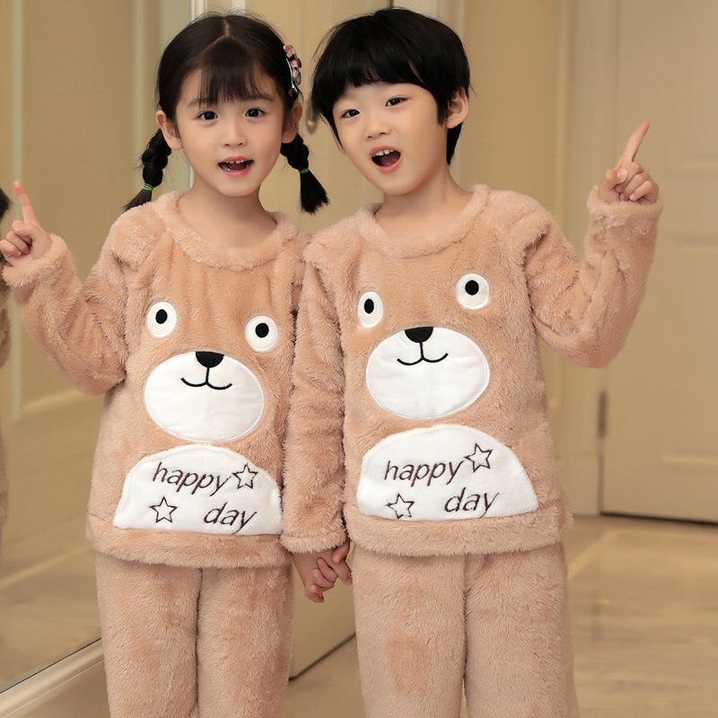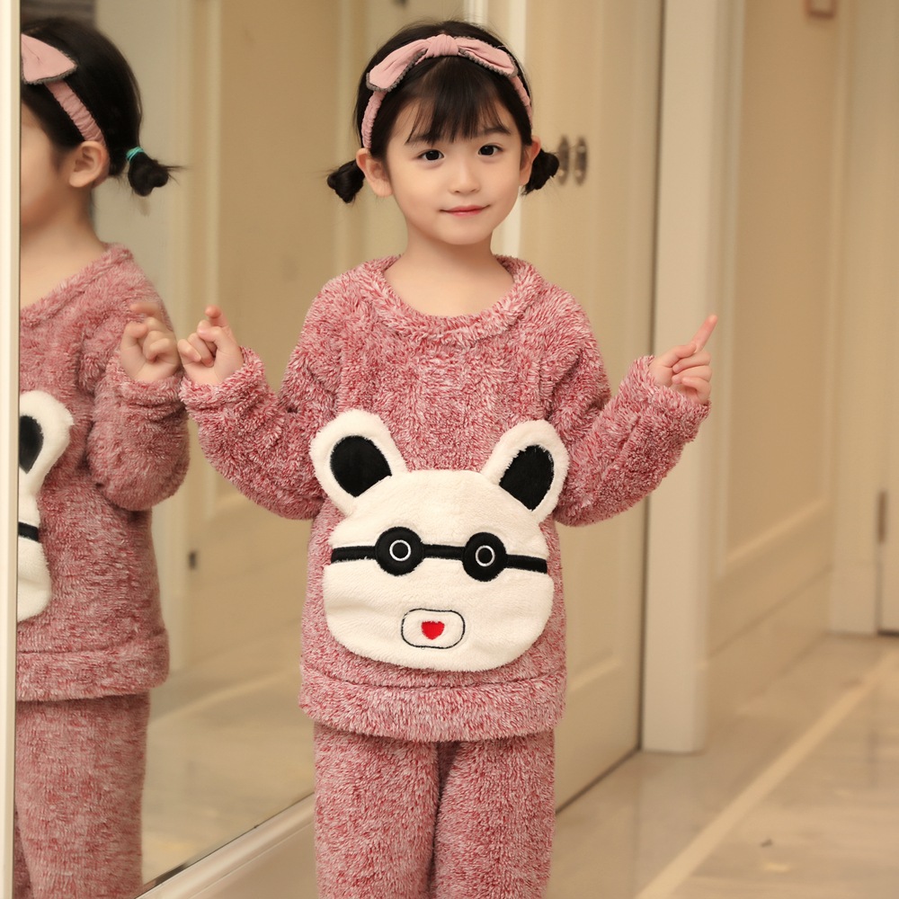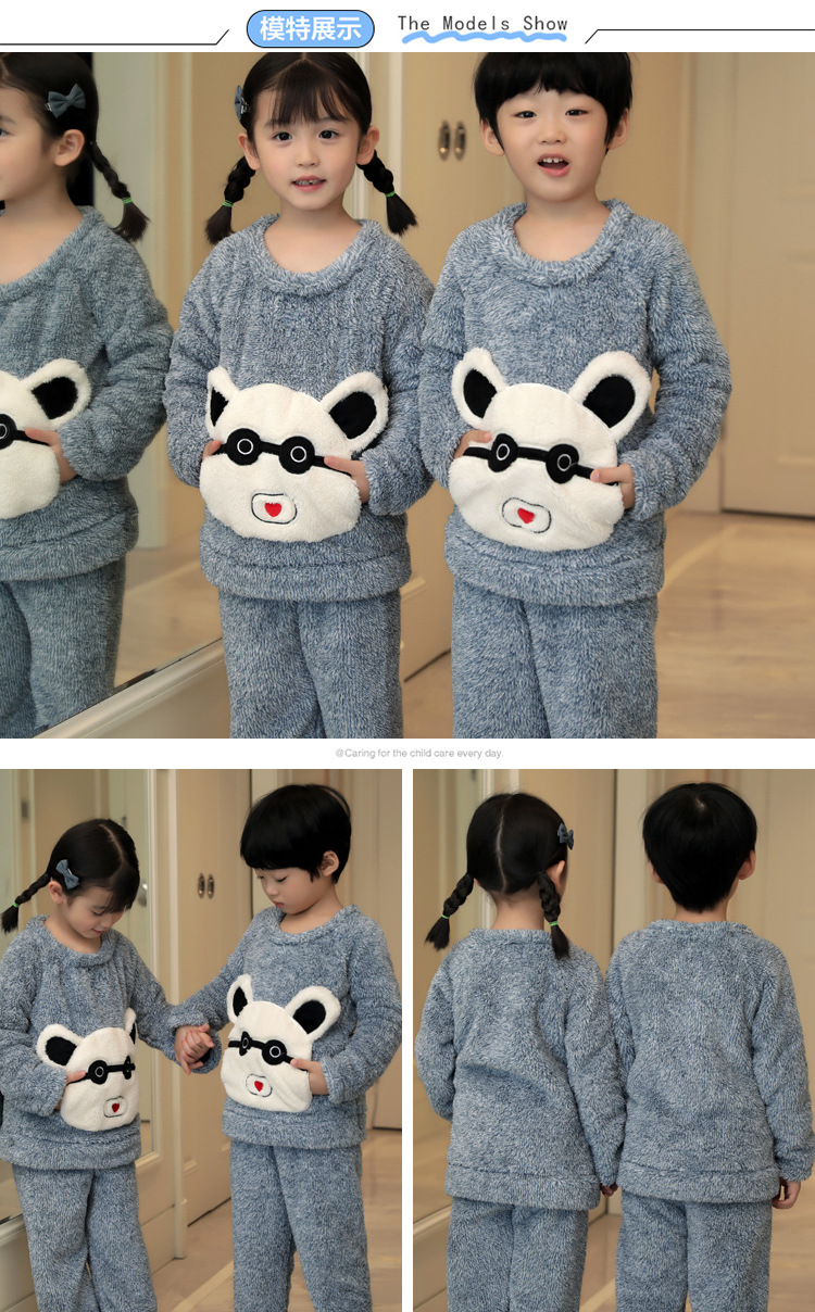 가을과 겨울 따뜻한 어린이 플란넬 파자마 세트 산호 양털 홈 옷 단색 긴 머리 두꺼운 소년과 소녀스토어 가기