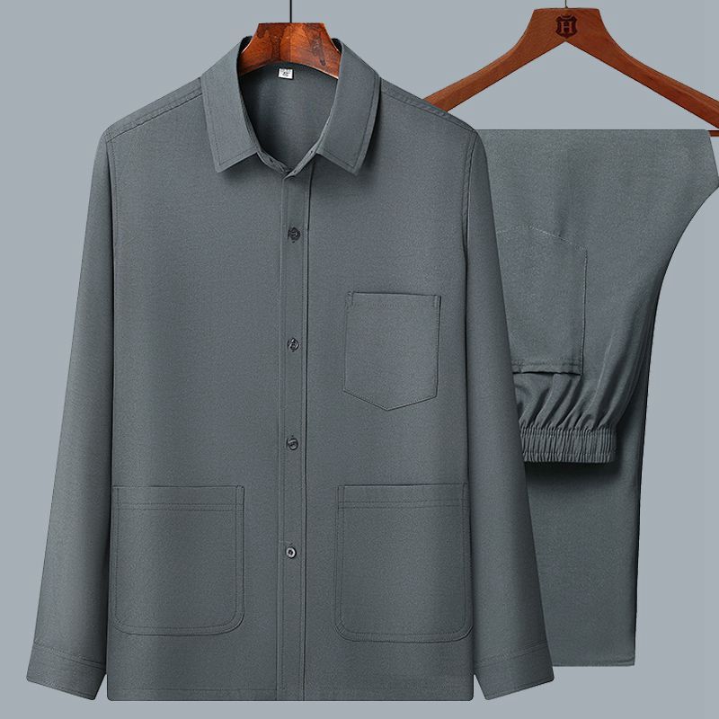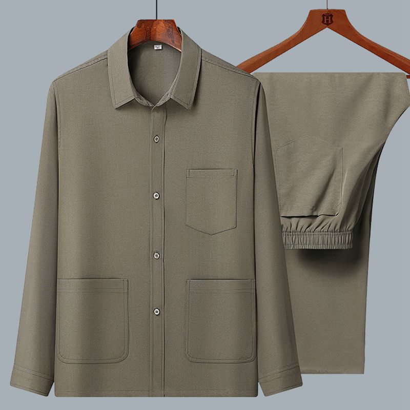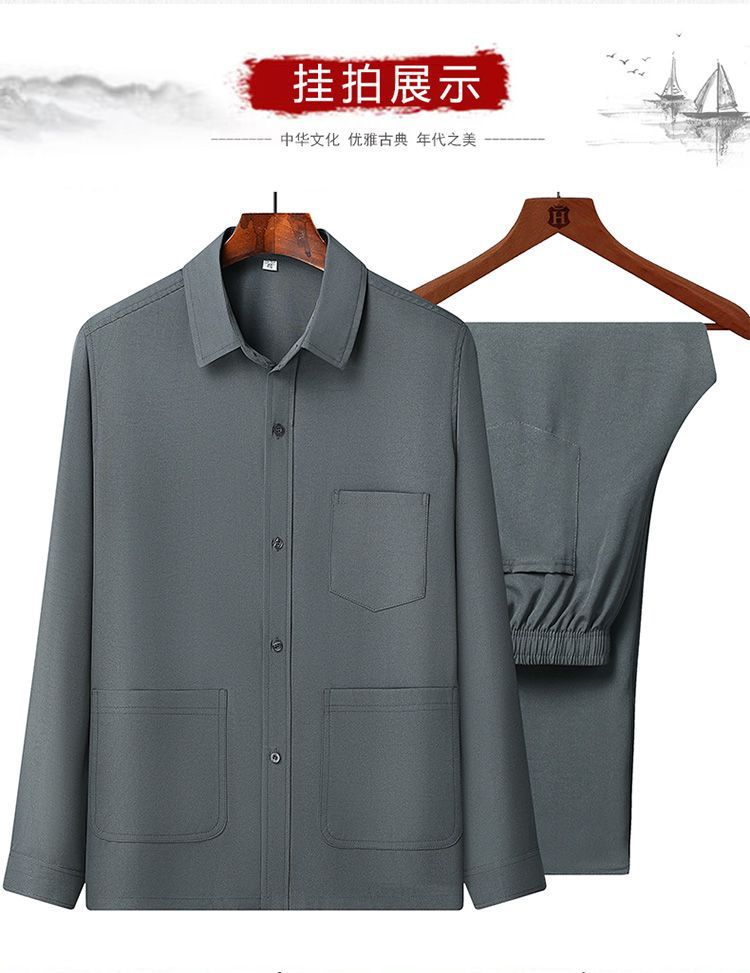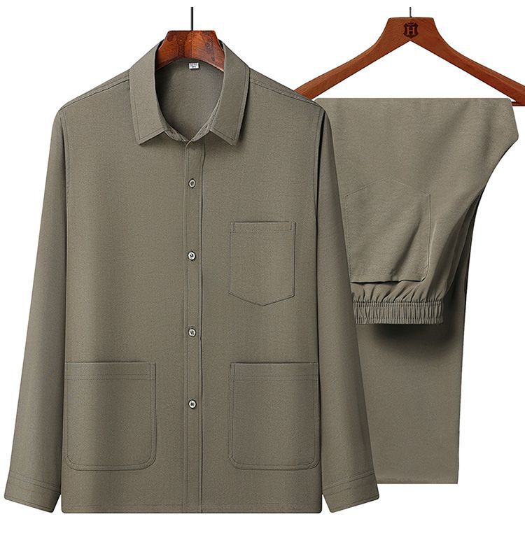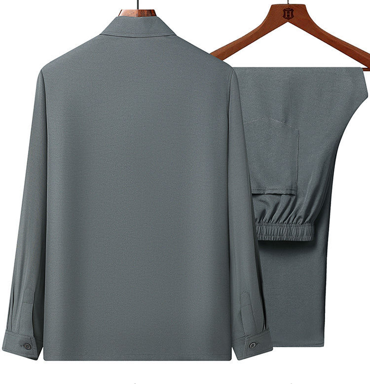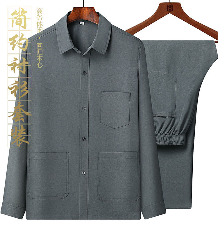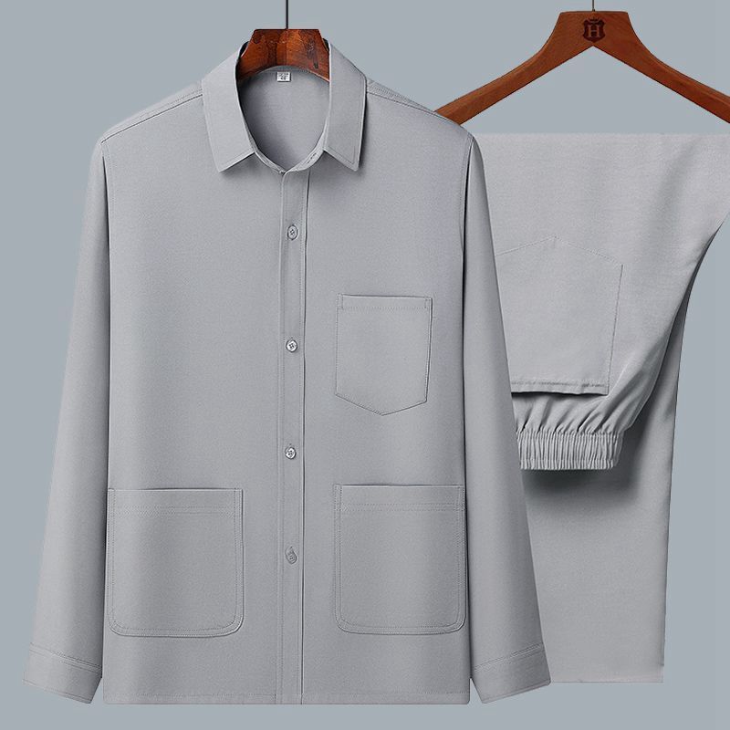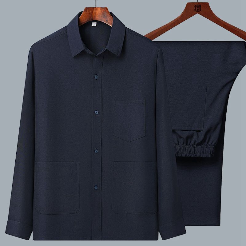 중년 및 노인을위한 아이스 실크 셔츠 남자 긴팔 세트 여름 플러스 사이즈 셔츠 아빠의 여름 옷 할아버지 노인 캐주얼 옷스토어 가기