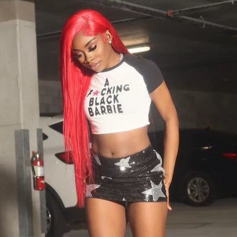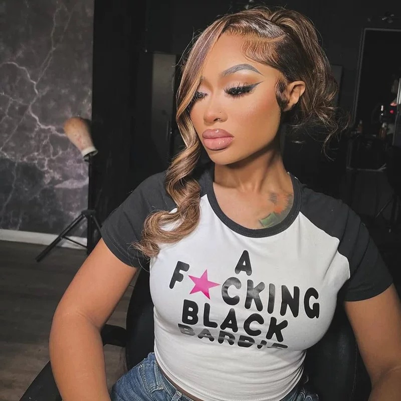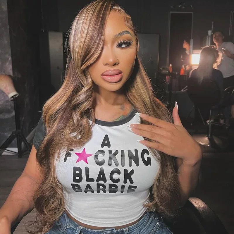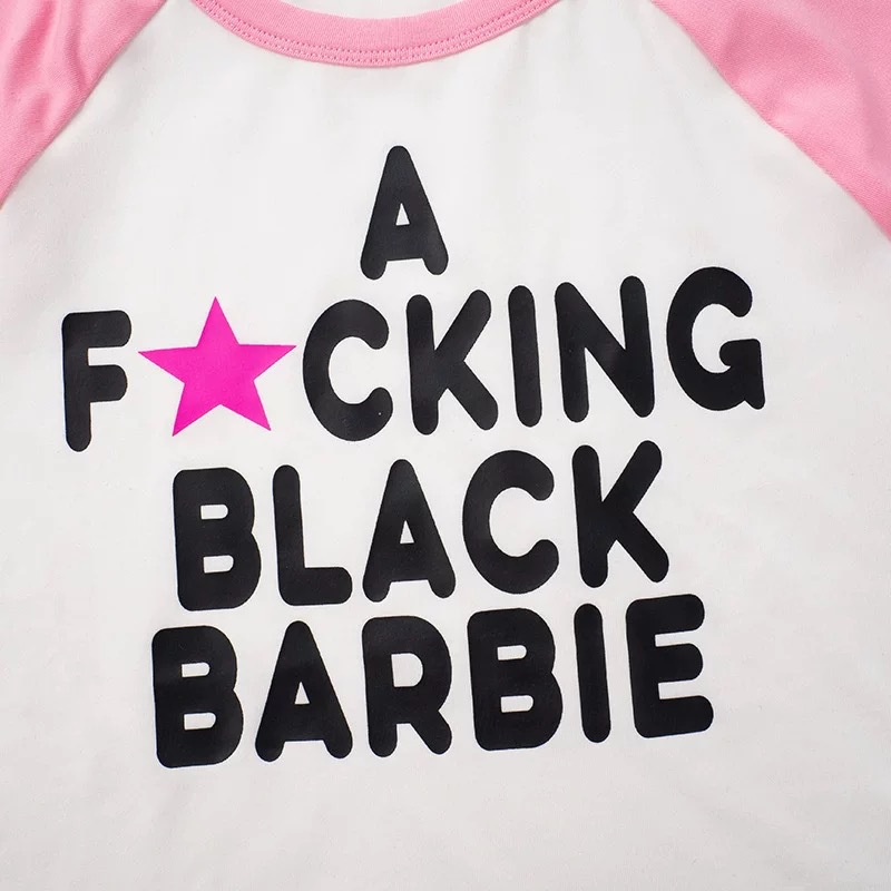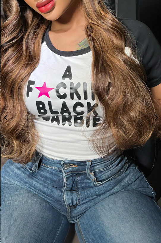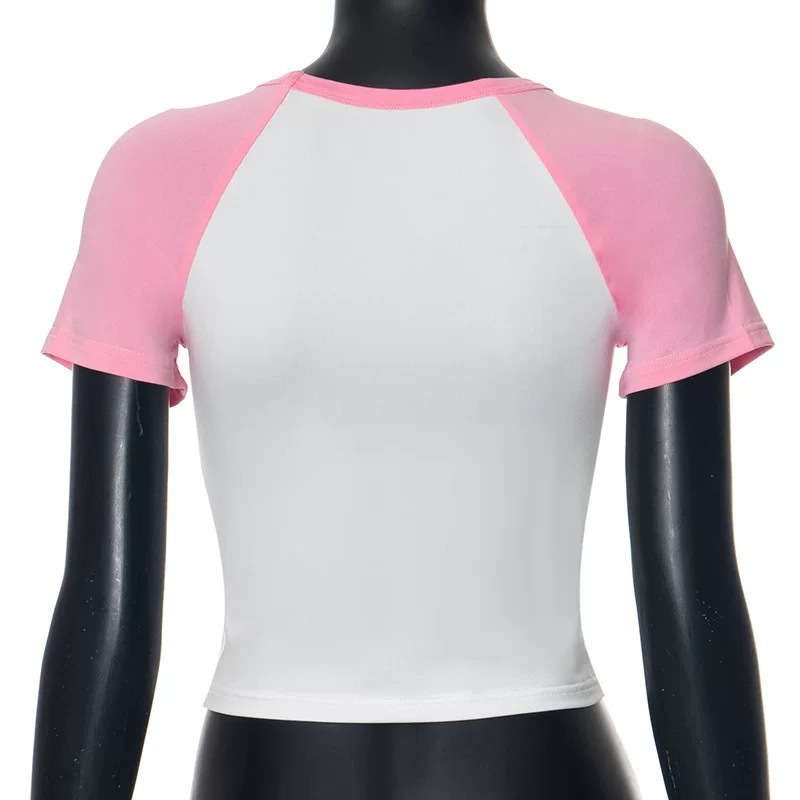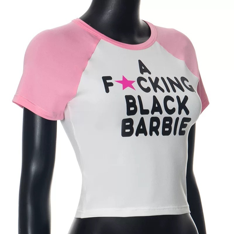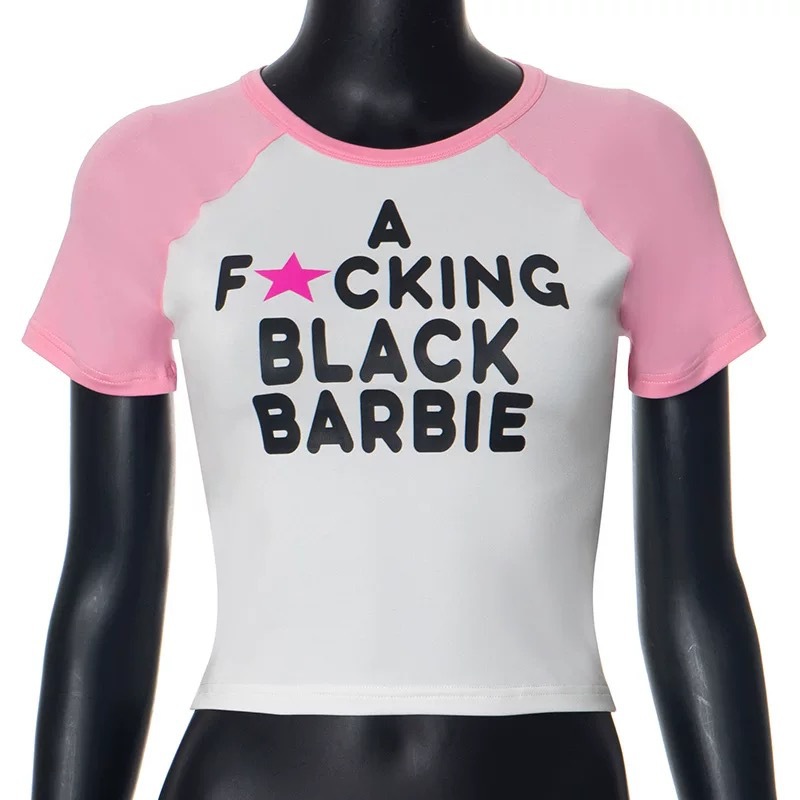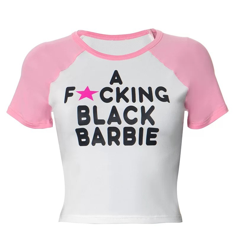 BLACK BARBIE 여성의 여름 새로운 대비 컬러 바느질 편지 인쇄 라운드 넥 짧은 소매 배꼽 짧은 여성용 티셔츠